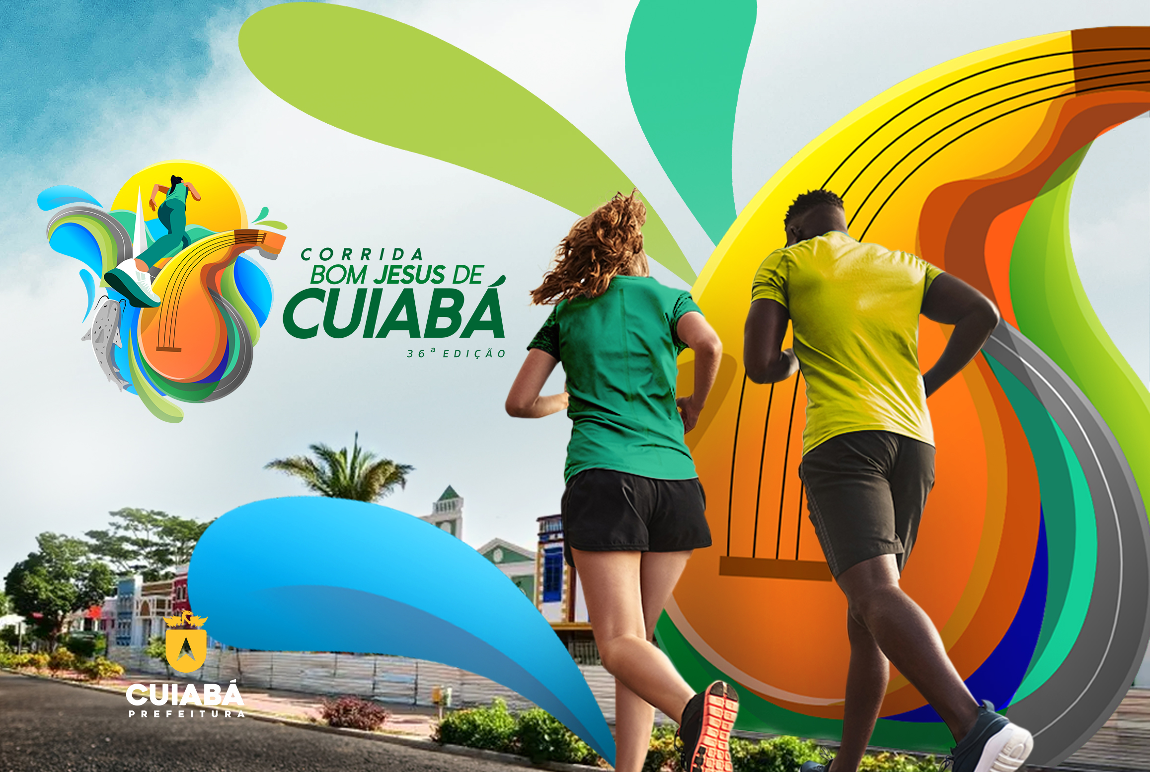 A imagem apresenta uma composição vibrante e dinâmica, promovendo a Corrida Bom Jesus de Cuiabá – 36ª edição. No primeiro plano, há dois corredores vistos de costas. Ao fundo, está uma paisagem da Orla do Porto de Cuiabá. O céu está claro, com tons suaves de azul e branco.
