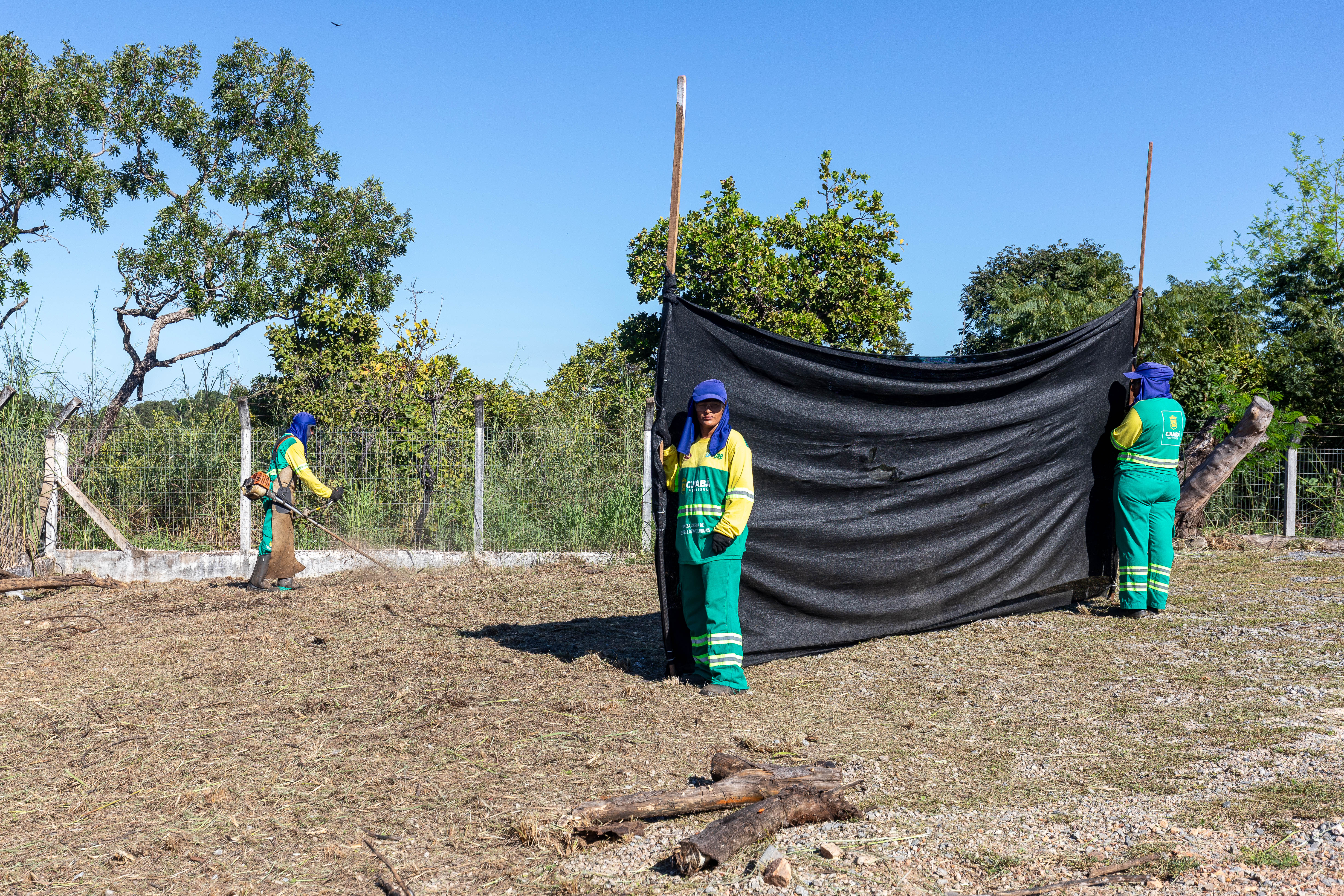 A imagem mostra colaboradores da Limpurb em força-tarefa de limpeza na Clínica da Família no bairro CPA I. Os funcionários usam uniforme na cor verde, e estão munidos de Equipamento de Proteção Individual (EPIs), eles carregam uma big bag com vegetação recolhida da atividade.
