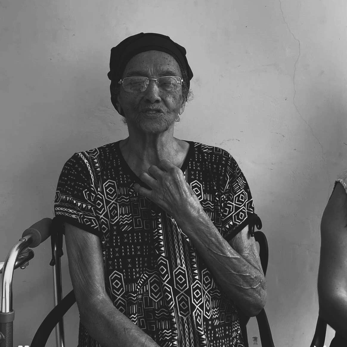 A imagem mostra um retrato em preto e branco da dona Jacinta Martins Santana. Ela esta sentada em uma cadeira e usa um lenço na cabeça.
