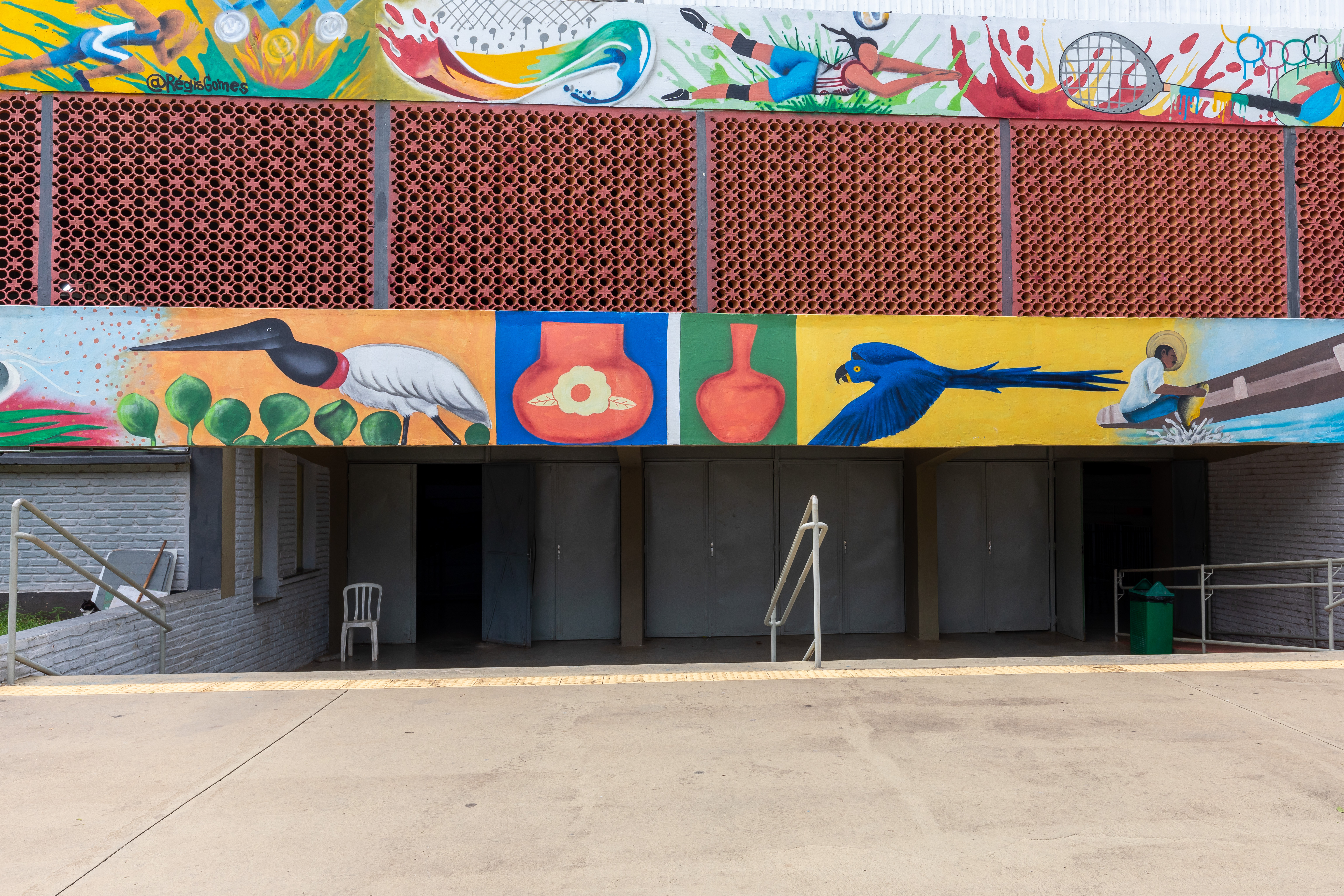 A foto mostra a fachada do Ginásio Poliesportivo Dom Aquino, com um mural colorido que retrata elementos da fauna e flora brasileiras. O mural inclui a ilustração de um tuiuiú, vasos cerâmicos e outros elementos culturais.
