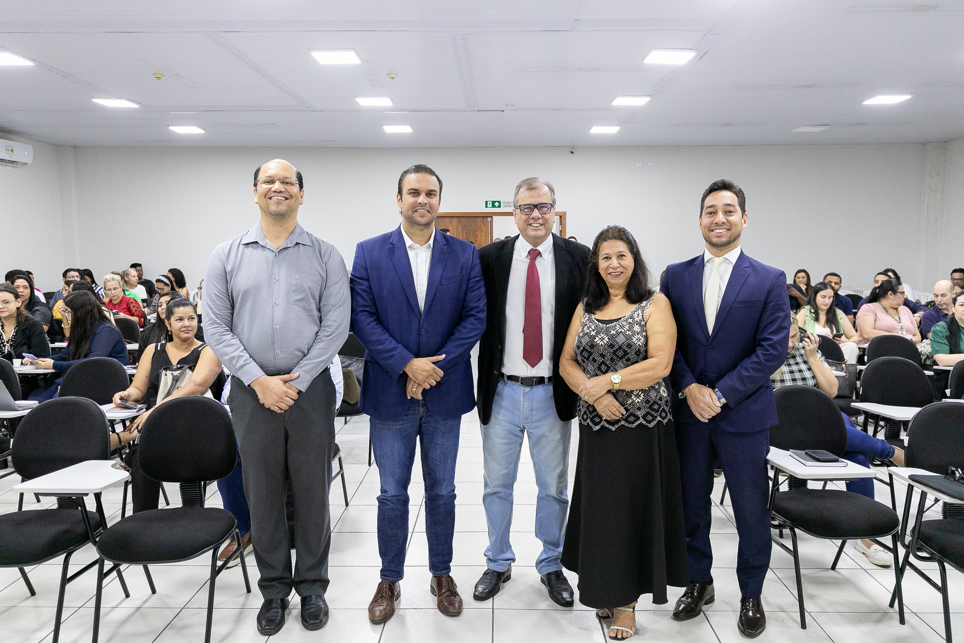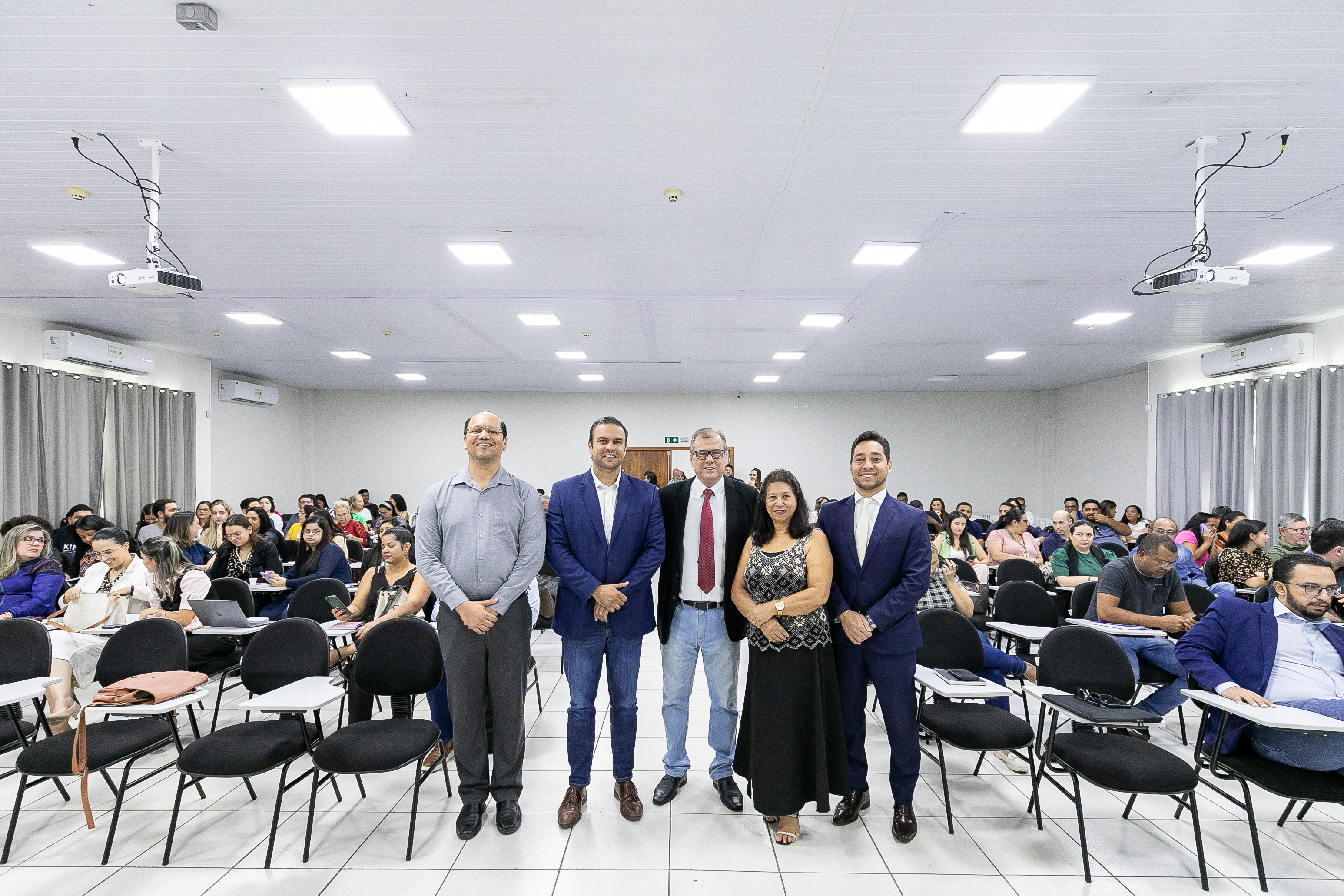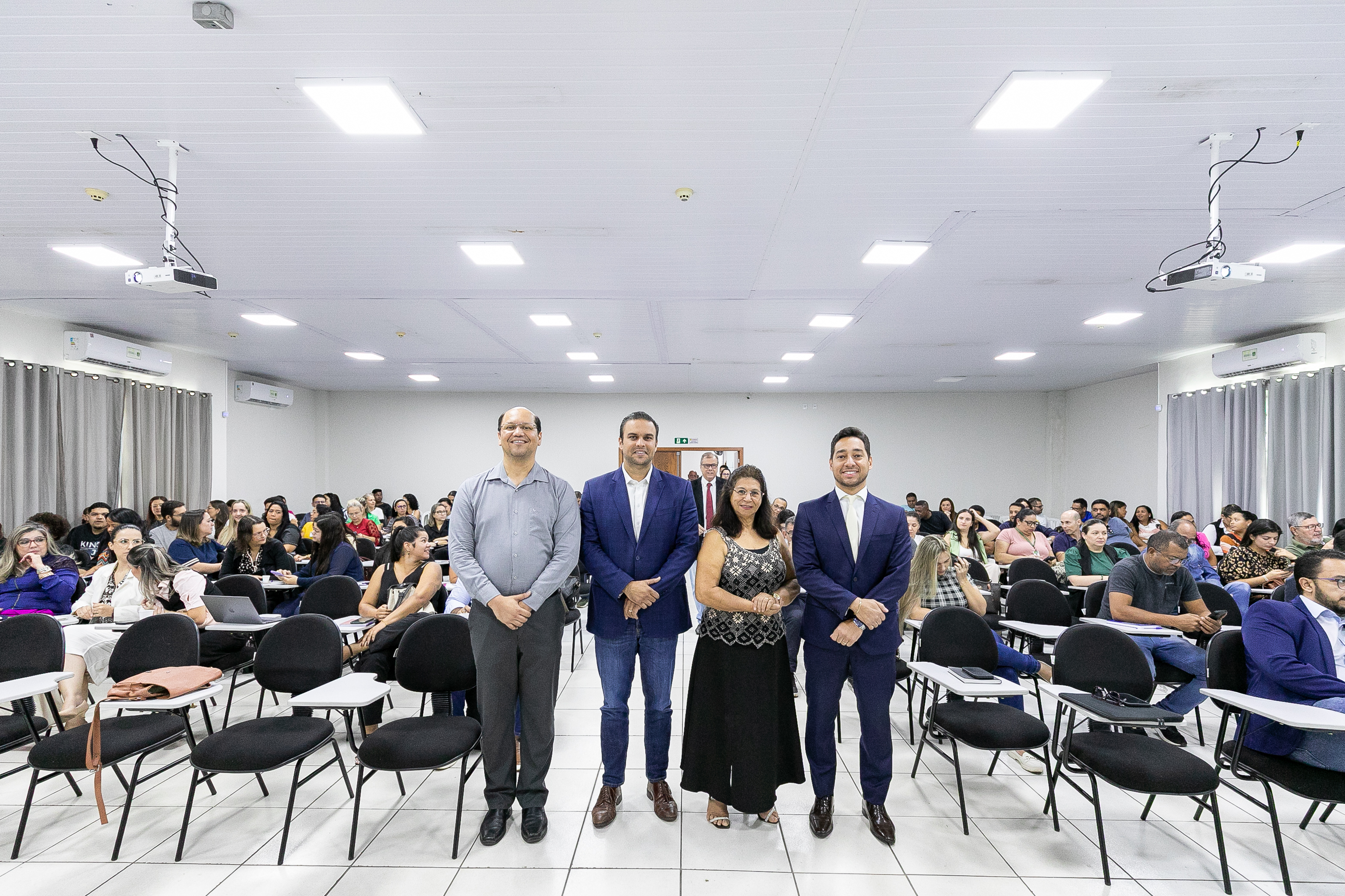 A foto mostra dezenas de servidores sentados em um auditório, ouvindo uma palestra.