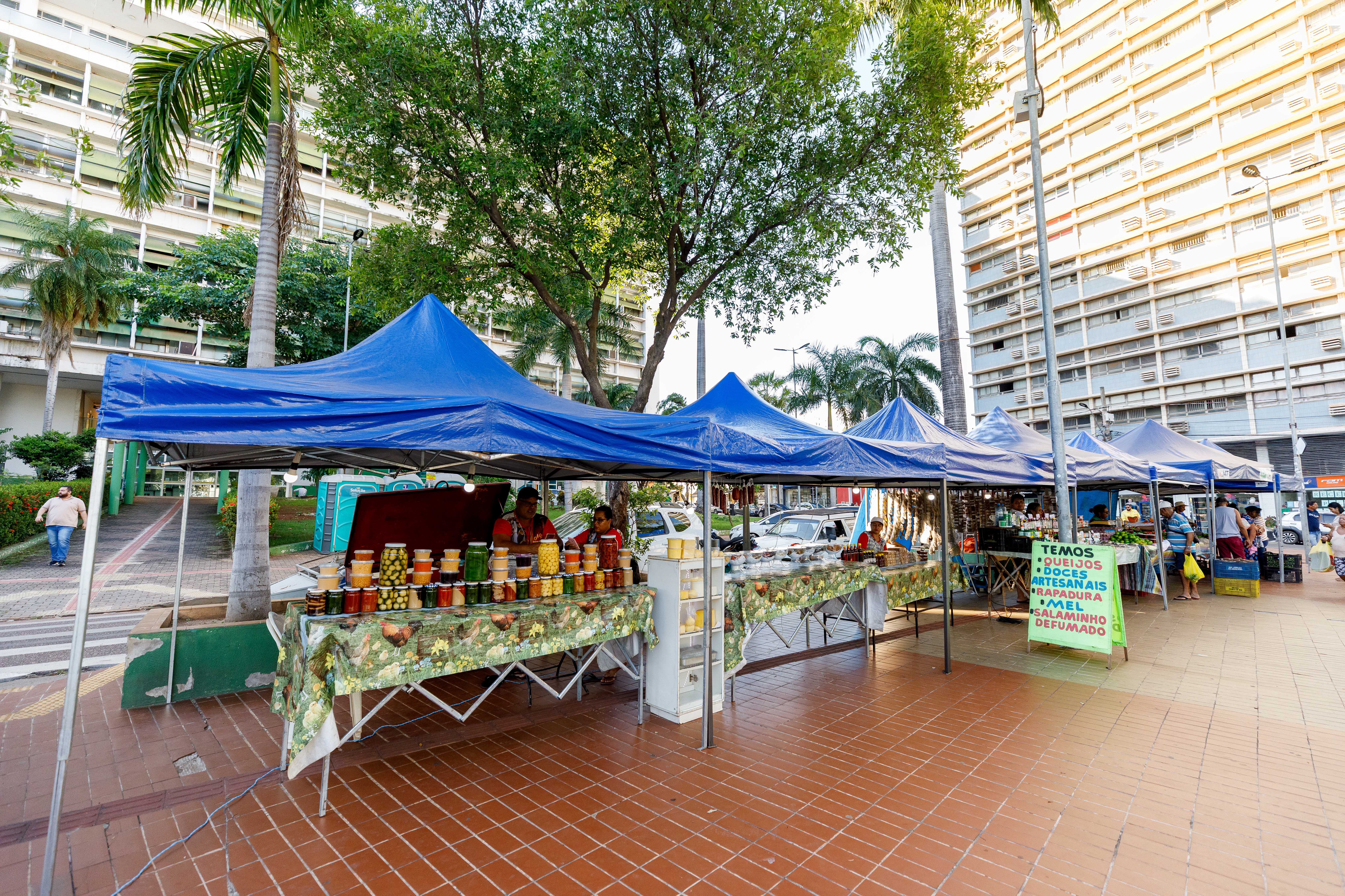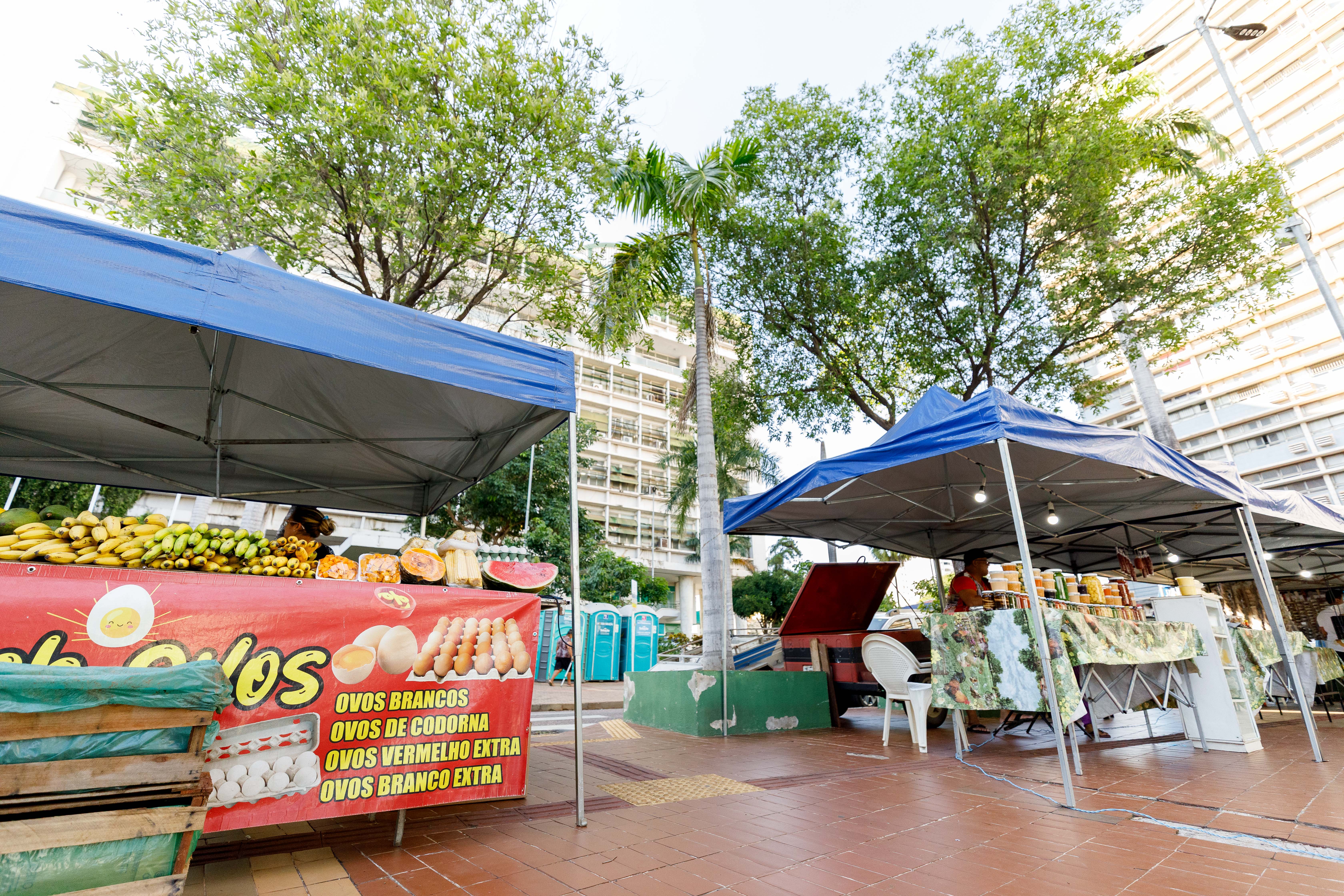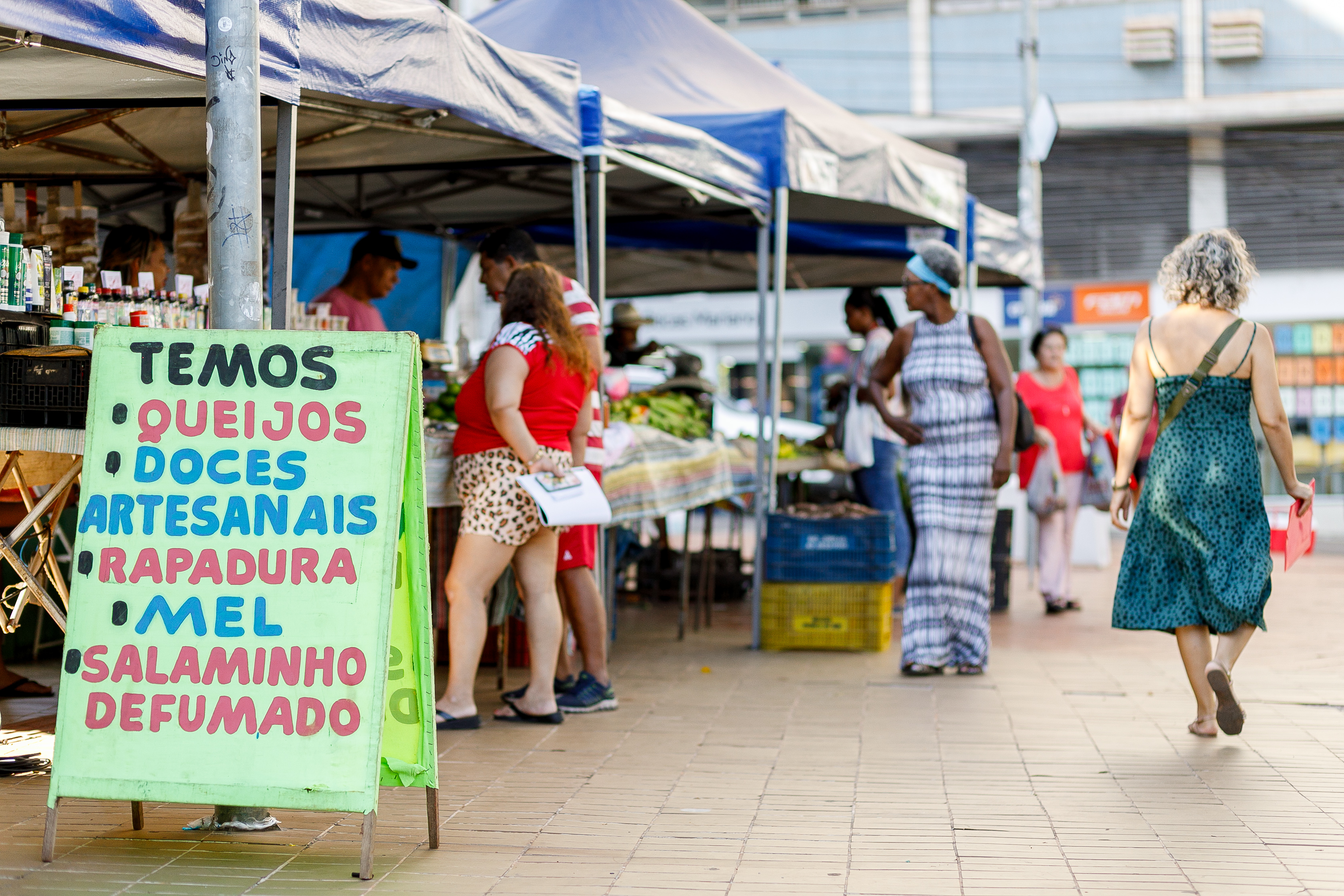 A imagem mostra um ambiente de feira na Praça Alencastro, com barracas expondo diversos produtos comercializados no local.