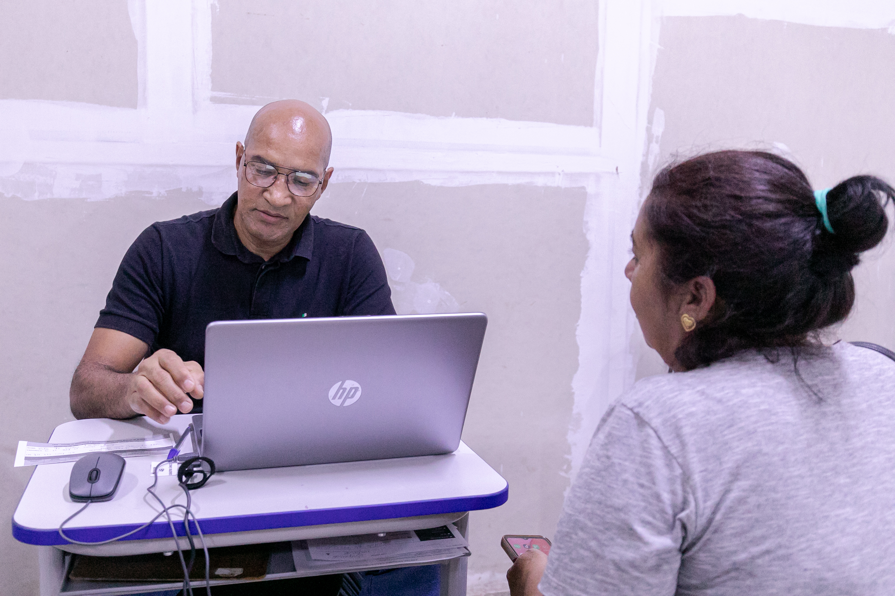 A imagem registra o momento de atendimento durante o 1º Mutirão do CadÚnico, realizado no CRAS Getúlio Vargas, em Cuiabá.