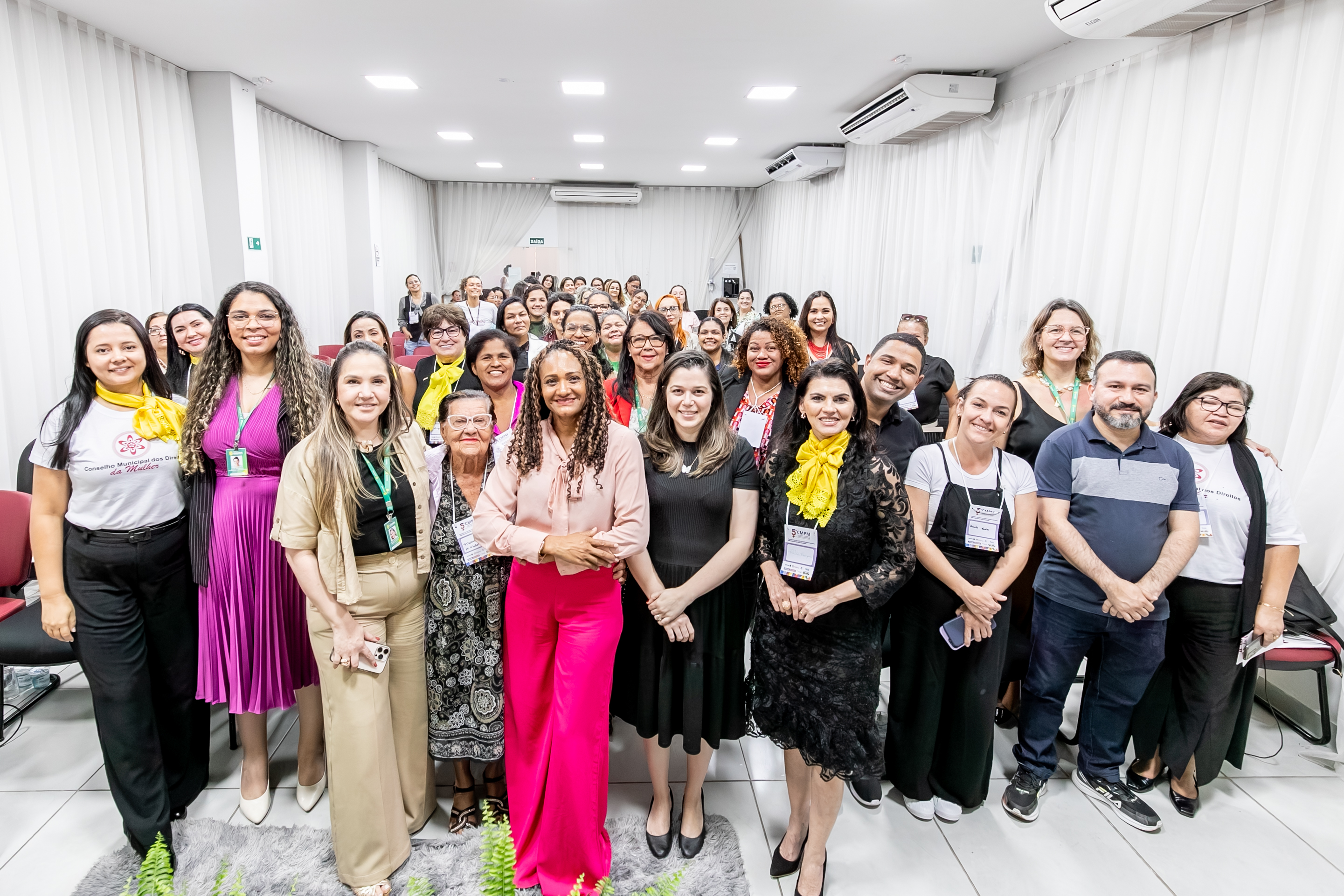 A imagem mostra as participantes da 5ª Conferência Municipal de Políticas para as Mulheres reunidas para fotografia no final do evento.