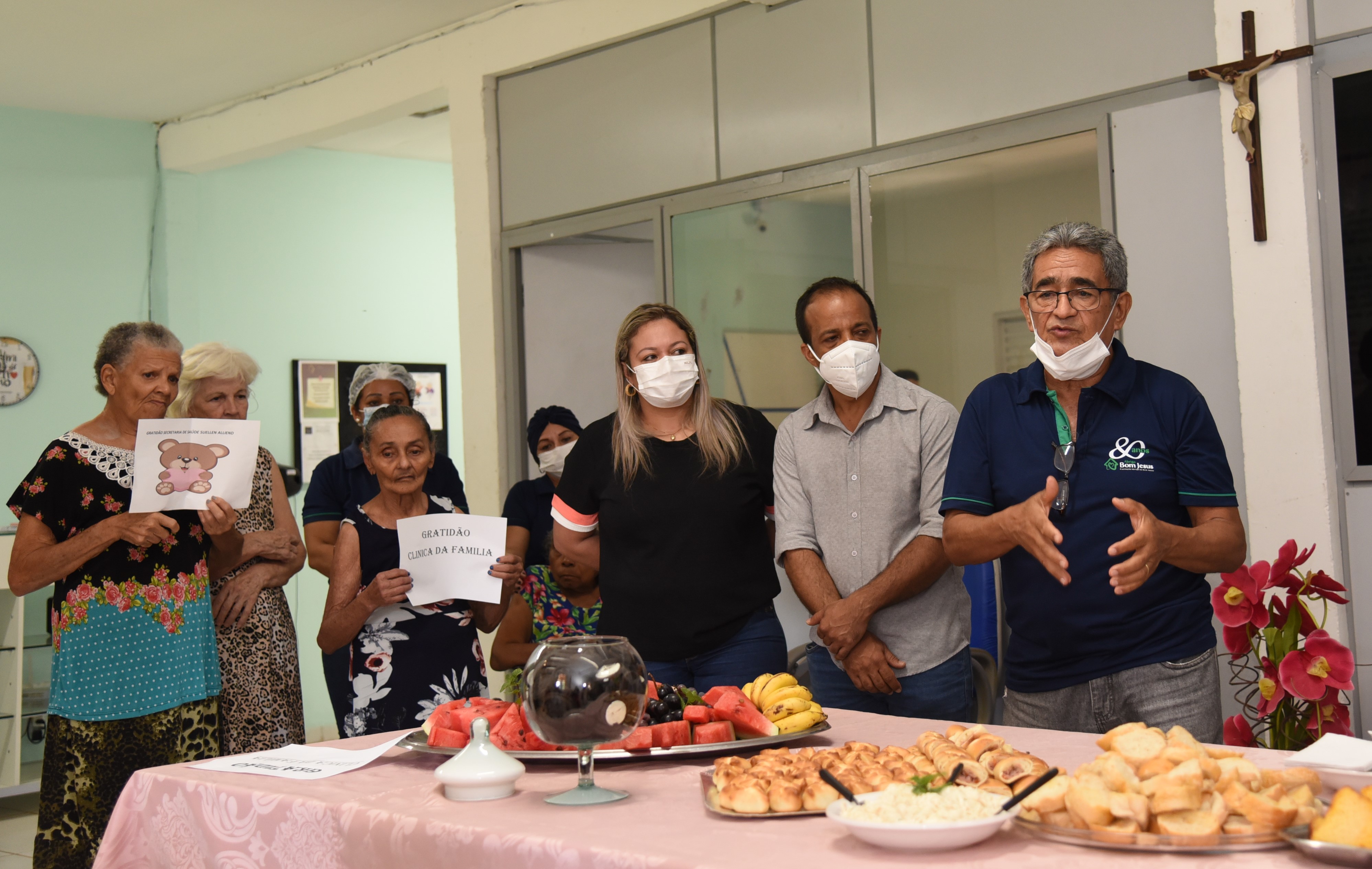 O presidente do Abrigo Bom Jesus, José Duarte, afirmou que apesar de todas as dificuldades, é preciso agradecer a Deus pelo fato de os idosos terem se mantido seguros durante toda a pandemia e o surto ter ocorrido em um momento em que existe mais informações, mecanismos de combate e leitos disponíveis. “A pandemia trouxe um prejuízo muito grande, mas também trouxe um aprendizado muito grande porque todos nós aprendemos muito com a pandemia, com as perdas. Mesmo com tudo isso que aconteceu, a gente agradece a Deus porque não aconteceu no começo da pandemia, onde a experiência não era grande, onde os hospitais estavam lotados. Ficamos um ano e meio, graças a Deus, sem acontecer nada. Quando aconteceu, os hospitais já estavam com leitos de UTI sobrando, os médicos já sabiam o que fazer. Foi uma guerra, mas, graças a Deus, deu tudo certo com a equipe que nós temos, com o apoio de todos vocês, com o apoio da secretária, porque na hora eu liguei pra ela e o Gilson e a Cínica da Família estão sempre aqui com a gente. Secretária, eu queria que você levasse o nosso abraço à primeira-dama, que tem um carinho especial com a gente, ao nosso prefeito, aos secretários. Essa singela homenagem de toda a equipe é apenas uma forma de agradecimento porque pagar a gente não tem como pagar. Só obra divina que vai pagar por tudo o que vocês fizeram. Esta é uma homenagem simples, mas é de coração, é verdadeira. Muito obrigado”, declarou.