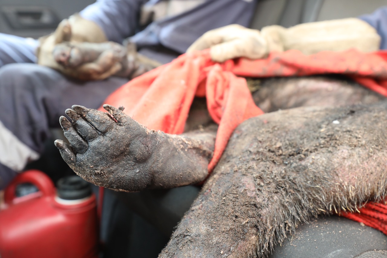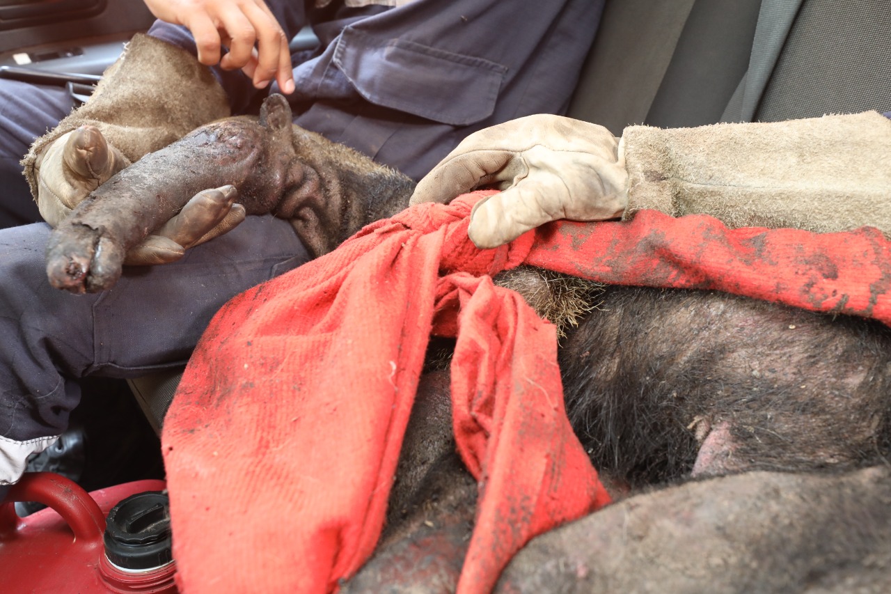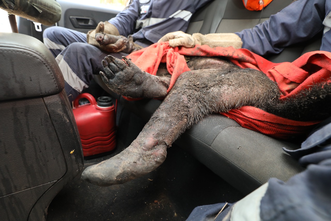 Agentes da Defesa Civil resgatam tamanduá-bandeira gravemente ferido em decorrência de queimadas