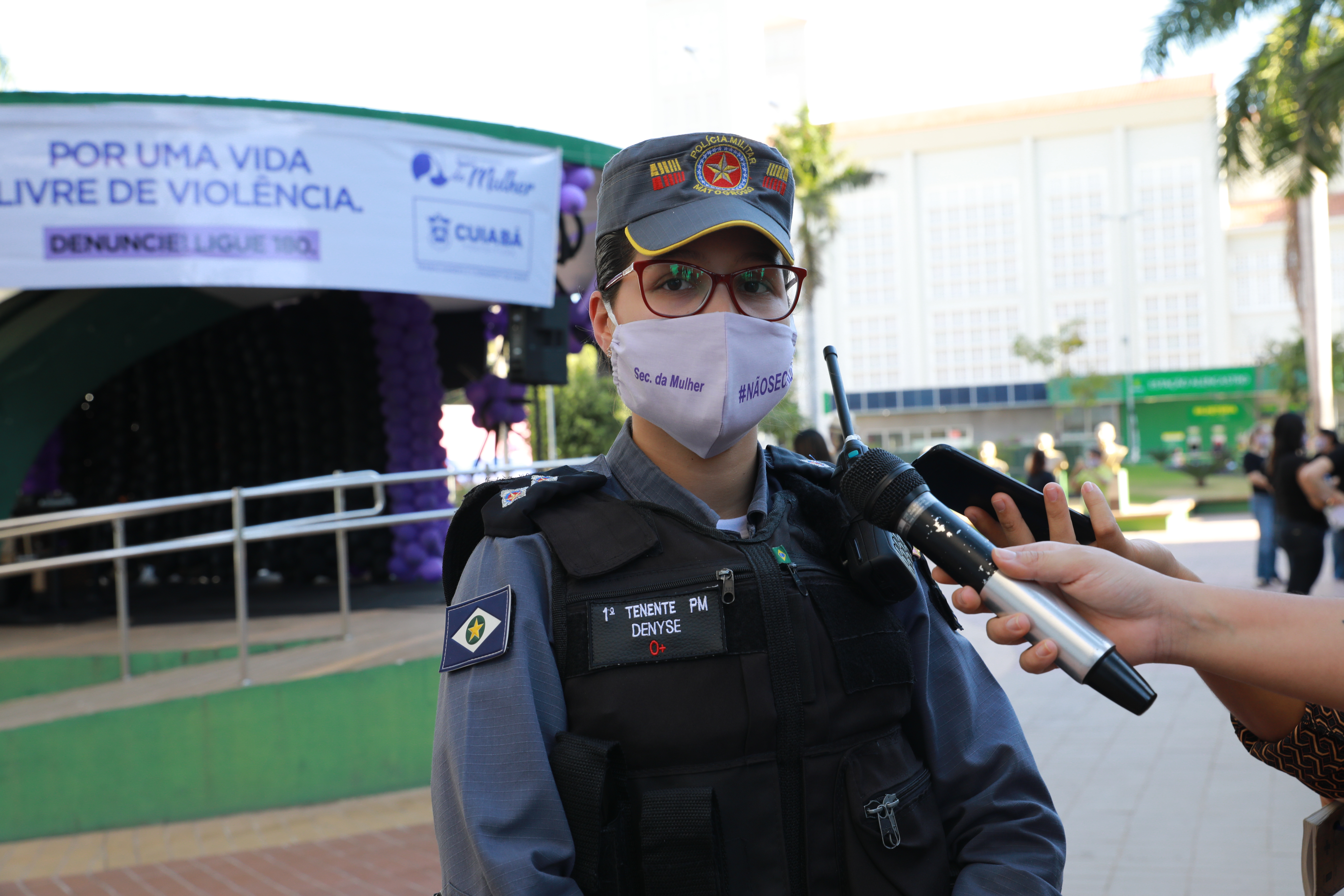 Coordenadora da Patrulha Maria da Penha do 1º Batalhão da Polícia Militar de Cuiabá, a 1ª Tenente Denyse Valadão destacou a honra que é fazer parte do Agosto Lilás, enquanto agente que está no dia a dia defendendo as mulheres vítimas de agressão por parte de seus companheiros. “É mito gratificante. Hoje é um dia que deve ser comemorado, diante de todos os avanços que nós tivemos até hoje pela proteção das vítimas de violência. É muito importante esse trabalho que está sendo feito hoje pela Prefeitura de Cuiabá, pela Secretaria da Mulher. E somos parceiros também. É importante todos estarem juntos nesse enfrentamento da violência doméstica”, enfatizou.