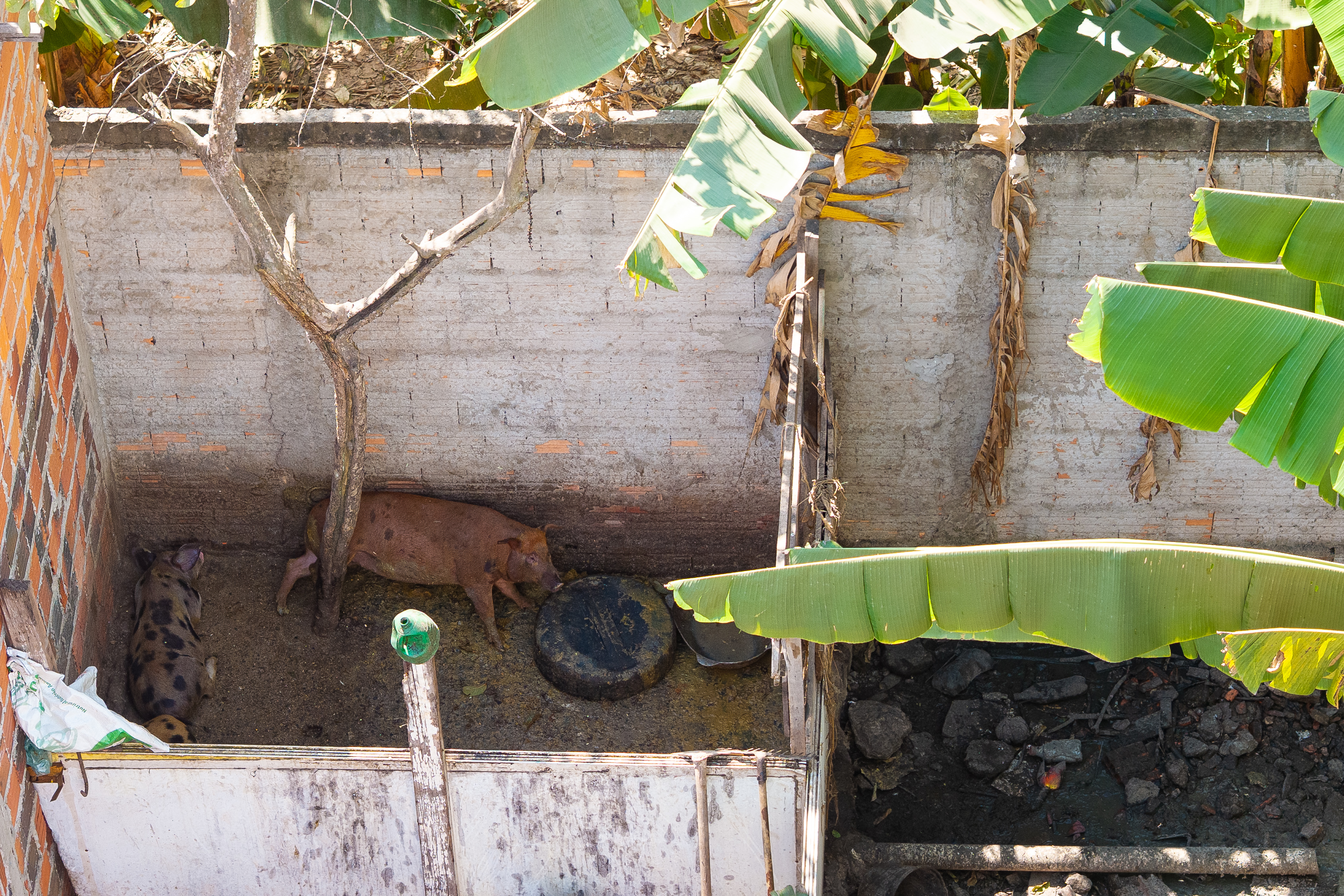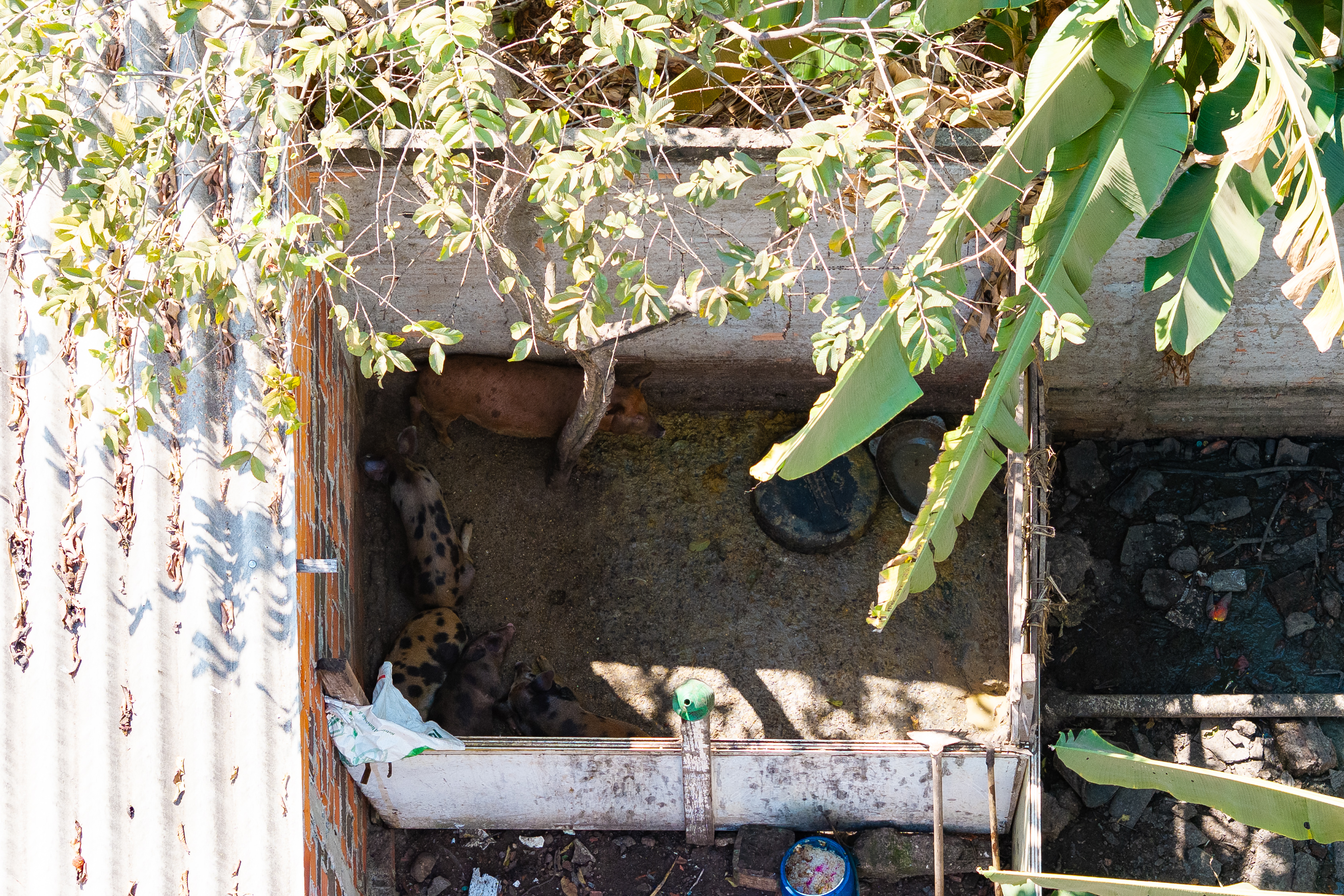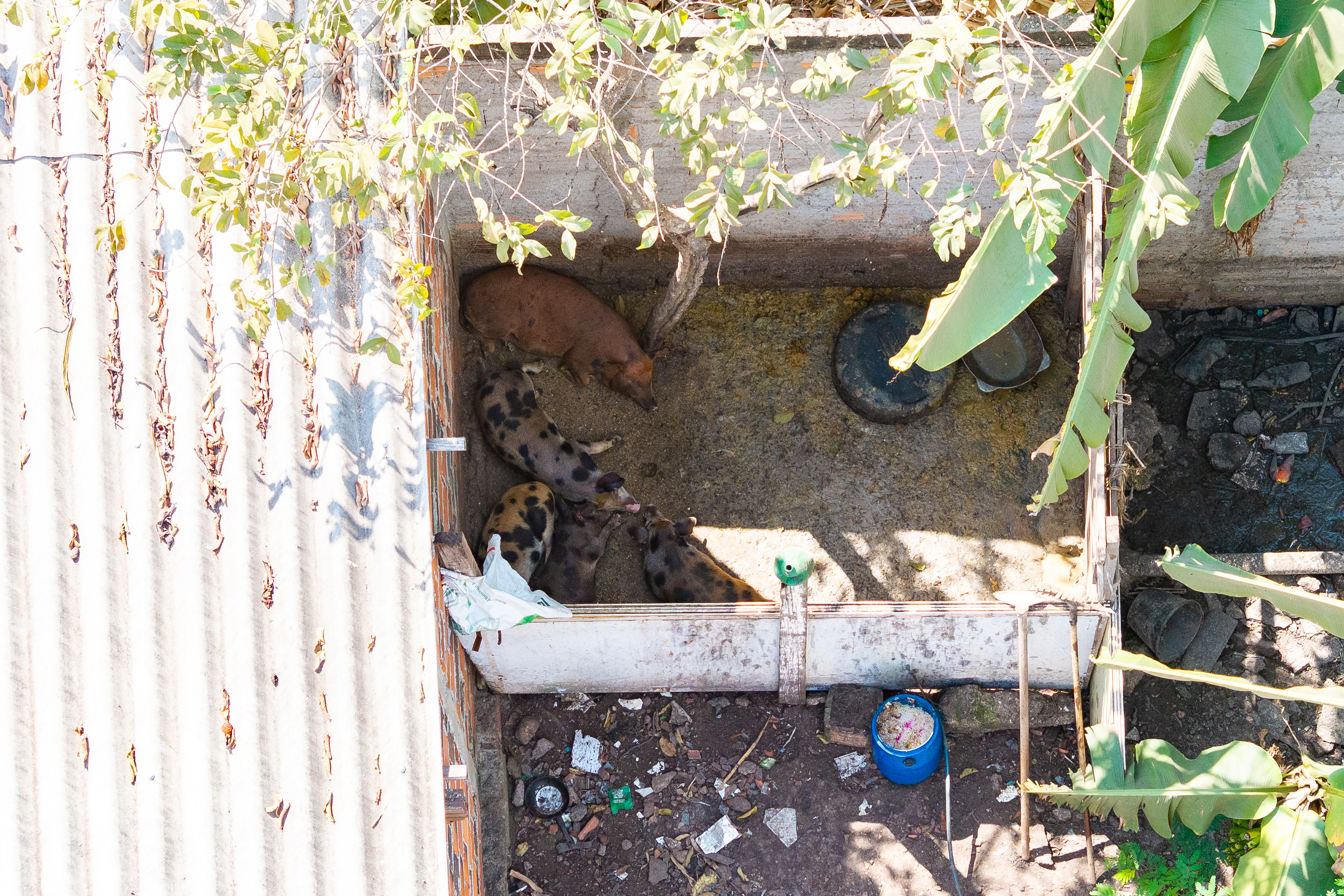 A foto aérea mostra cinco porcos sendo criados em um terreno localizado em área urbana de Cuiabá