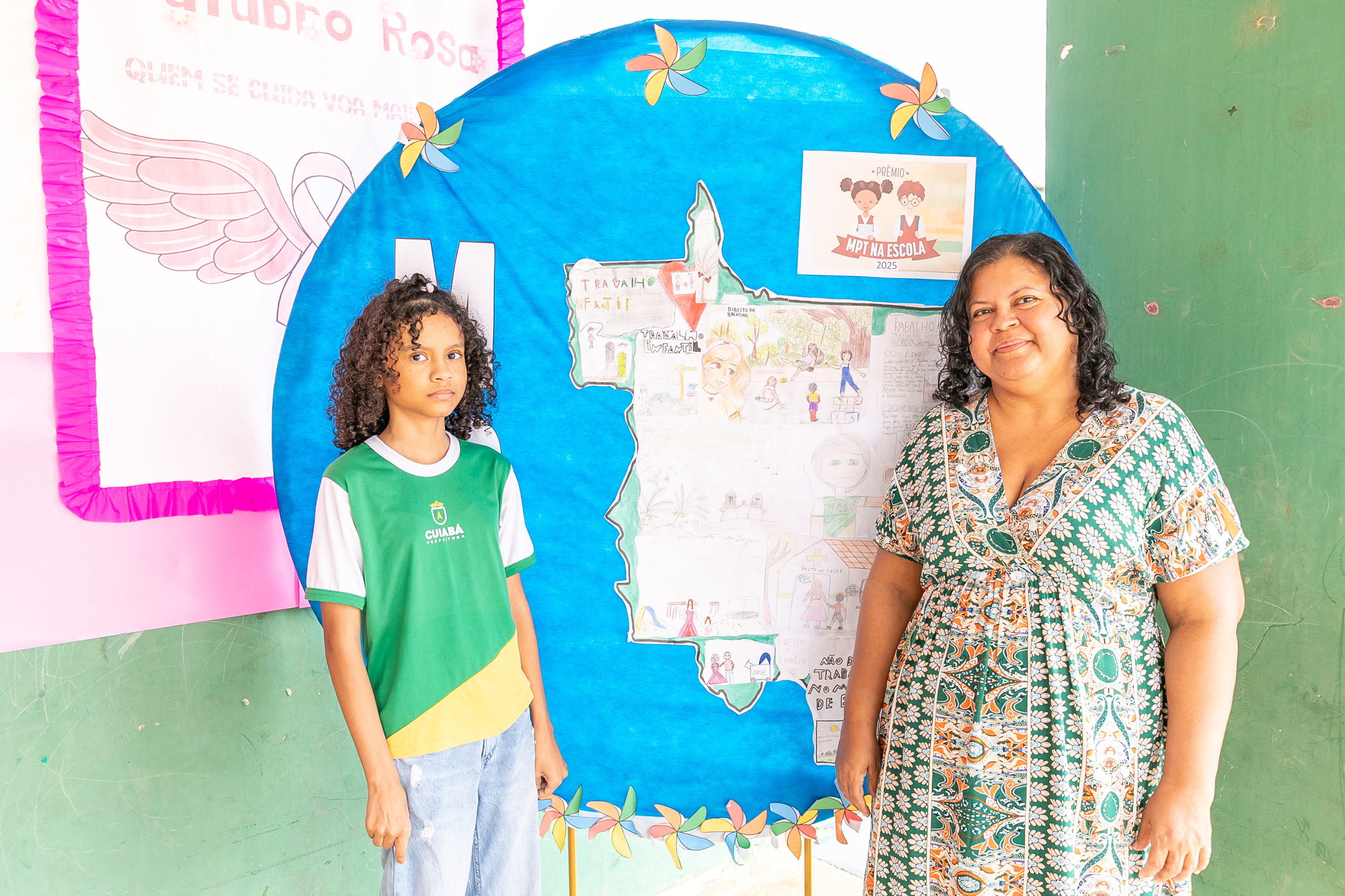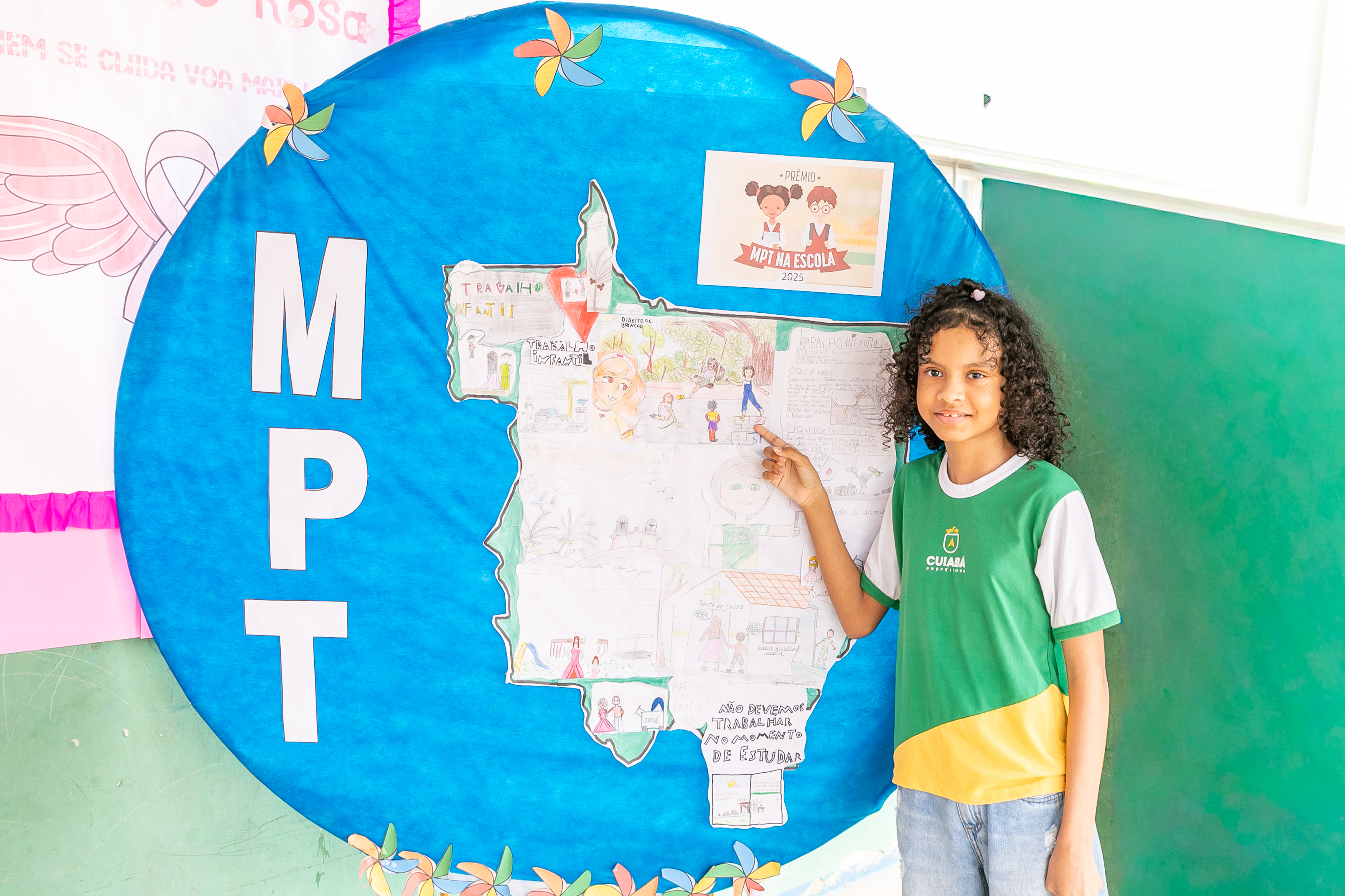 A estudante de Cuiabá Bruna Souza de Camargo, matriculada no 5º ano da Escola Municipal Floriano Bocheneki, localizada no bairro Parque Atalaia, foi reconhecida pelo Ministério Público do Trabalho de Mato Grosso como autora do melhor desenho relacionado ao combate à exploração do trabalho infantil.