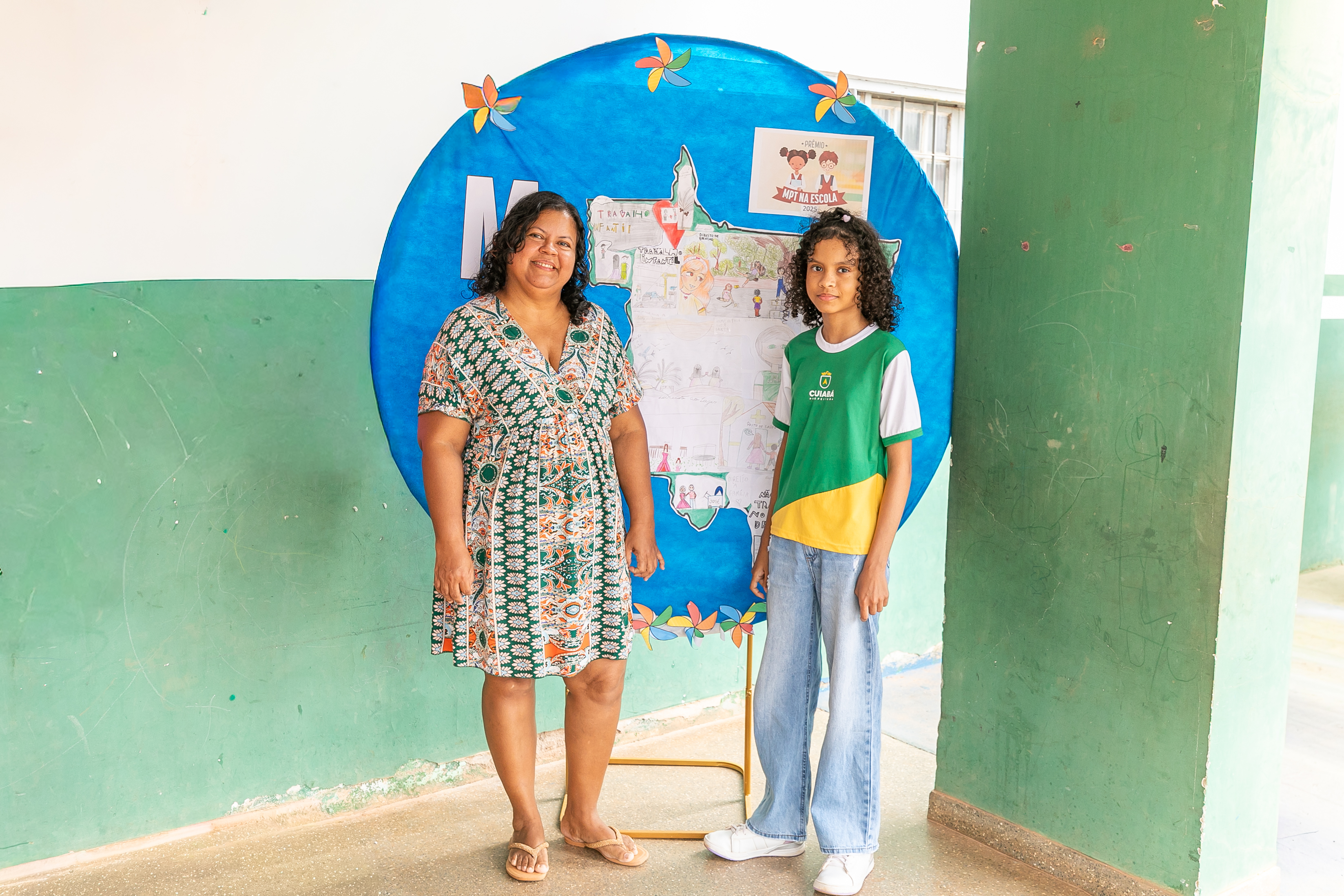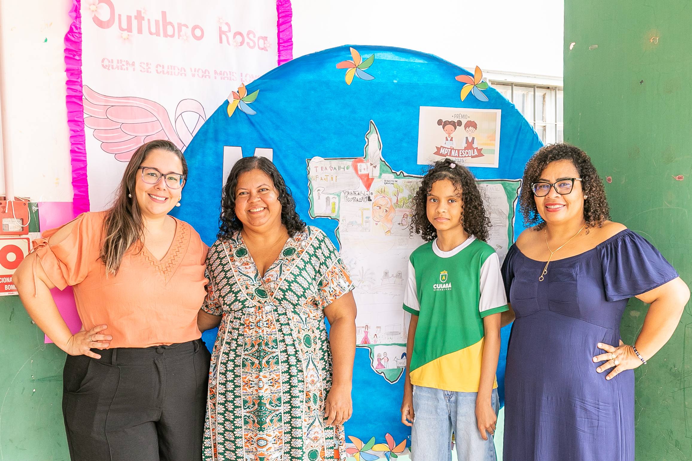 A foto ilustra a estudante Bruna Souza de Camargo no pátio da Escola Municipal Floriano Bocheneki. Trata-se de uma criança de cor parda, cabelos cacheados, vestida com uniforme oficial da Prefeitura de Cuiabá. Ela está sorridente e exibe um painel que dá destaque ao desenho de sua autoria reconhecido como o melhor de Mato Grosso pelo Ministério Público do Trabalho.