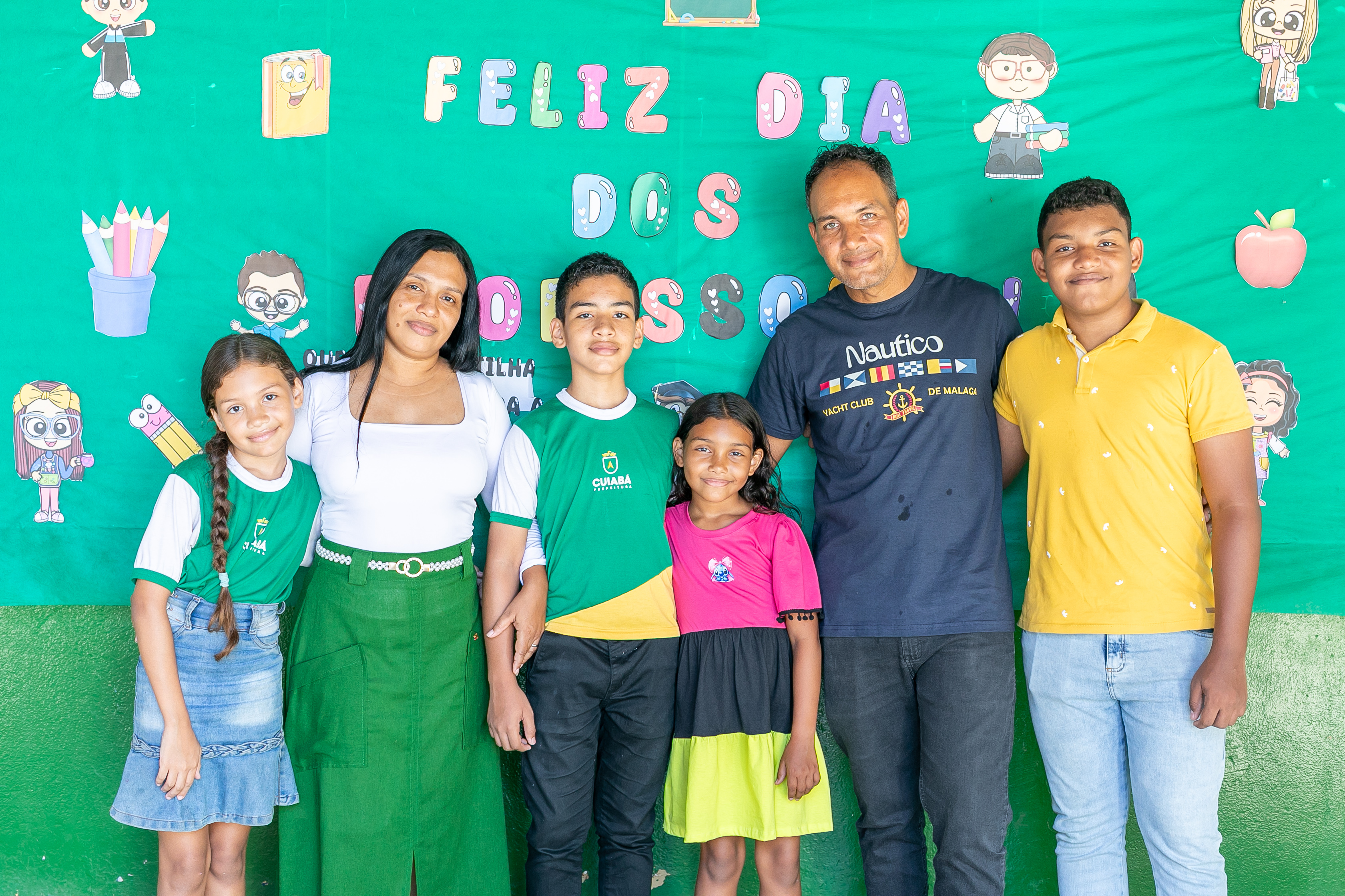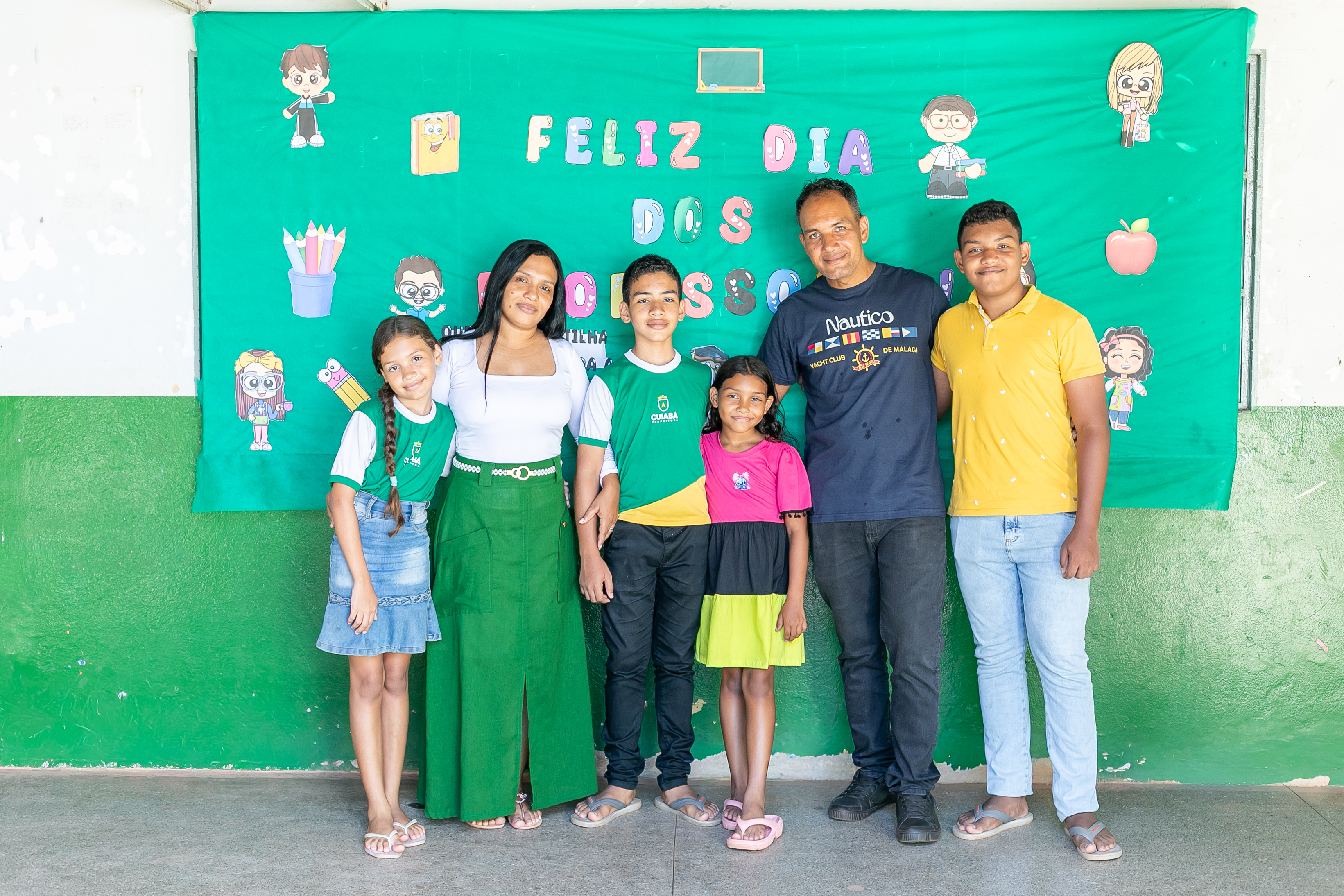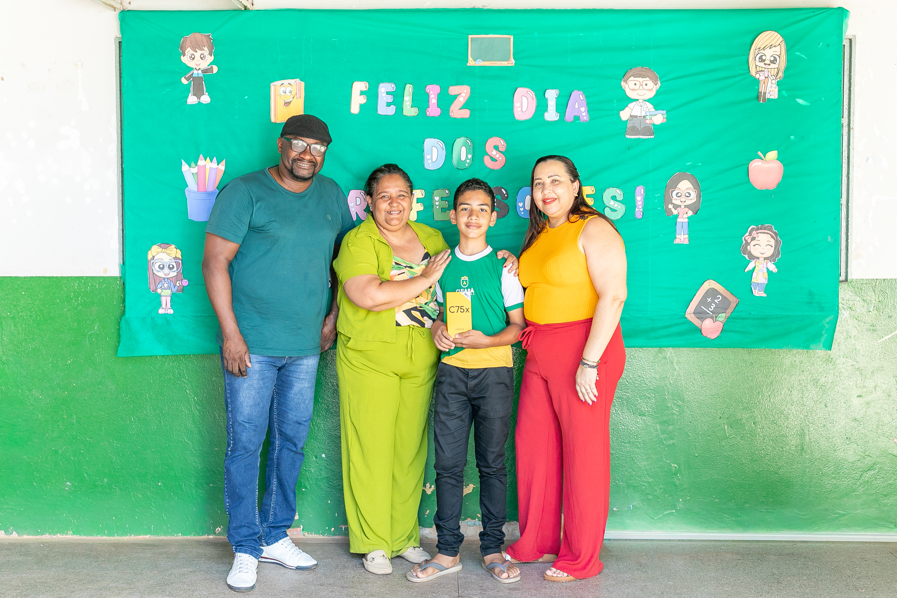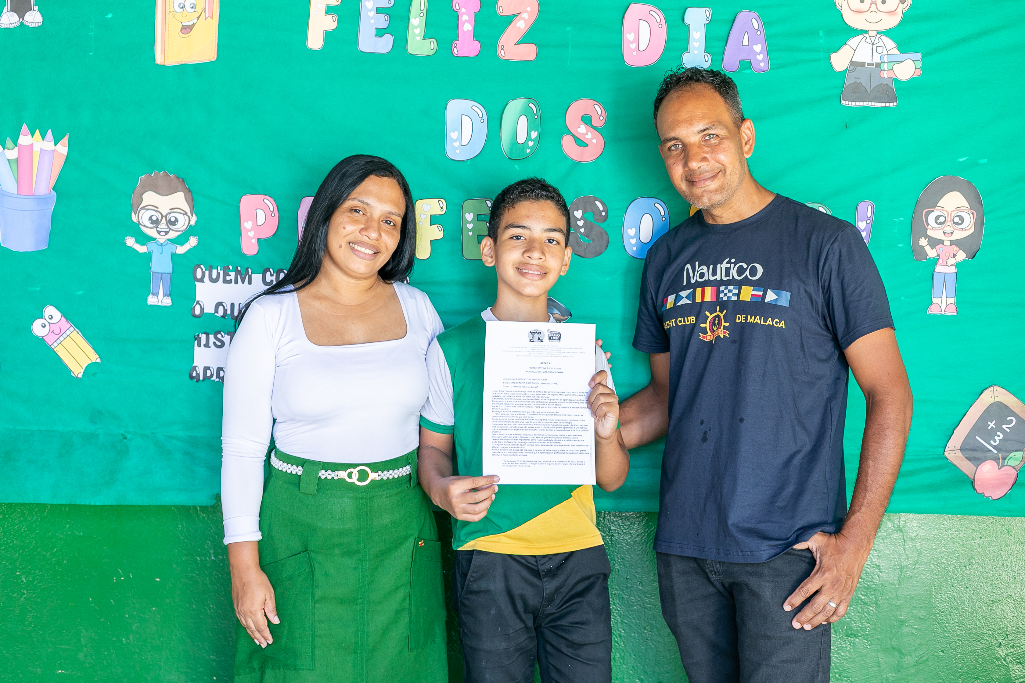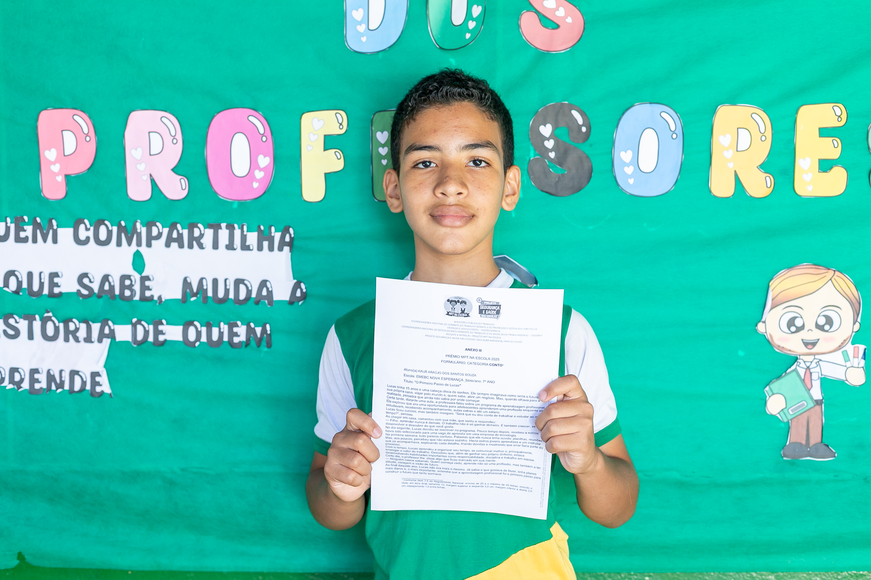 A foto ilustra um garoto de 13 anos, de cor parda, usando uniforme oficial da Prefeitura de Cuiabá, exibindo nas mãos o trecho do conto literário que o levou a ser reconhecido pelo Ministério Público do Trabalho. Ao fundo, há um quadro verde com a mensagem Feliz Dia dos Professores, reforçando o ambiente escolar.