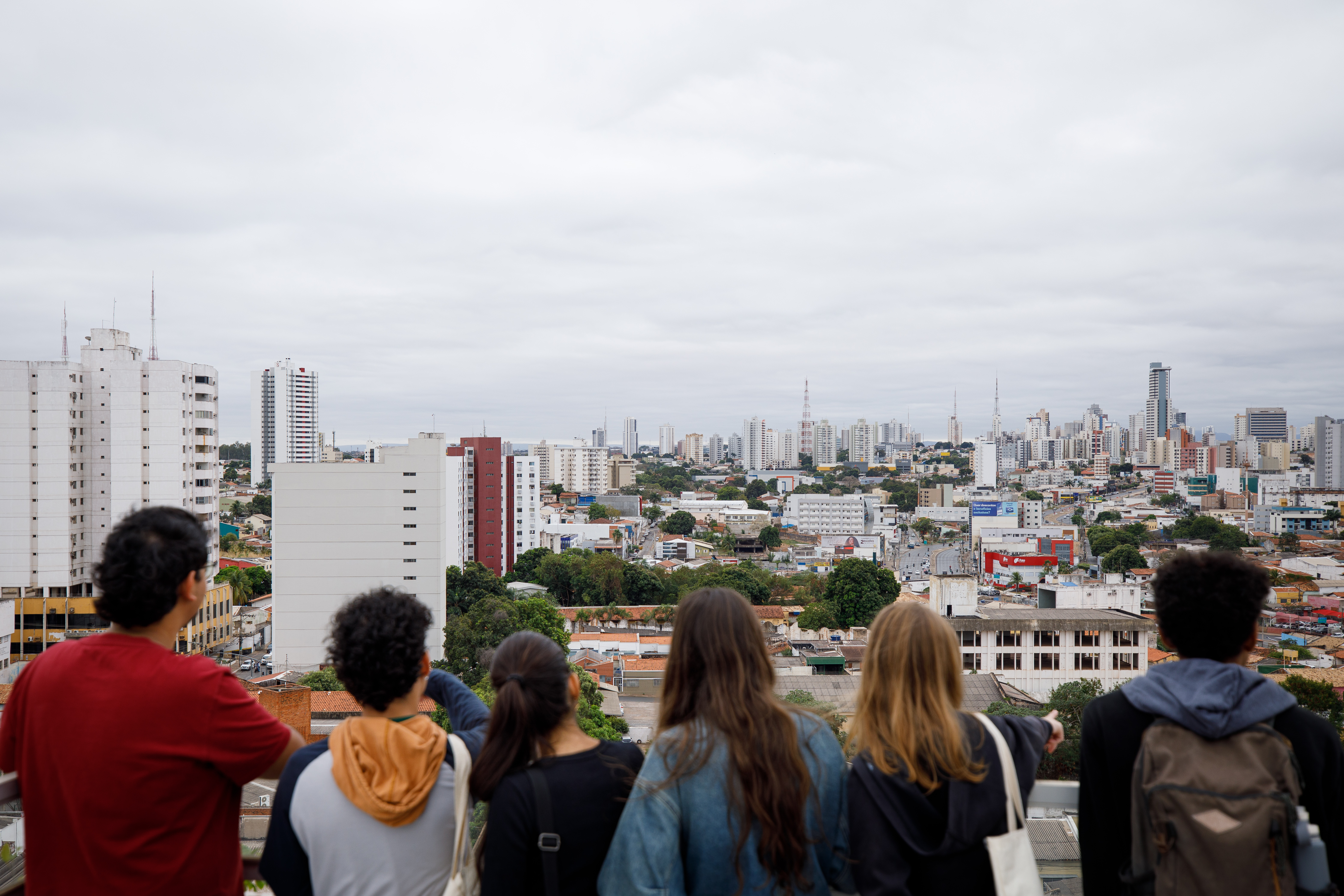 Na imagem principal, a turma com vários alunos da Universidade posa para uma fotografia em grupo no terraço do Palácio Alencastro.