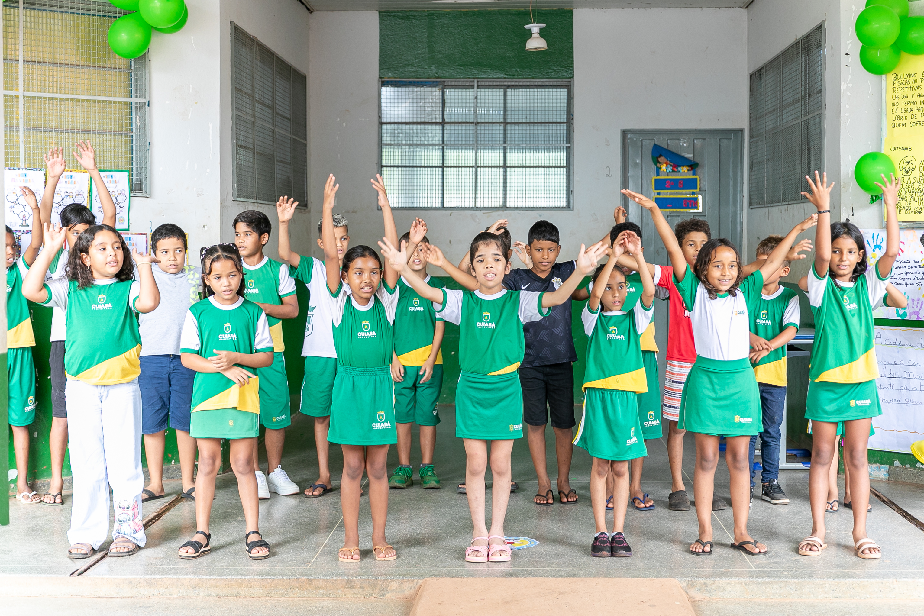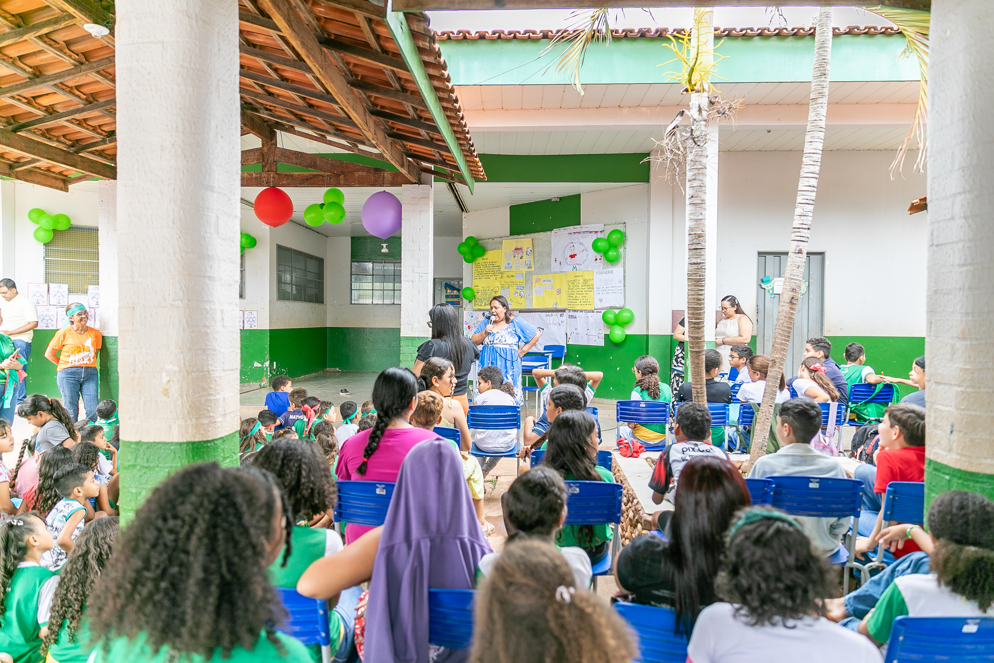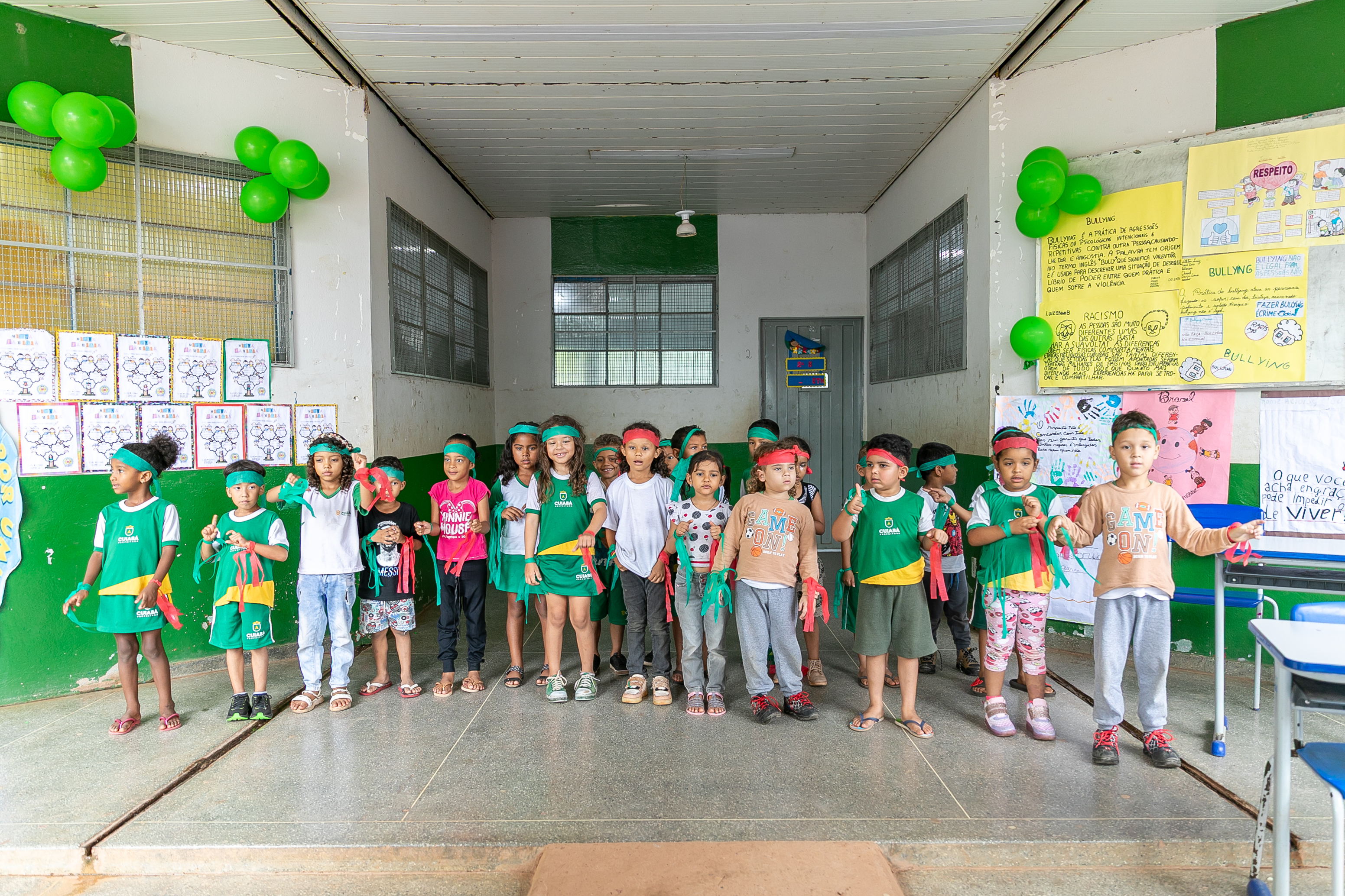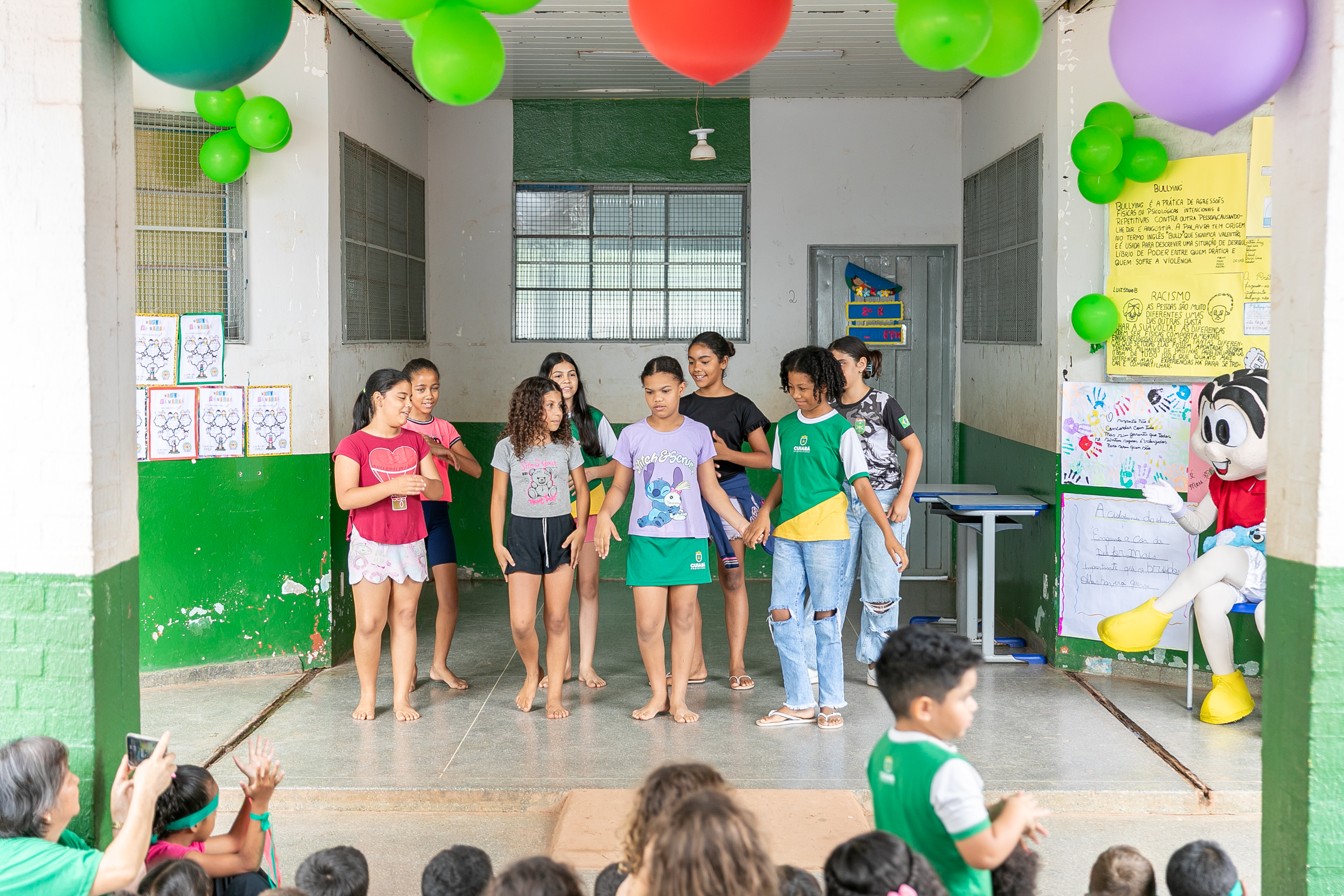 Os estudantes também fizeram apresentações de músicas e peças teatrais abordando o respeito e amor ao próximo. Nas paredes do pátio escolar, havia decoração com cartolinas exibindo desenhos produzidos pelos estudantes de combate ao bullyng.