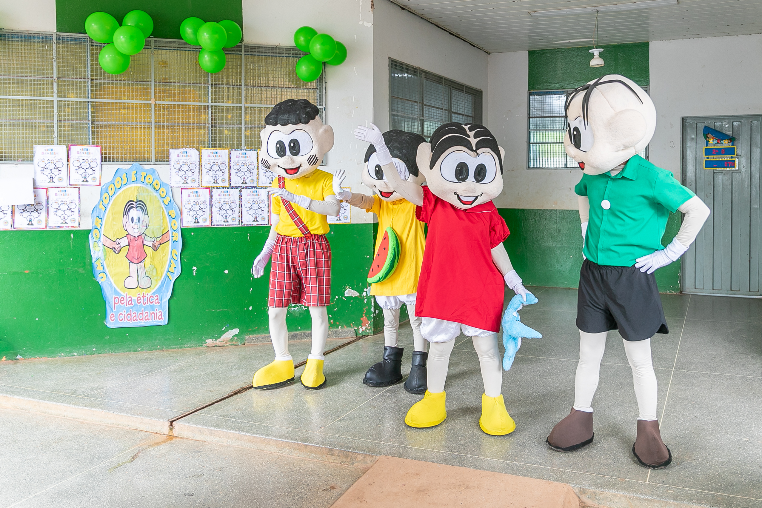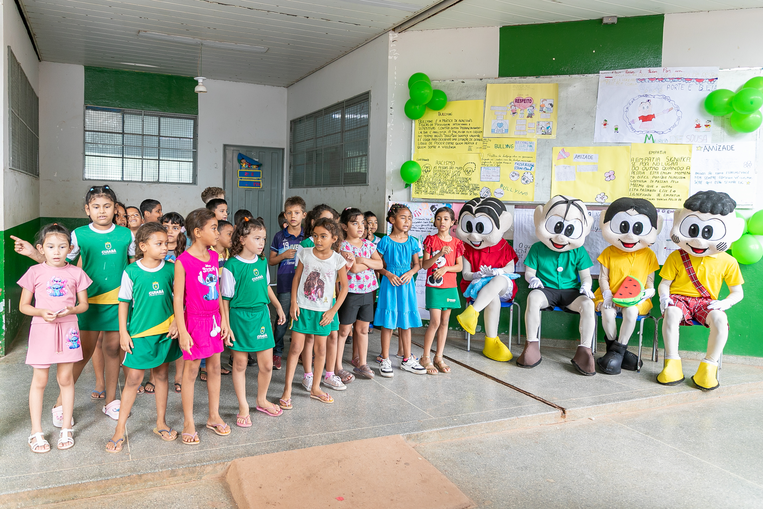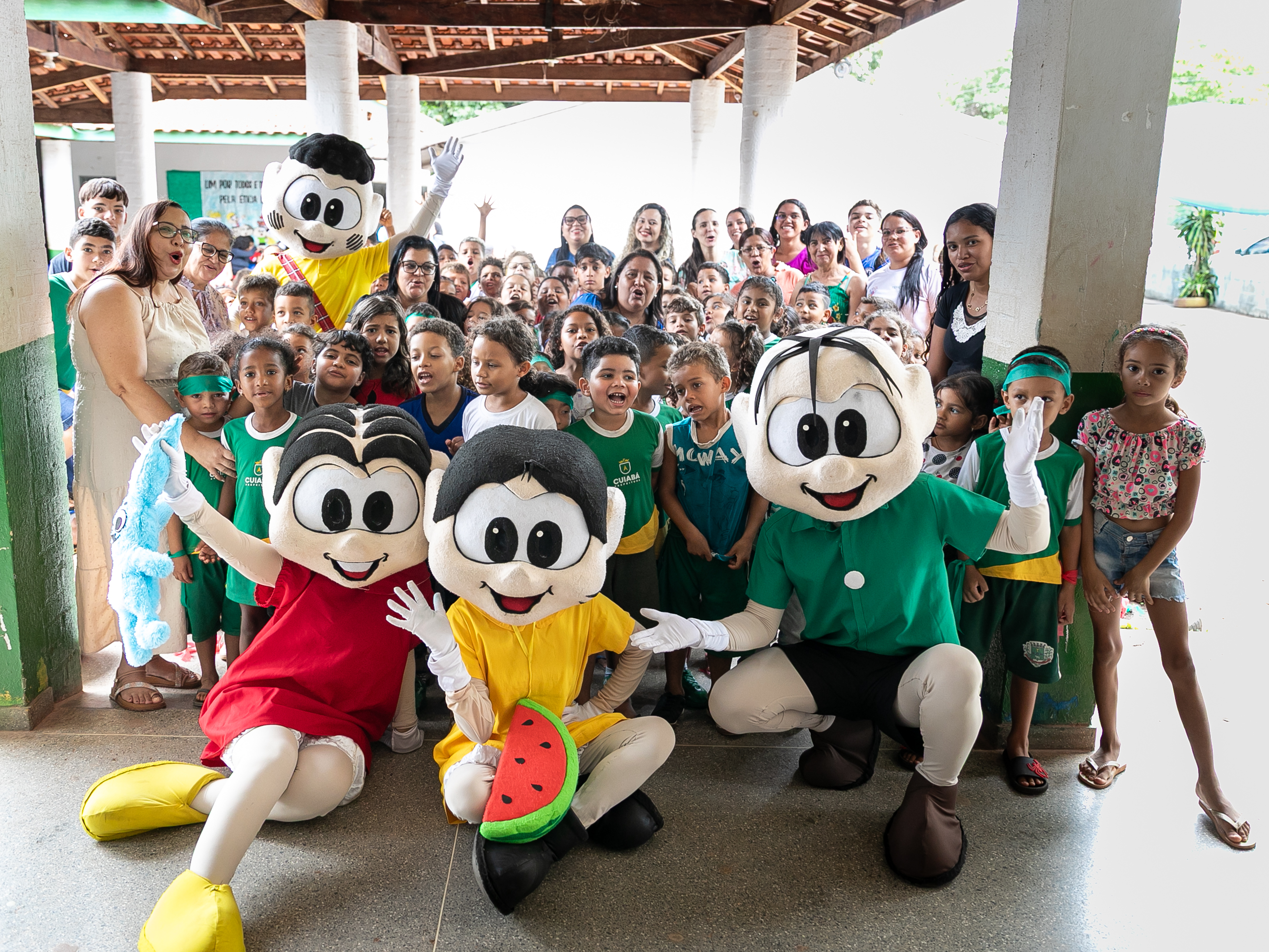 A foto ilustra estudantes com uniforme oficial da Prefeitura de Cuiabá e personagens vestidos de bonecos da Turma da Mônica em um pátio de uma escola.