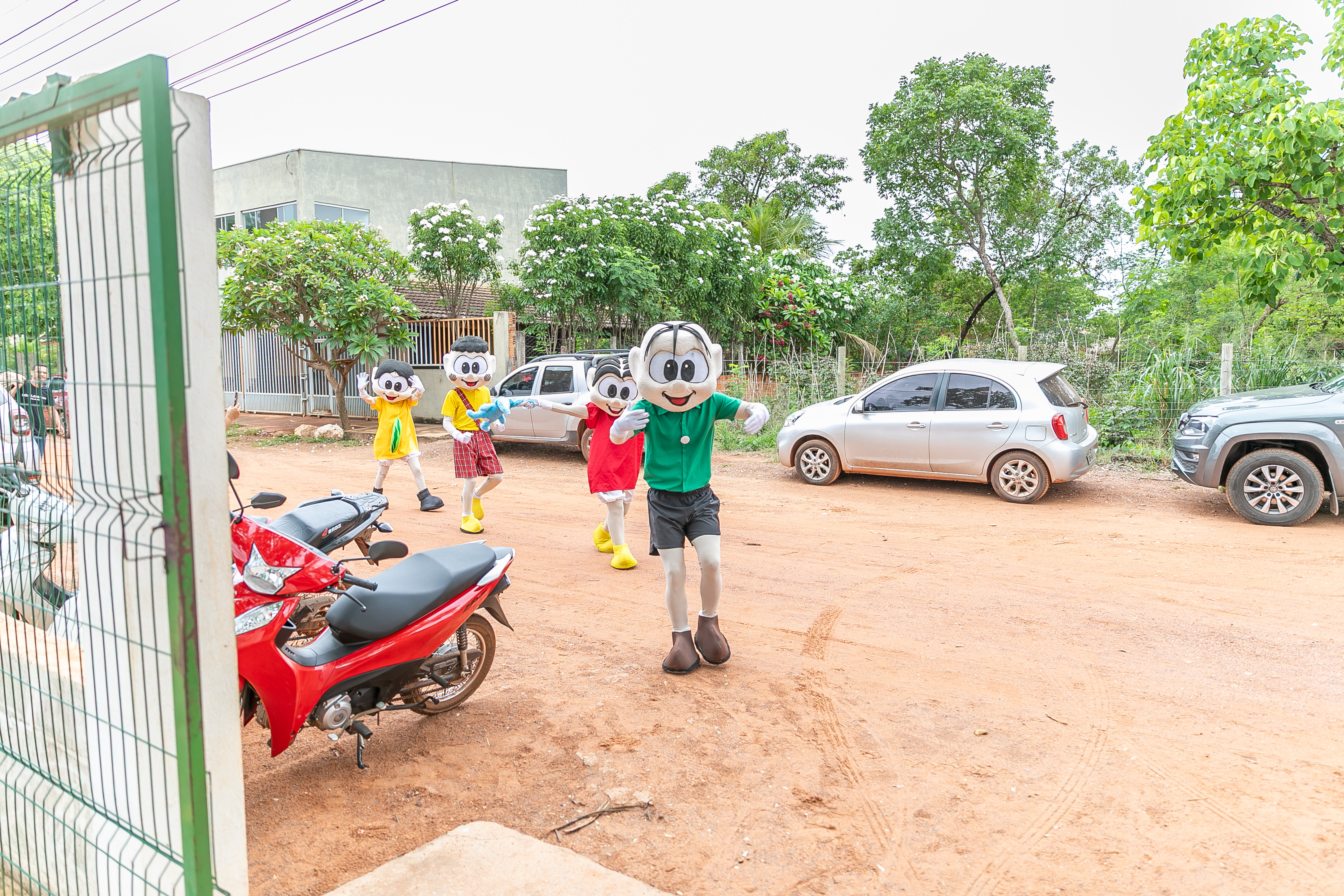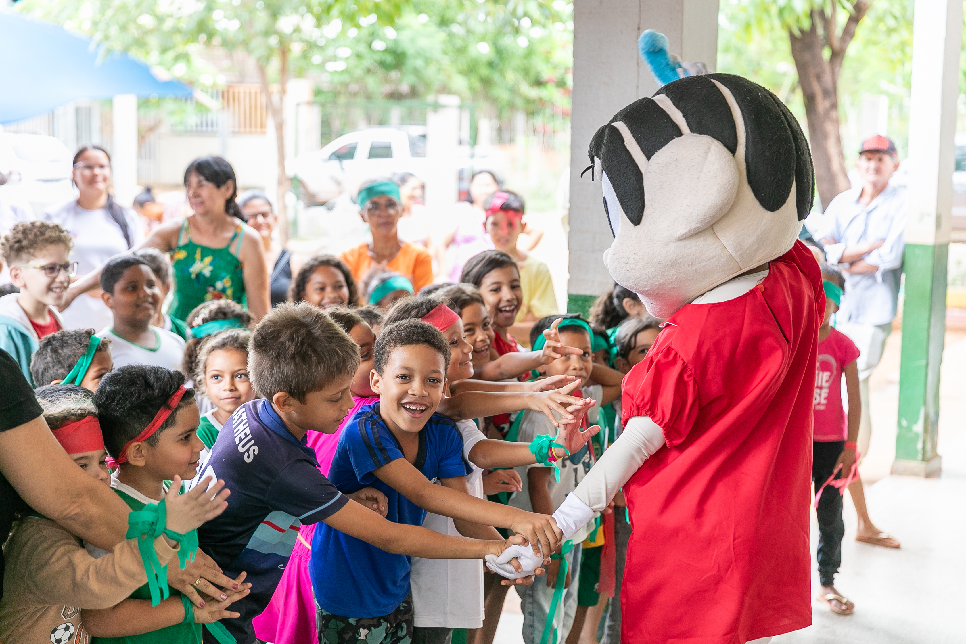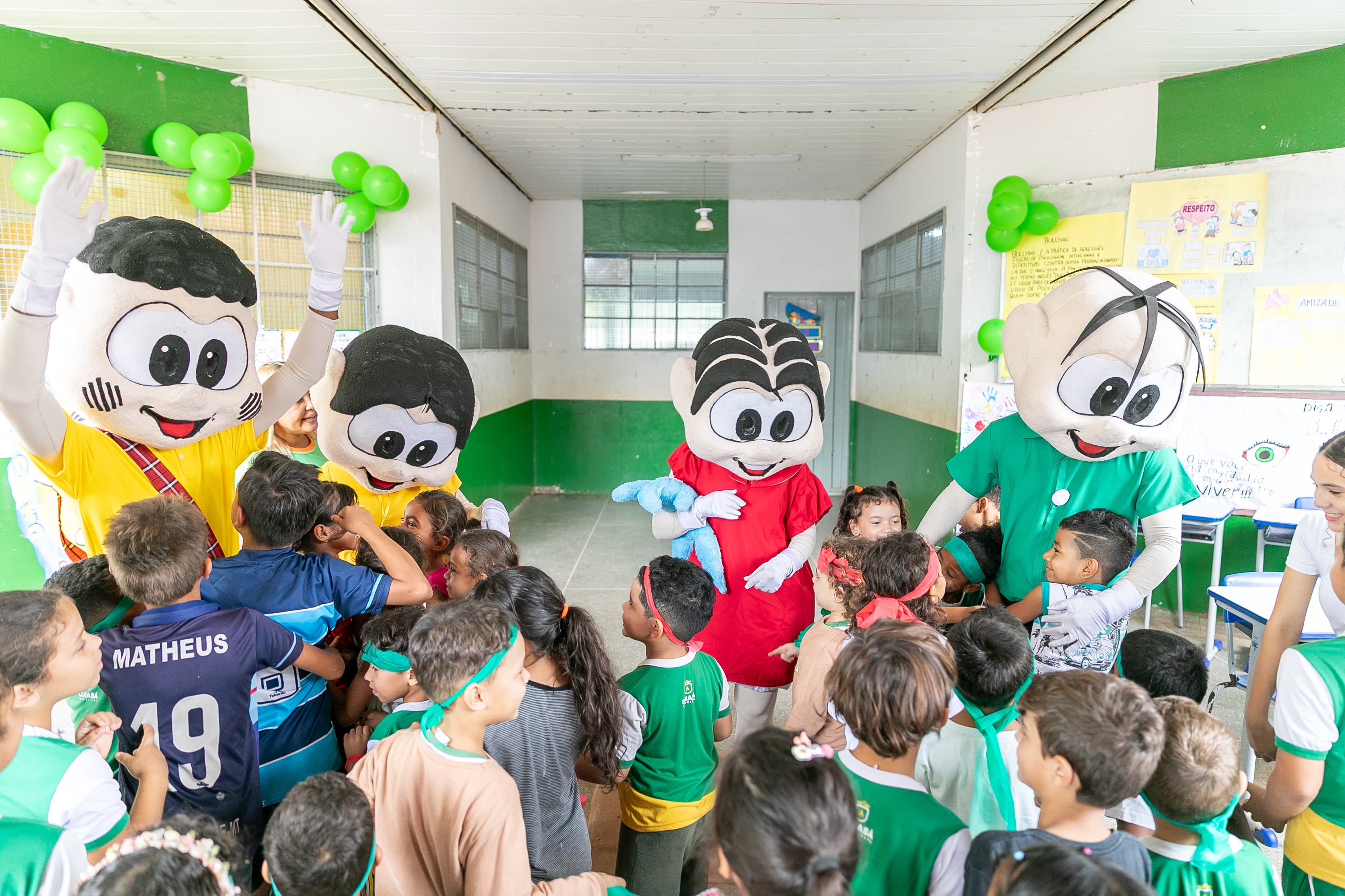 A foto ilustra estudantes com uniforme oficial da Prefeitura de Cuiabá e personagens vestidos de bonecos da Turma da Mônica em um pátio de uma escola.