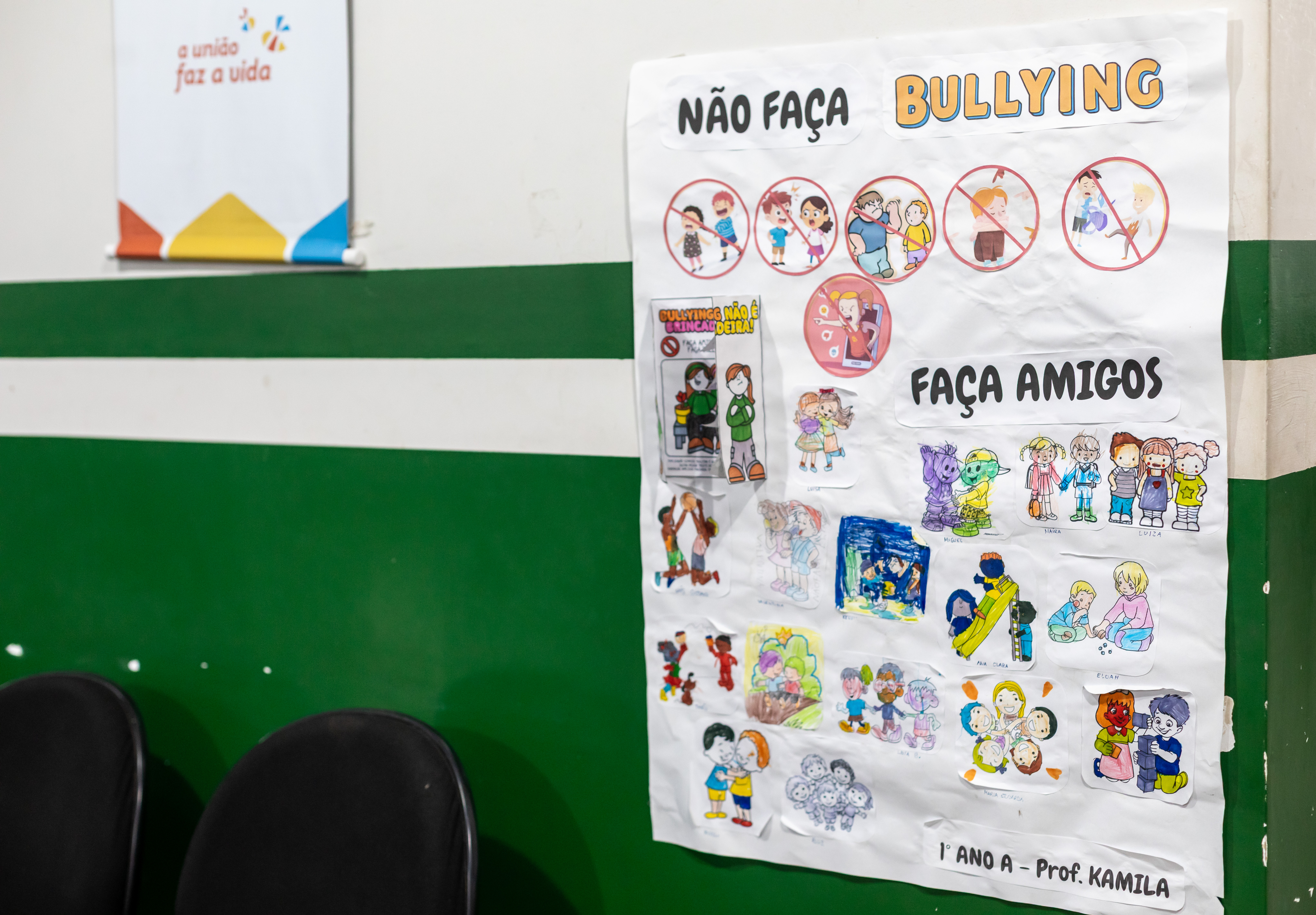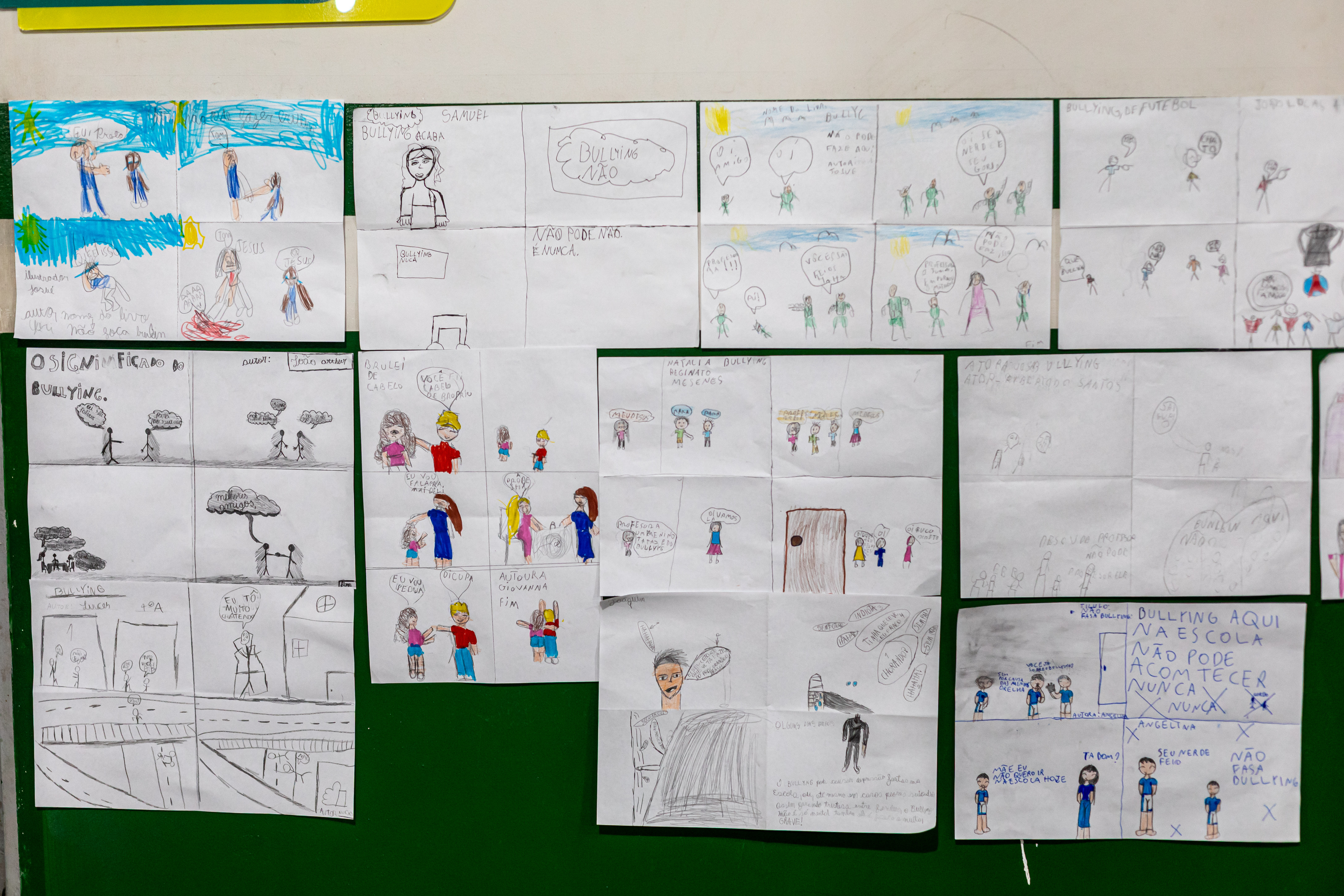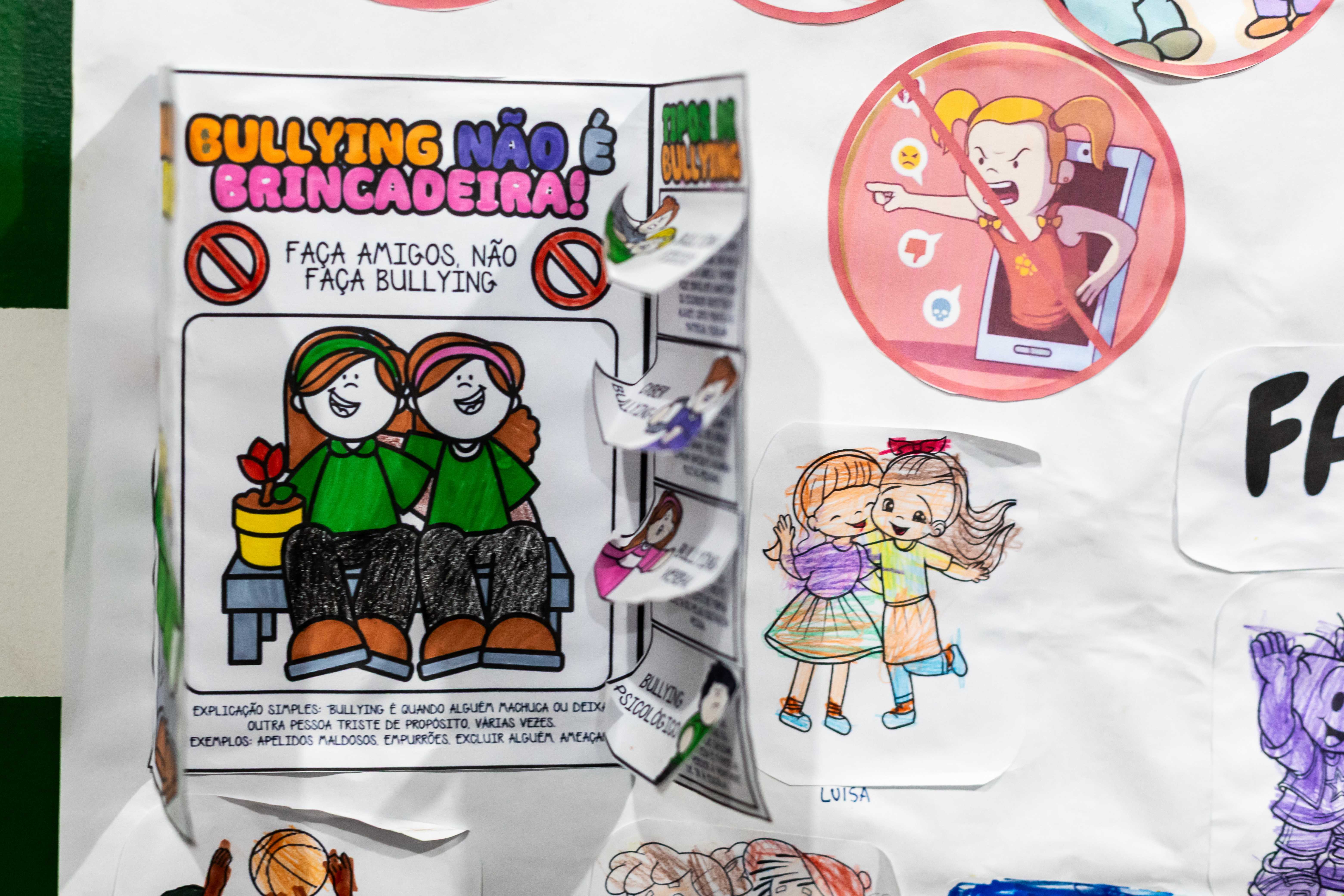 Há também cartolinas exibindo desenhos com ideias de combate ao bullying e cyberbullying feitos pelos estudantes da 1ª série, que têm seis anos.