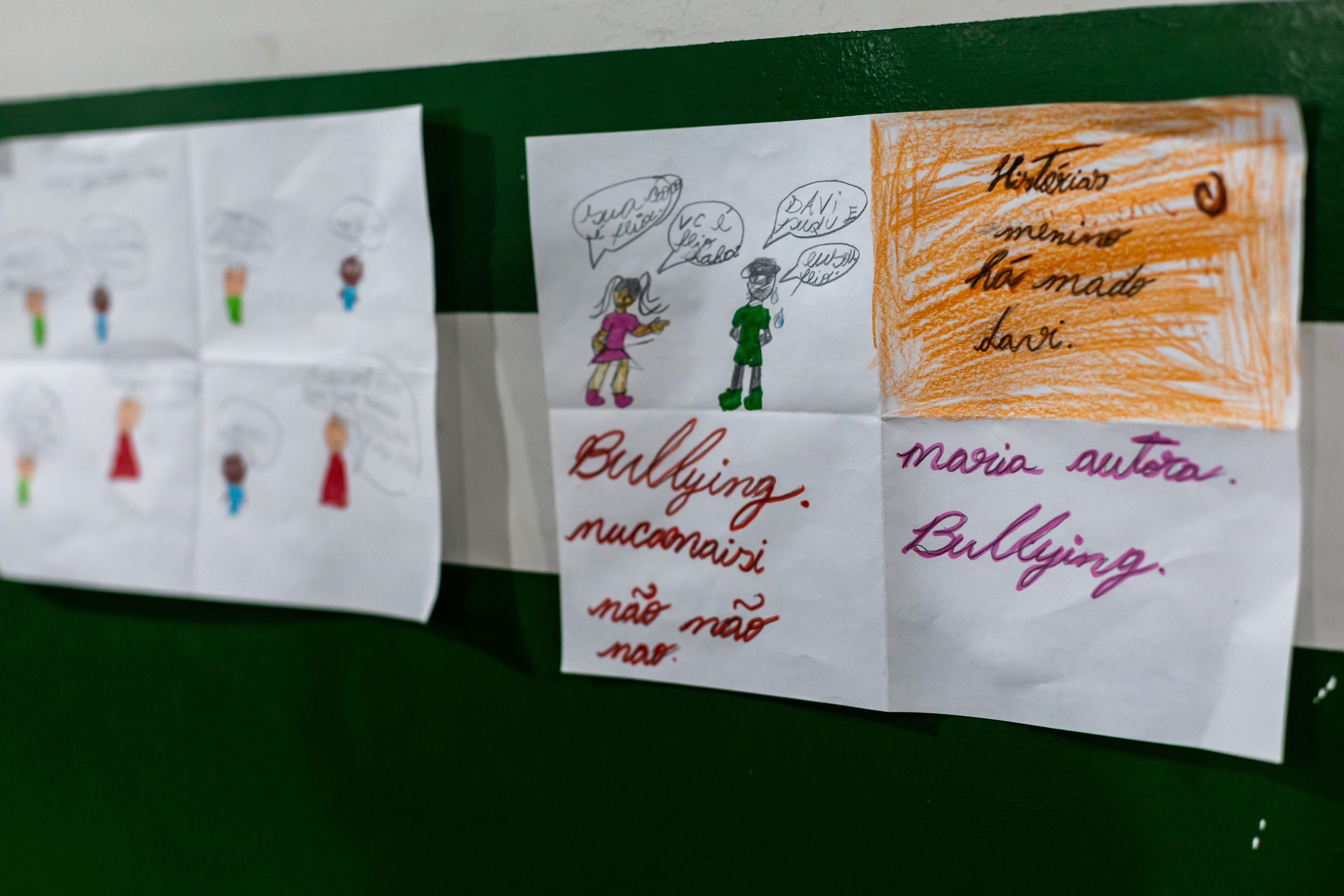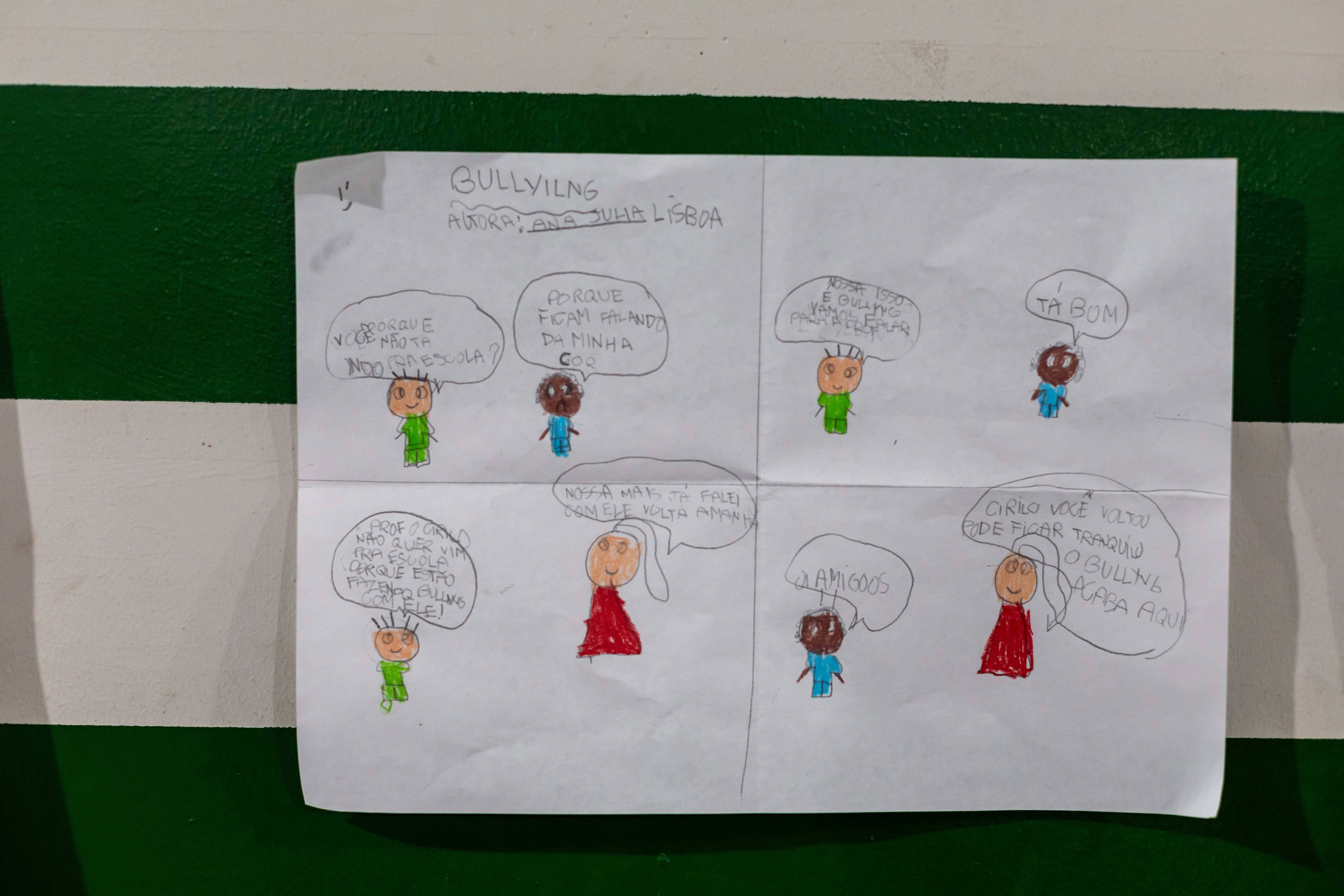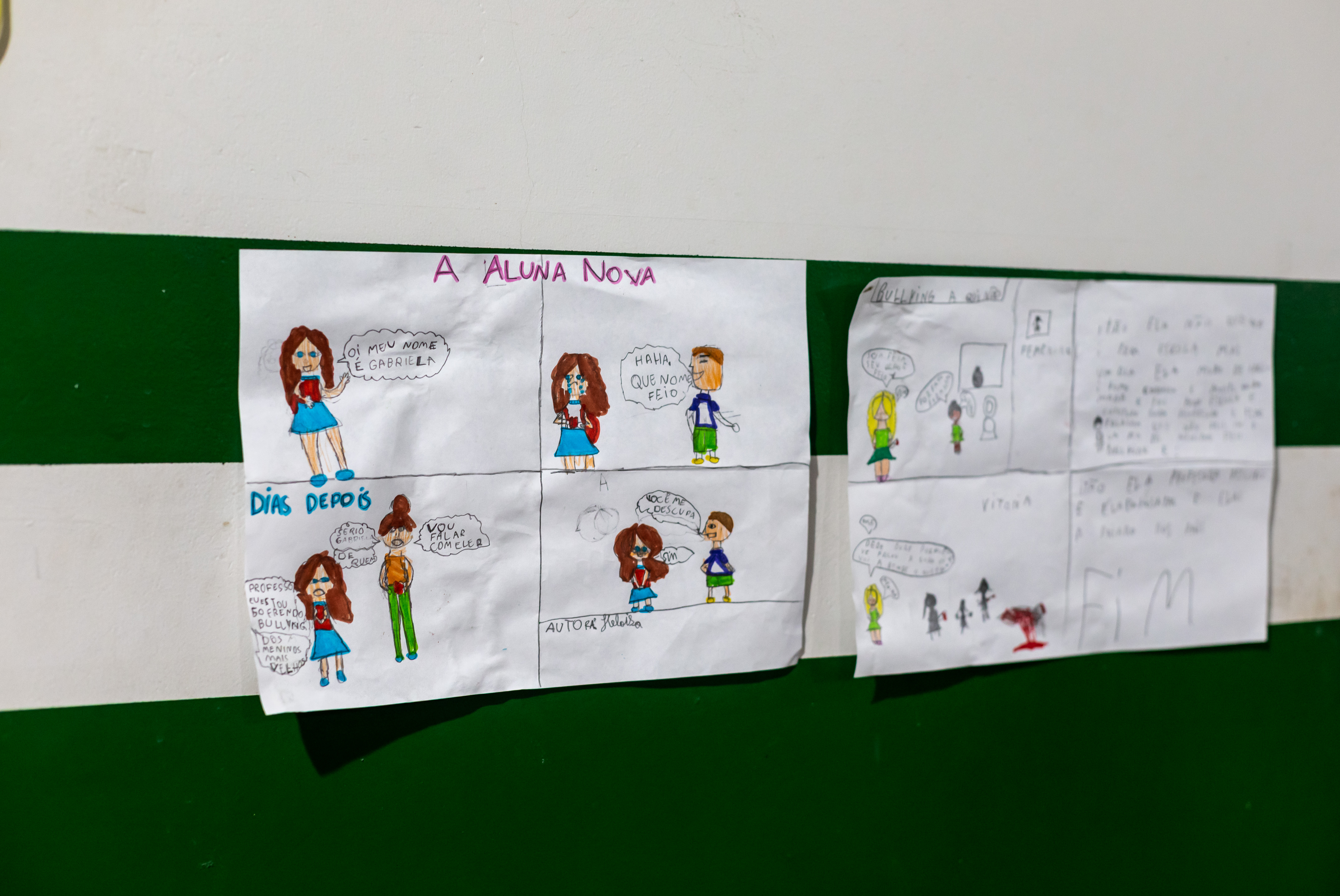 Há também cartolinas exibindo desenhos com ideias de combate ao bullying e cyberbullying feitos pelos estudantes da 1ª série, que têm seis anos.