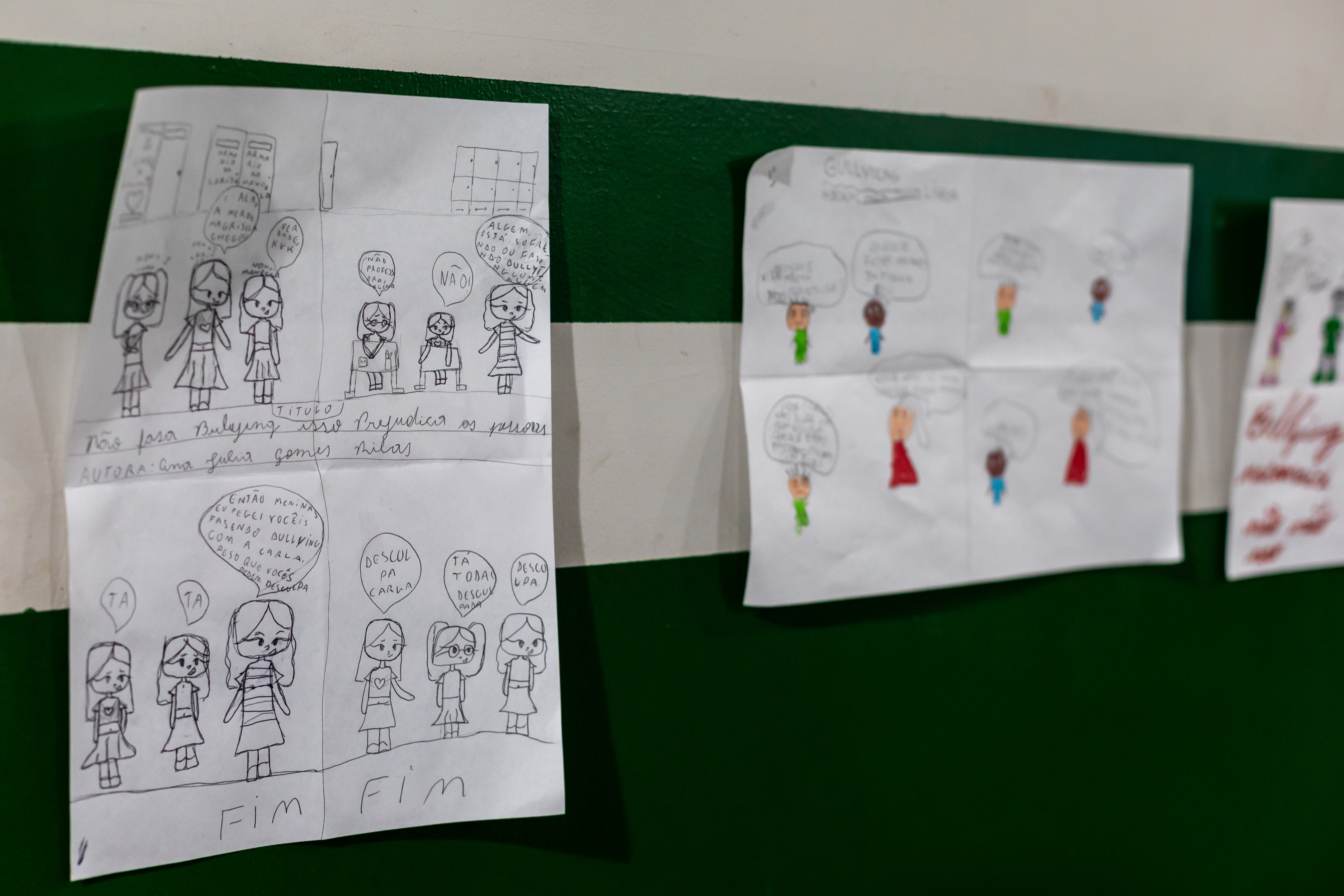A criatividade e a sinceridade dos alunos, expressas nos desenhos destinados à prevenção e conscientização sobre bullying e cyberbullying, estão expostas em cartazes nas paredes do pátio da EMEB Agostinho Simplício.