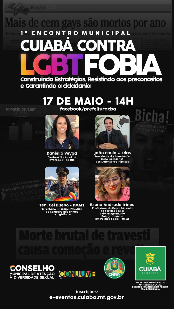 O 1º Encontro Municipal - Cuiabá contra LGBTFOBIA será marcado por um debate, no qual será formada uma mesa redonda cujo tema é “Construindo Estratégias, Resistindo aos preconceitos e garantindo a cidadania”. A atividade será transmitida ao vivo, por live, na página oficial da Prefeitura pelo Facebook- https://www.facebook.com/prefeituracba, no dia 17, a partir das 14 horas .