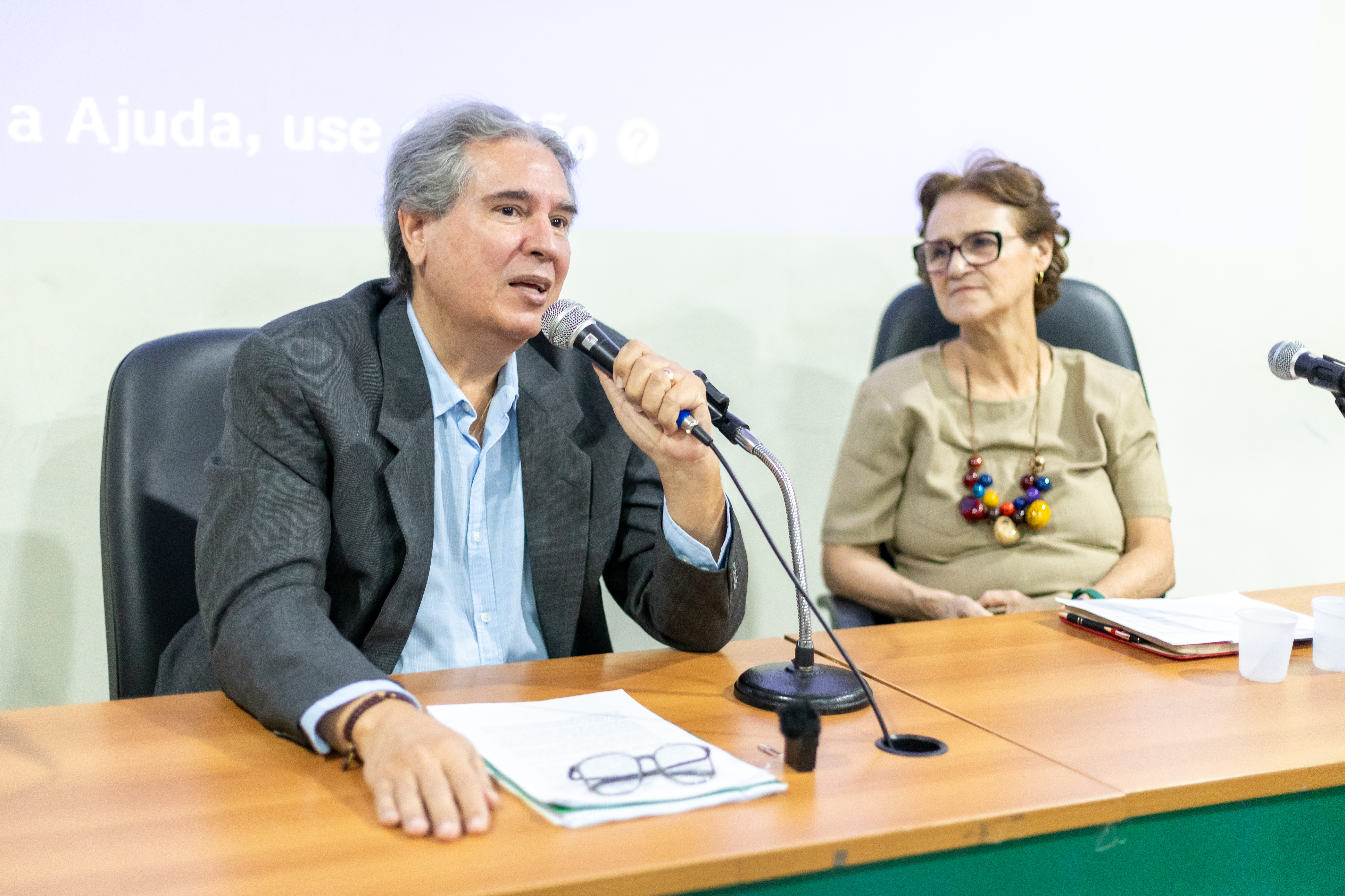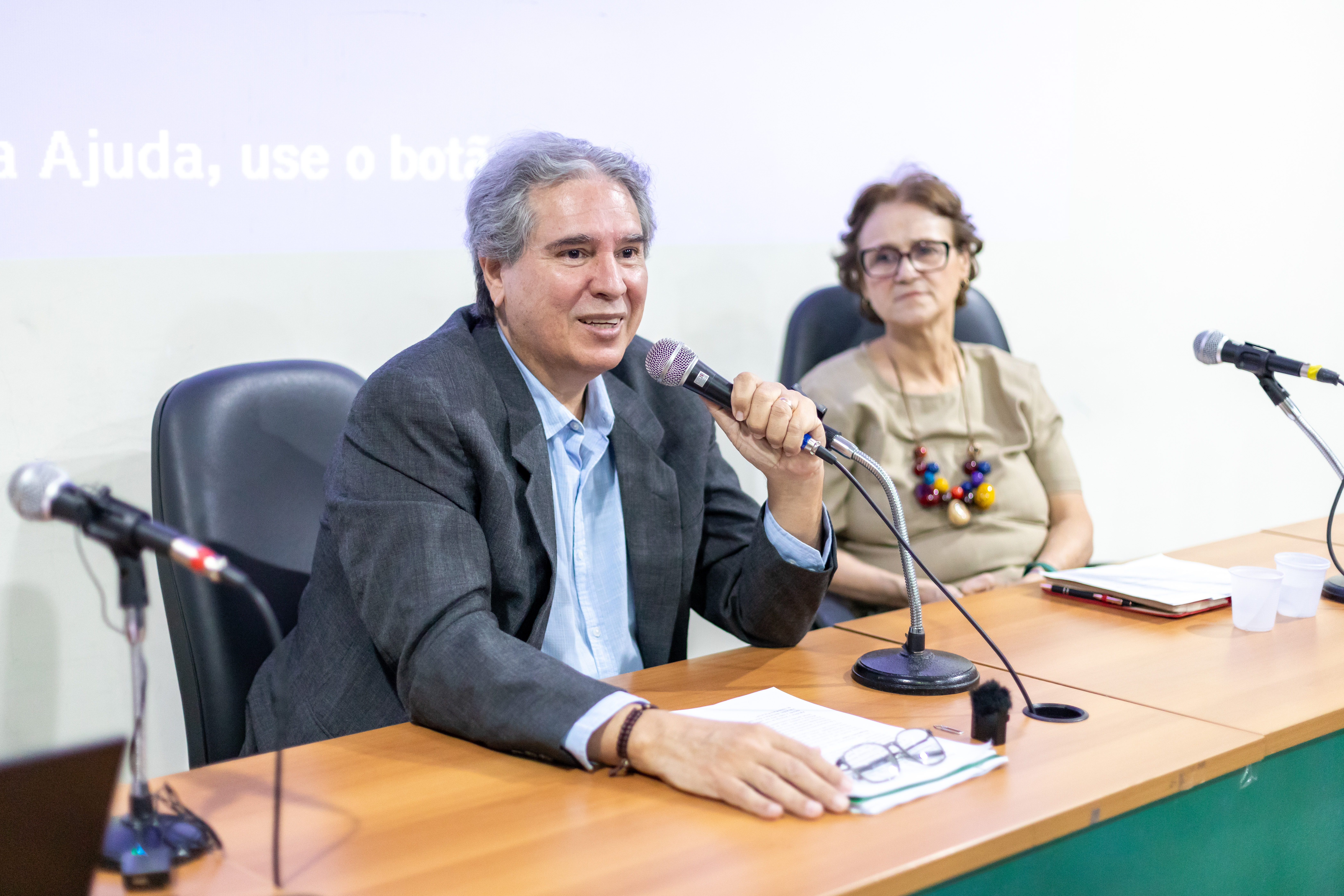 Imagem mostra o secretário Nivaldo Carvalho durante audiência pública ao lado da diretora de planejamento, Silvina dos Anjos.