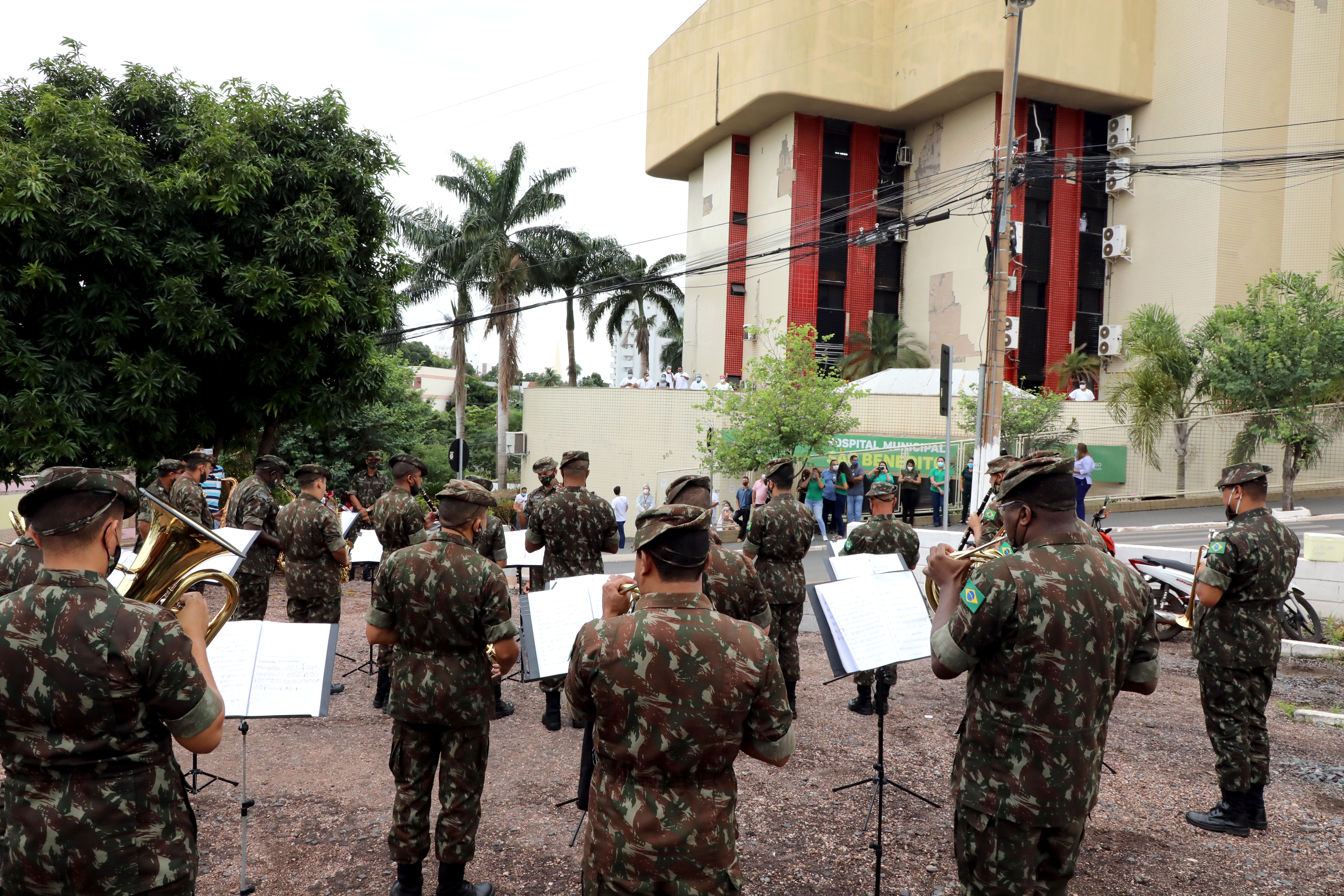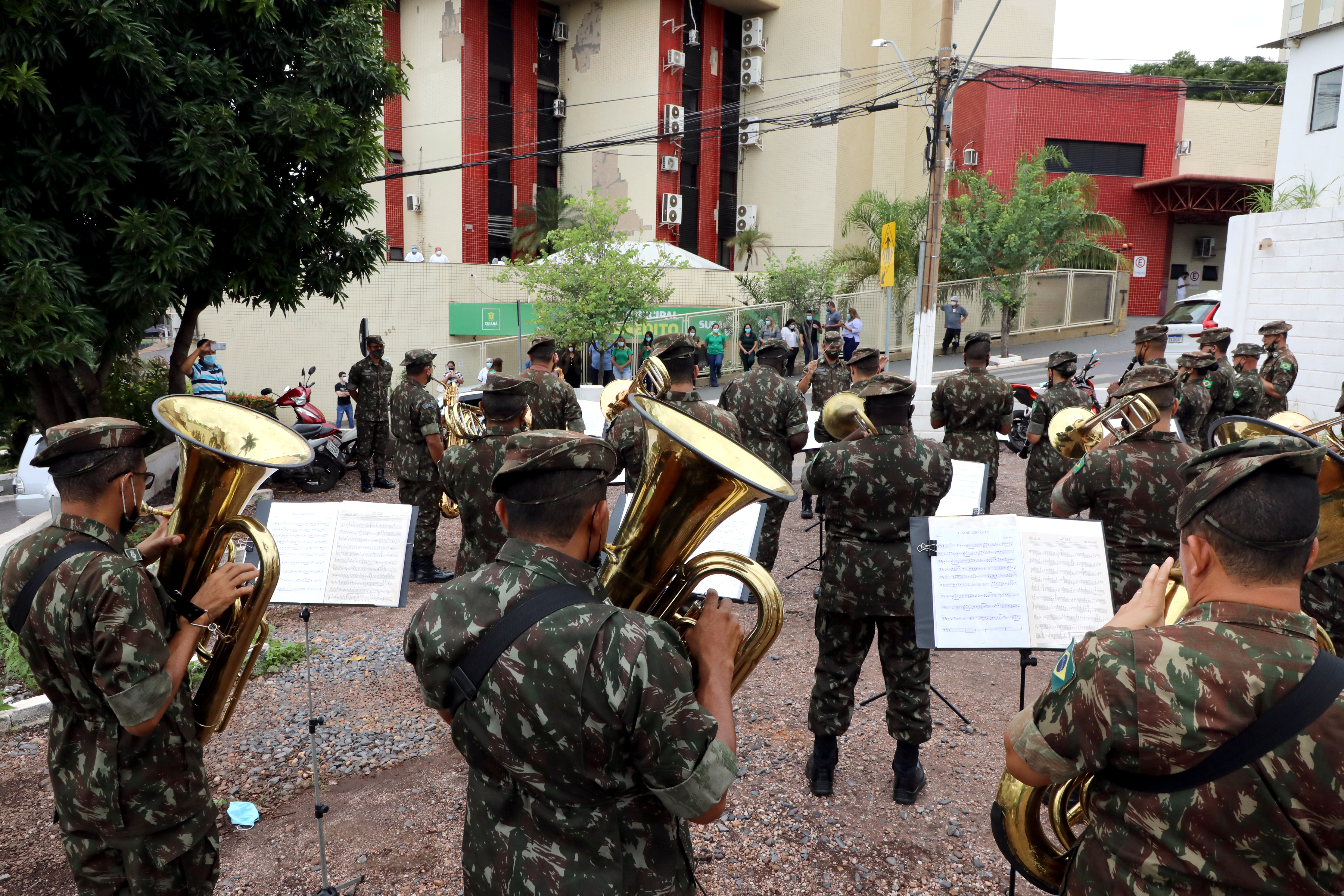 A banda da 13ª Brigada de Infantaria Motorizada adida ao Quadragésimo Quarto Batalhão de Infantaria Motorizada, se apresentou na manhã de terça-feira (6), no estacionamento do Hospital Municipal São Benedito, em Cuiabá, e emocionou pacientes que estão internados na unidade com a Covid-19 e os profissionais que atuam na linha de frente no combate contra o vírus.