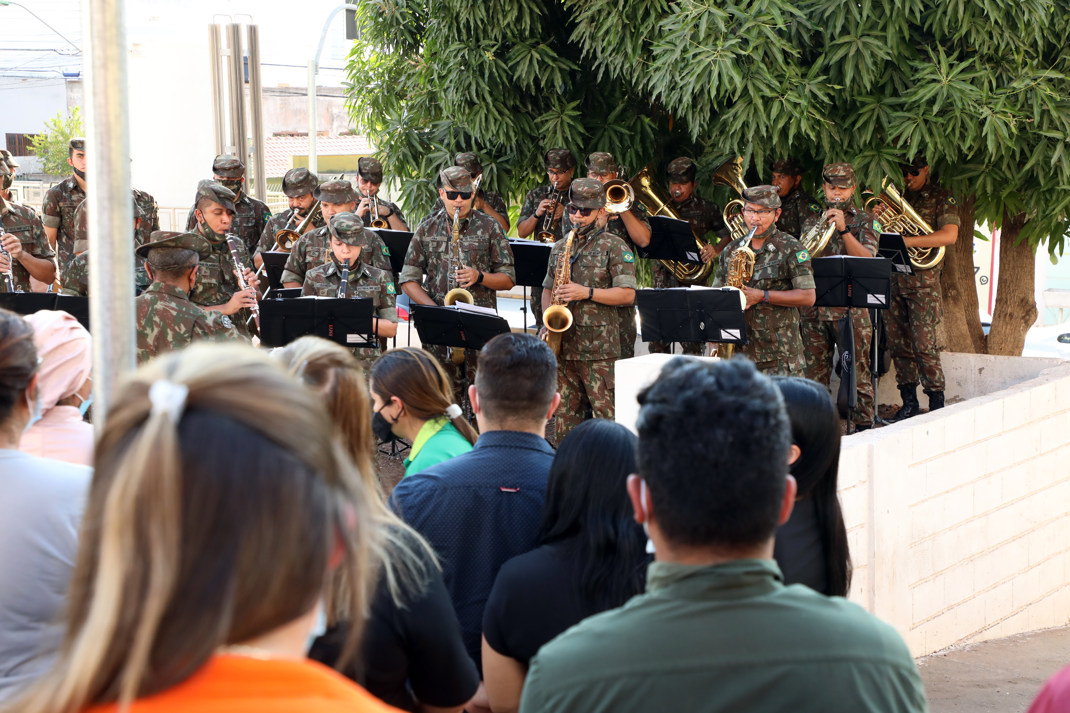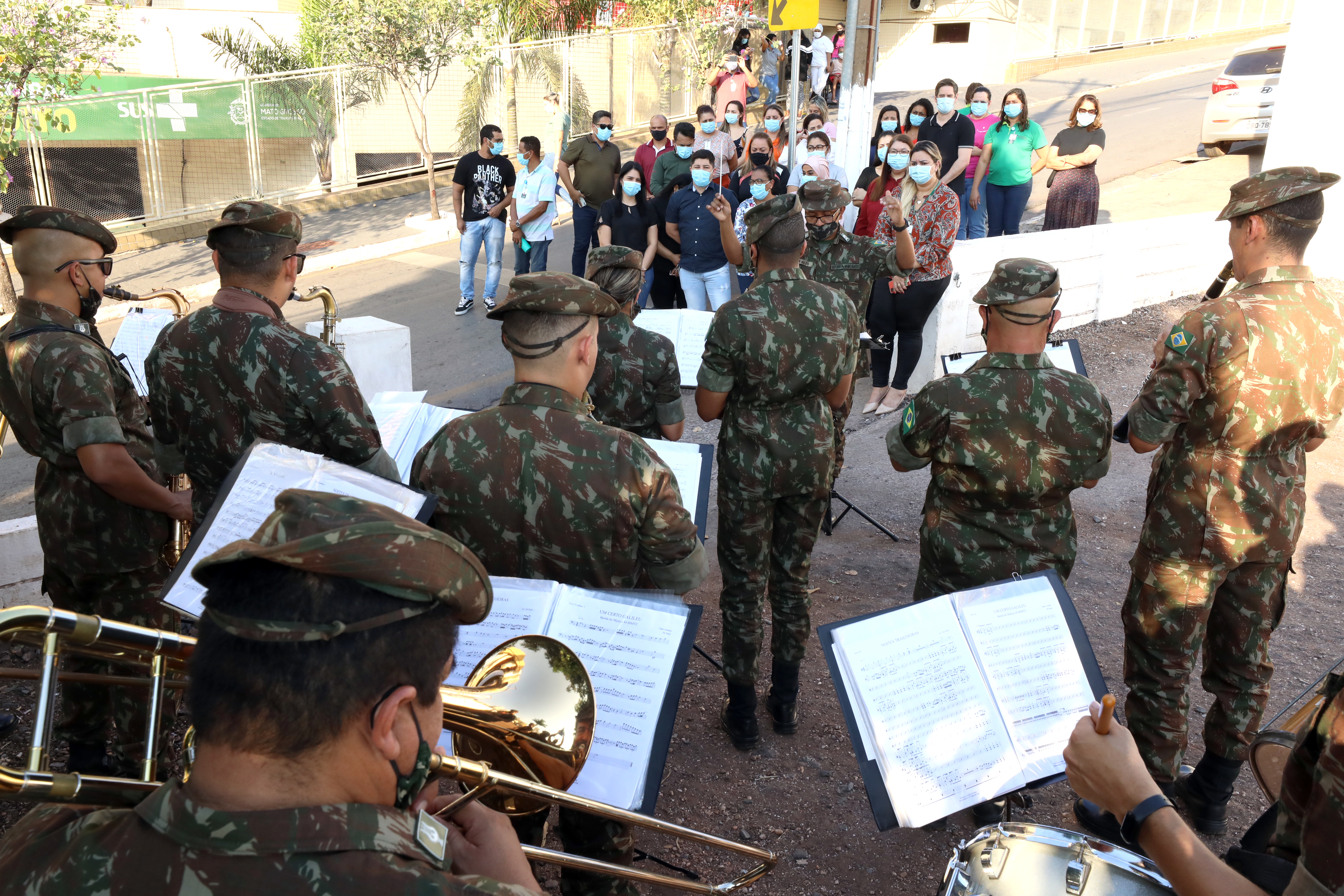 A banda da 13ª Brigada de Infantaria Motorizada adida ao Quadragésimo Quarto Batalhão de Infantaria Motorizada se apresentou na tarde de terça-feira (24), no estacionamento do Hospital Municipal São Benedito, em Cuiabá, levando emoção e descontração aos profissionais de saúde e aos pacientes que estão internados naquela unidade, que funciona exclusivamente para tratamento da covid-19.
