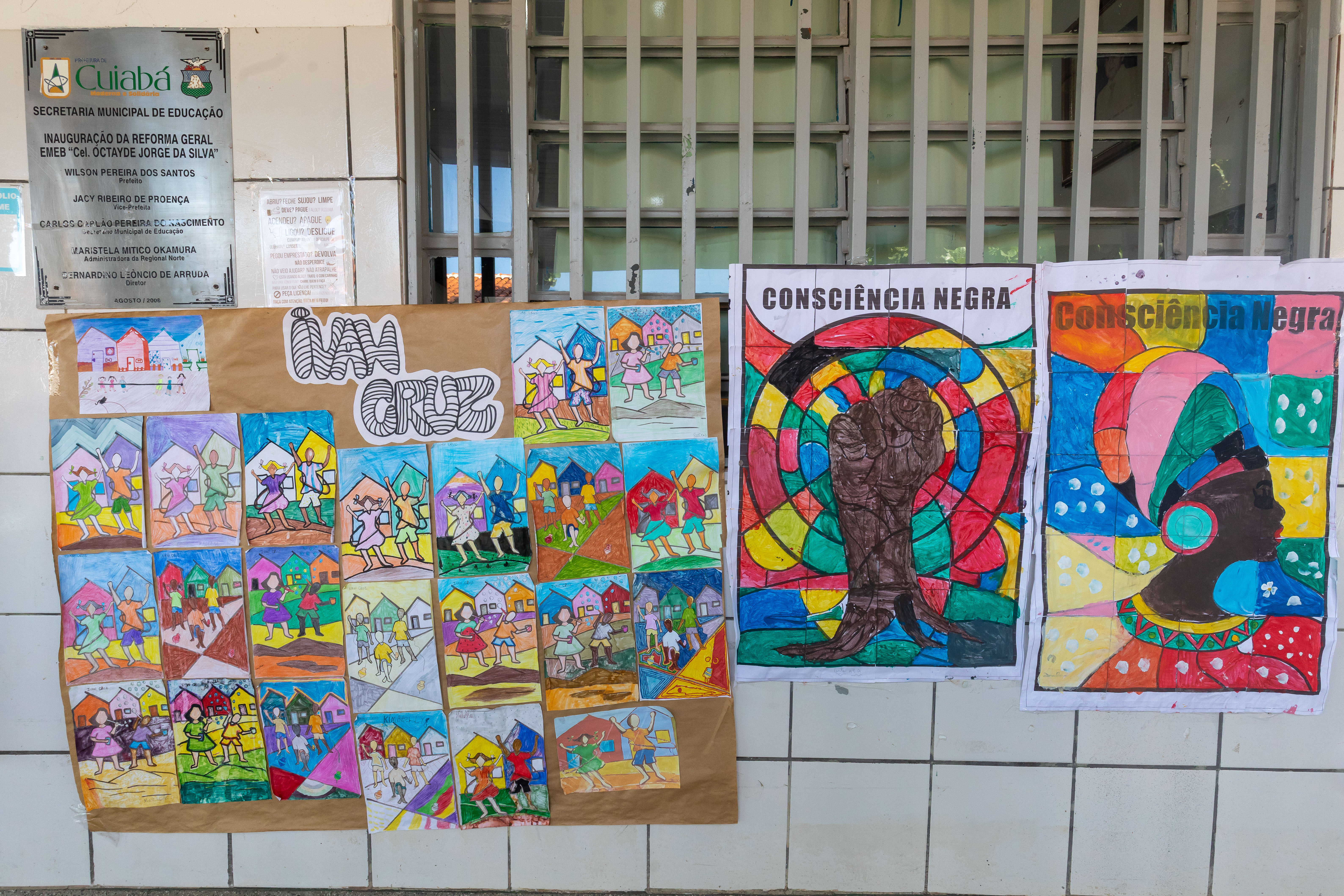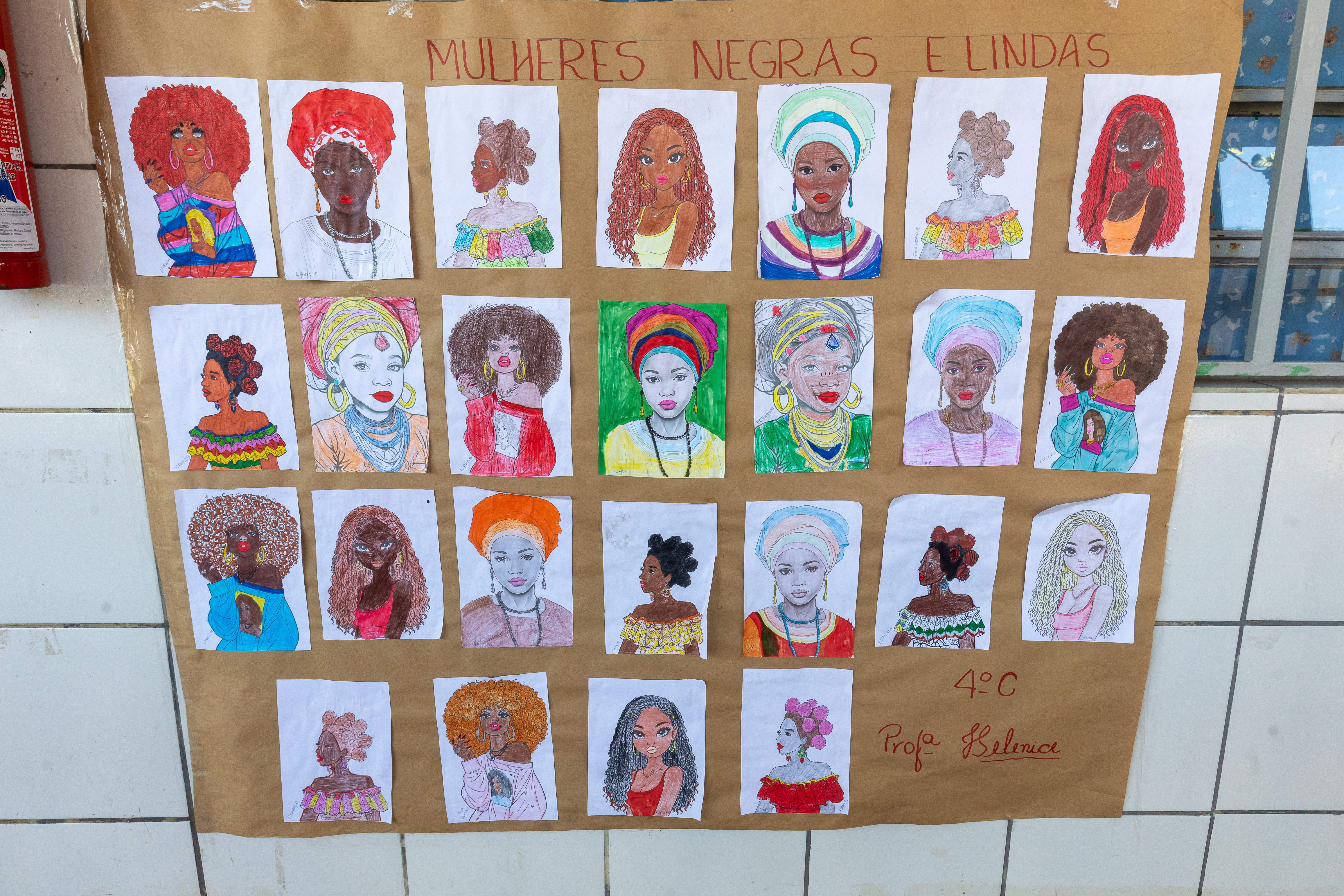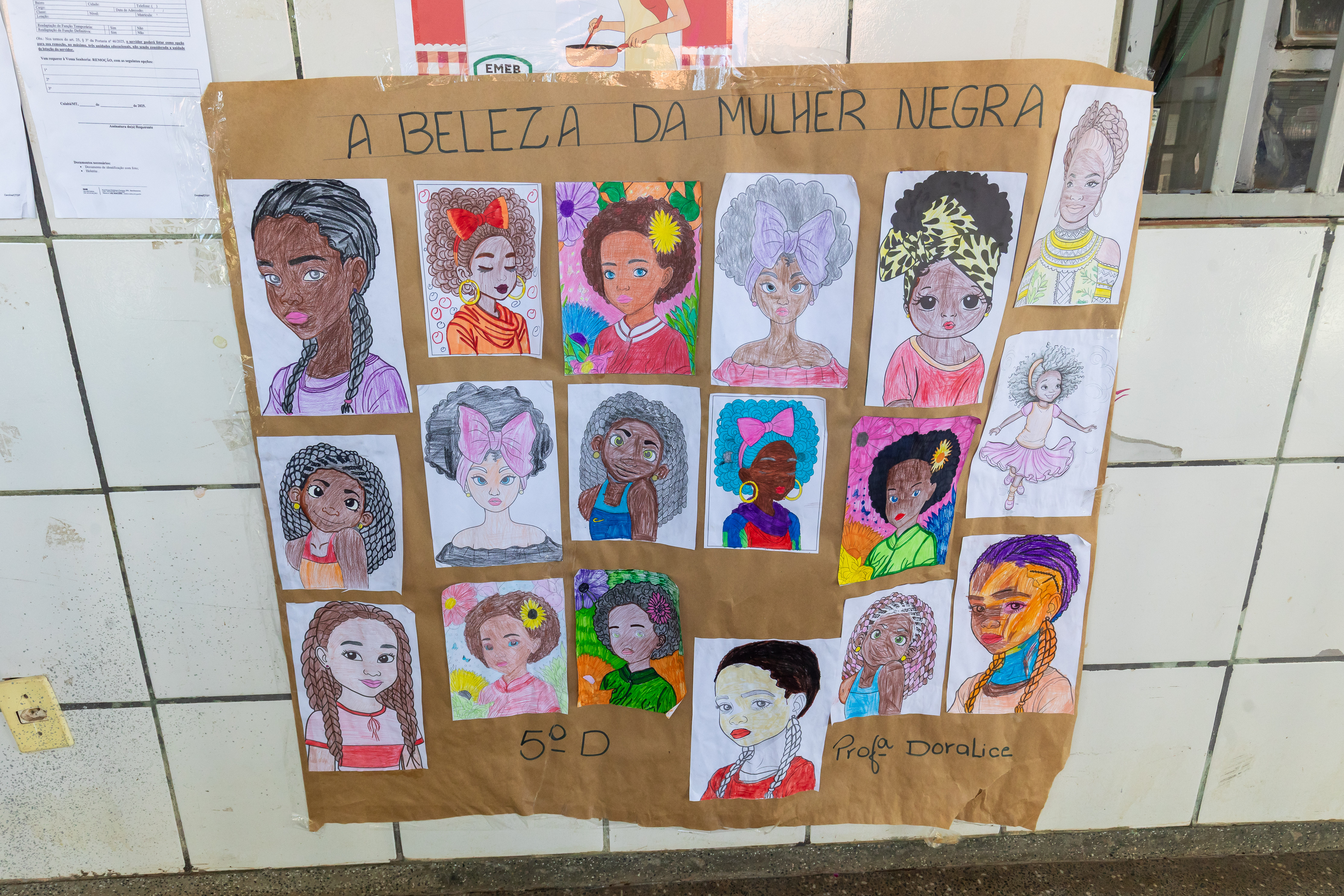 Um trabalho de valorização da beleza da mulher negra culminou numa exposição de arte produzida em cartolinas no pátio da Escola Municipal de Educação Básica (EMEB) Octayde Jorge da Silva, localizada no bairro Tancredo Neves.