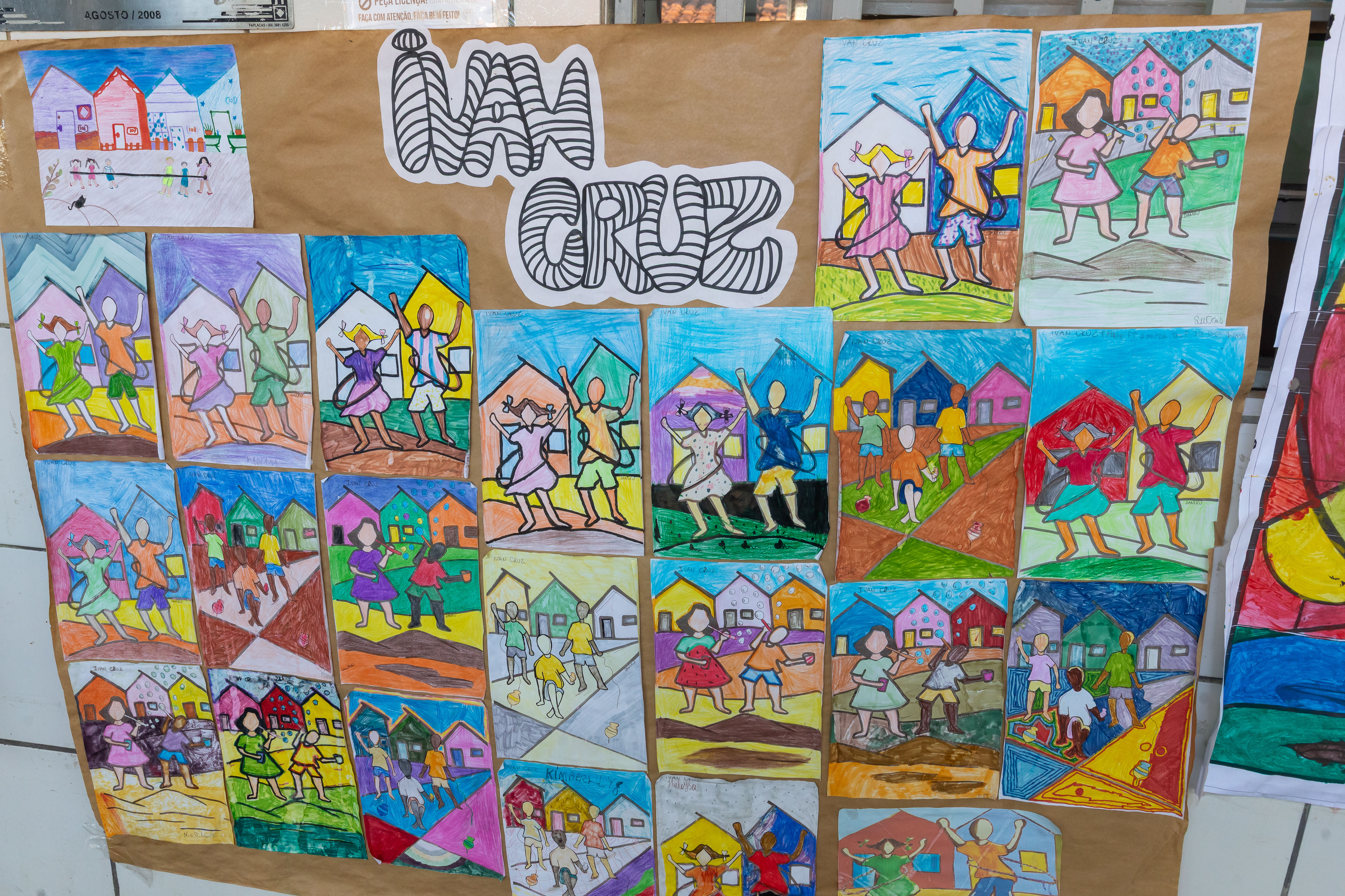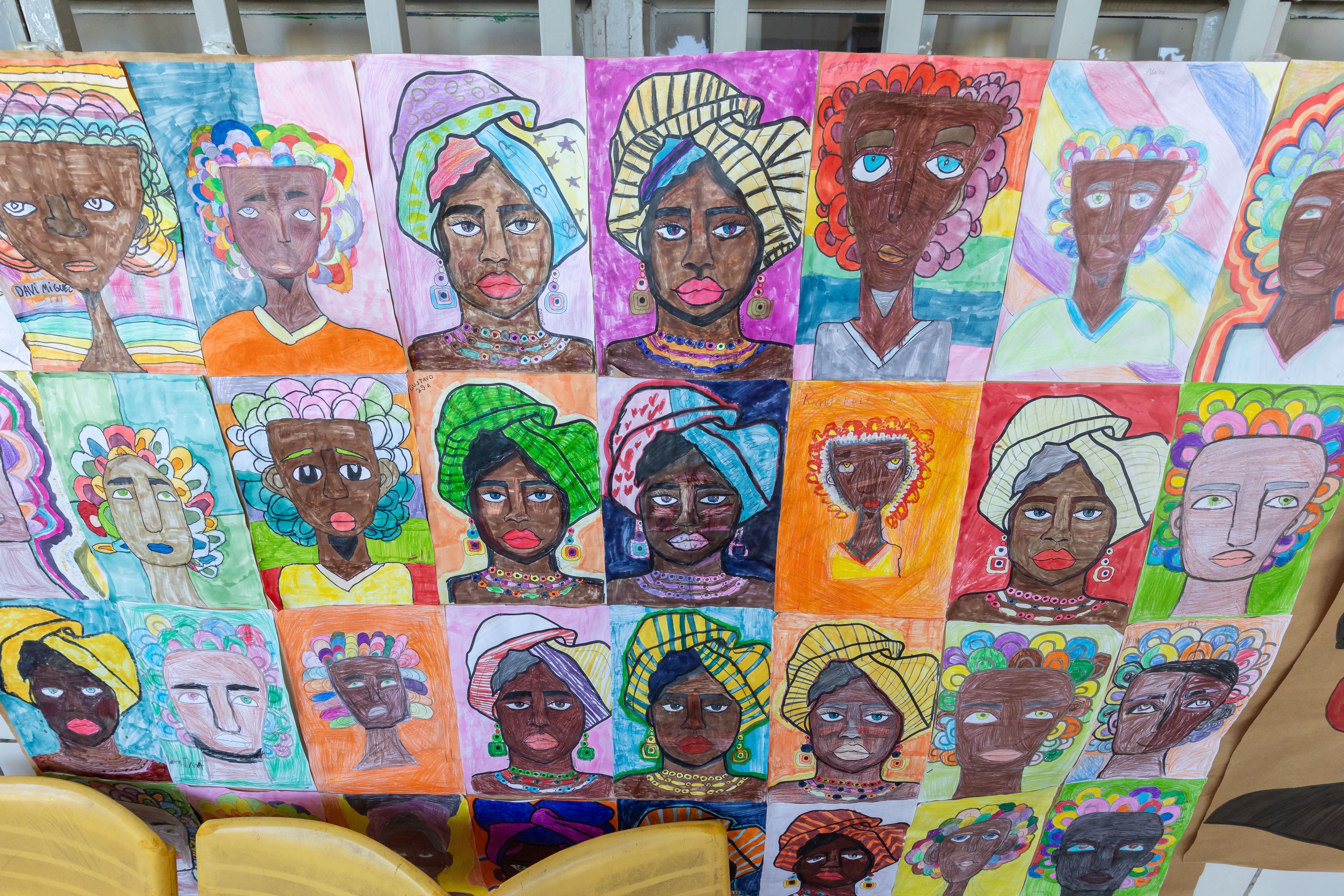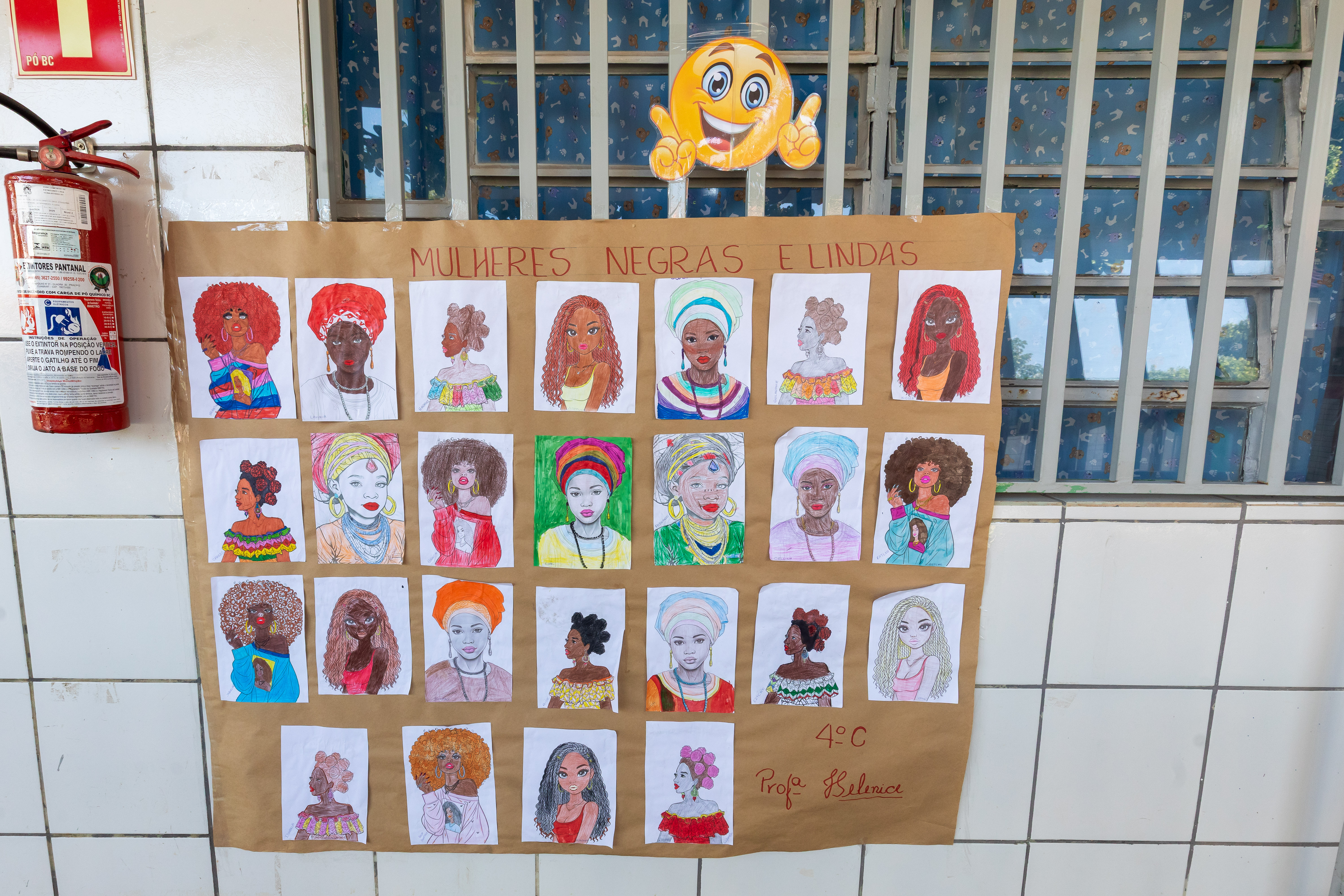 Um trabalho de valorização da beleza da mulher negra culminou numa exposição de arte produzida em cartolinas no pátio da Escola Municipal de Educação Básica (EMEB) Octayde Jorge da Silva, localizada no bairro Tancredo Neves.