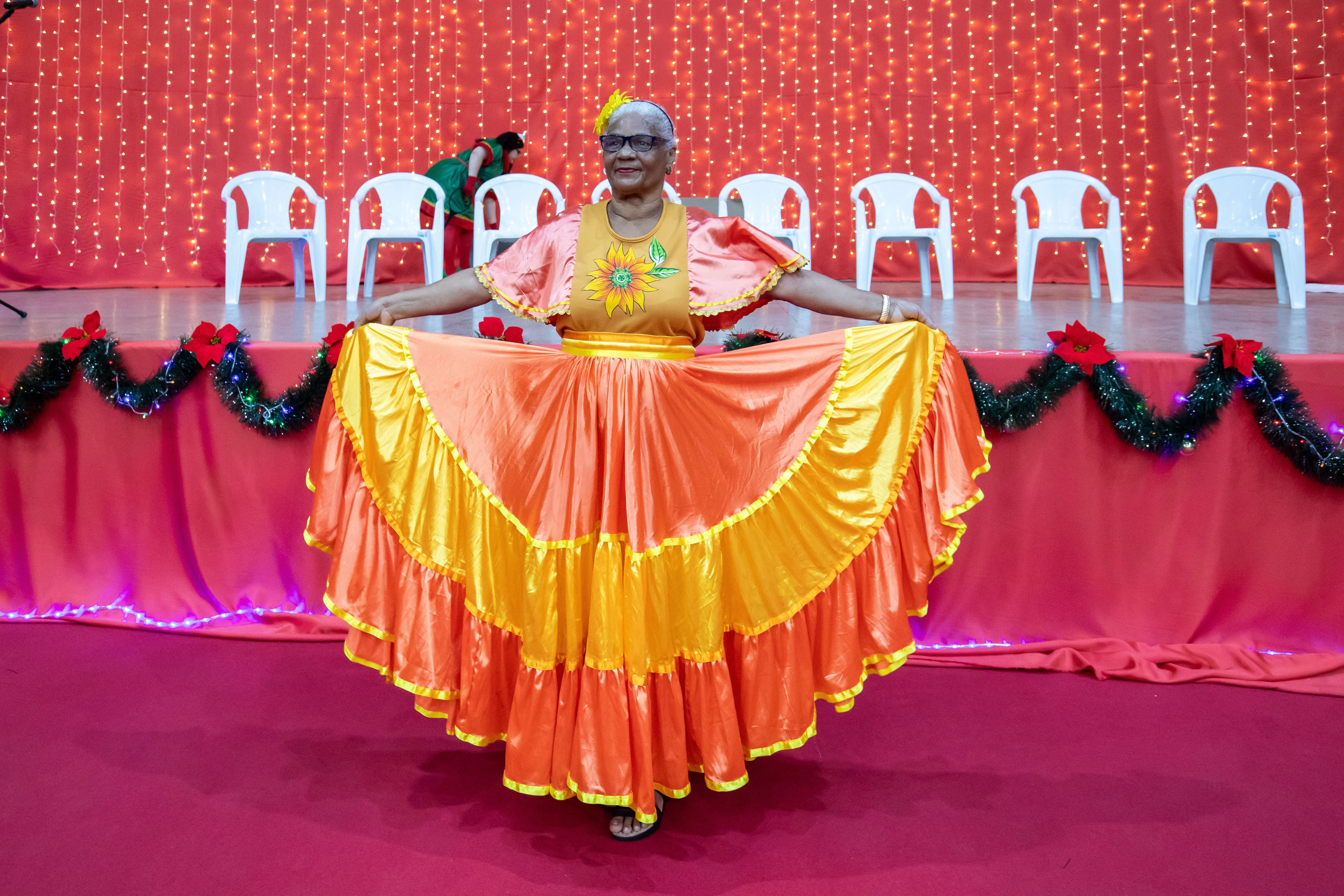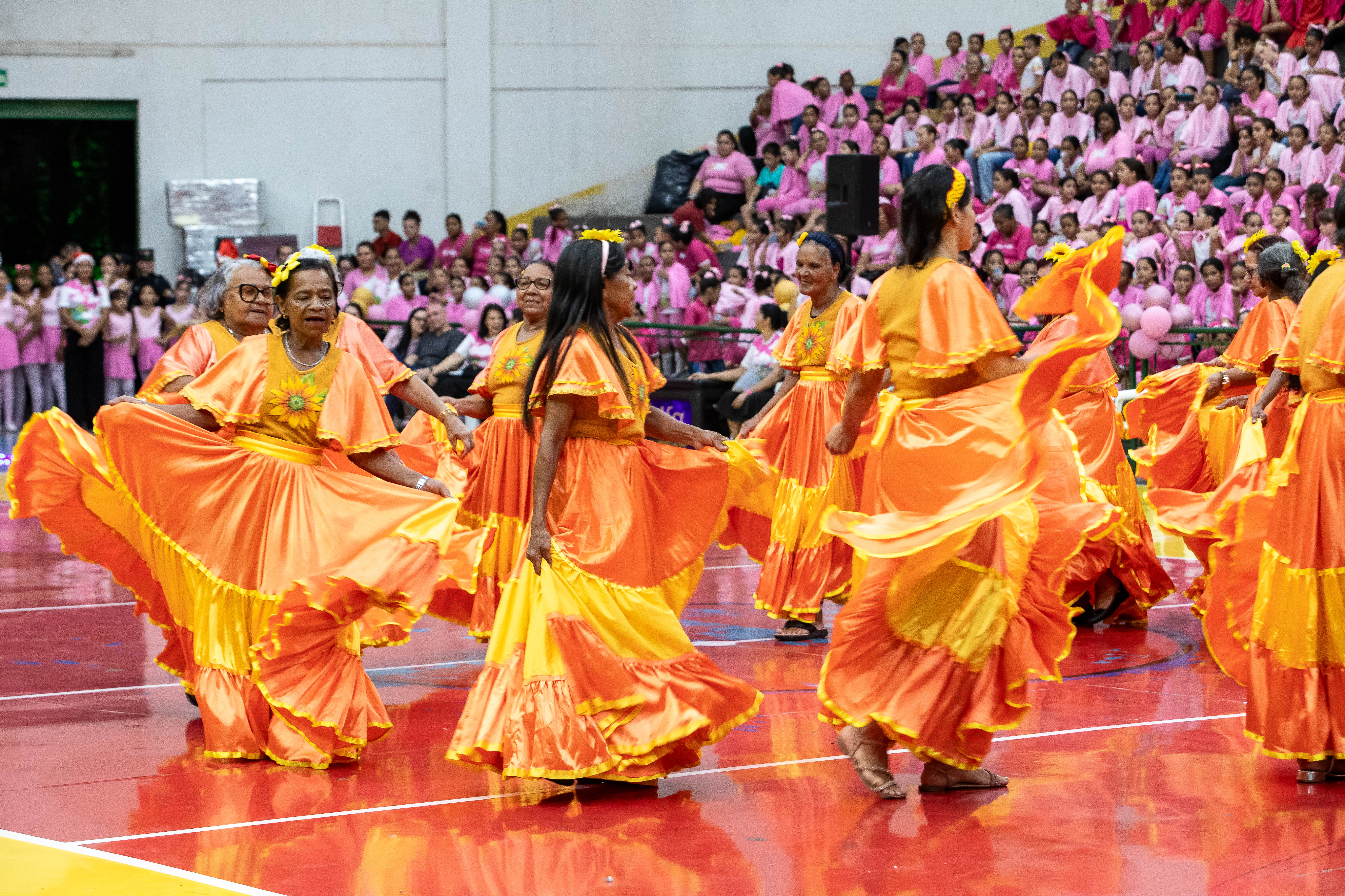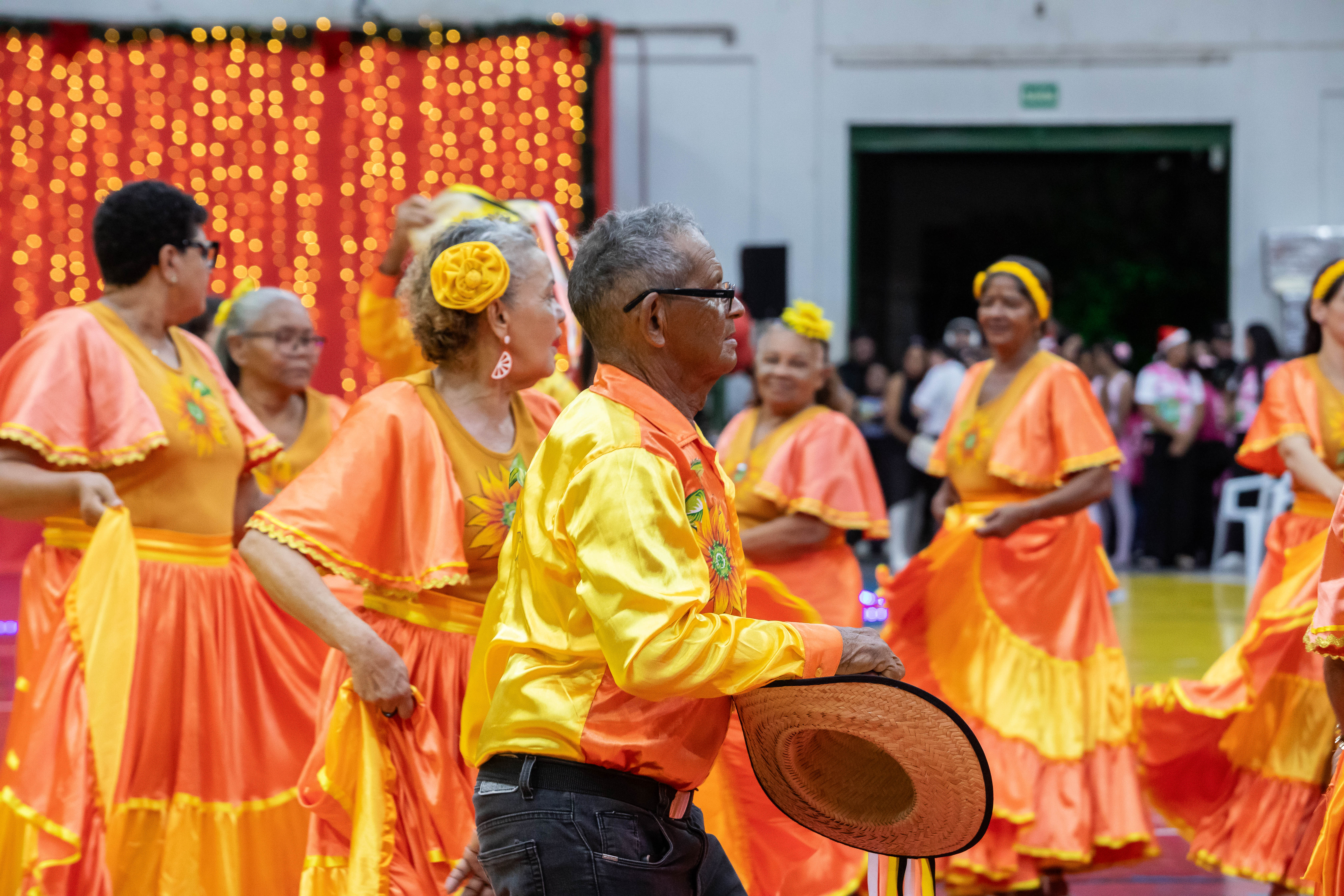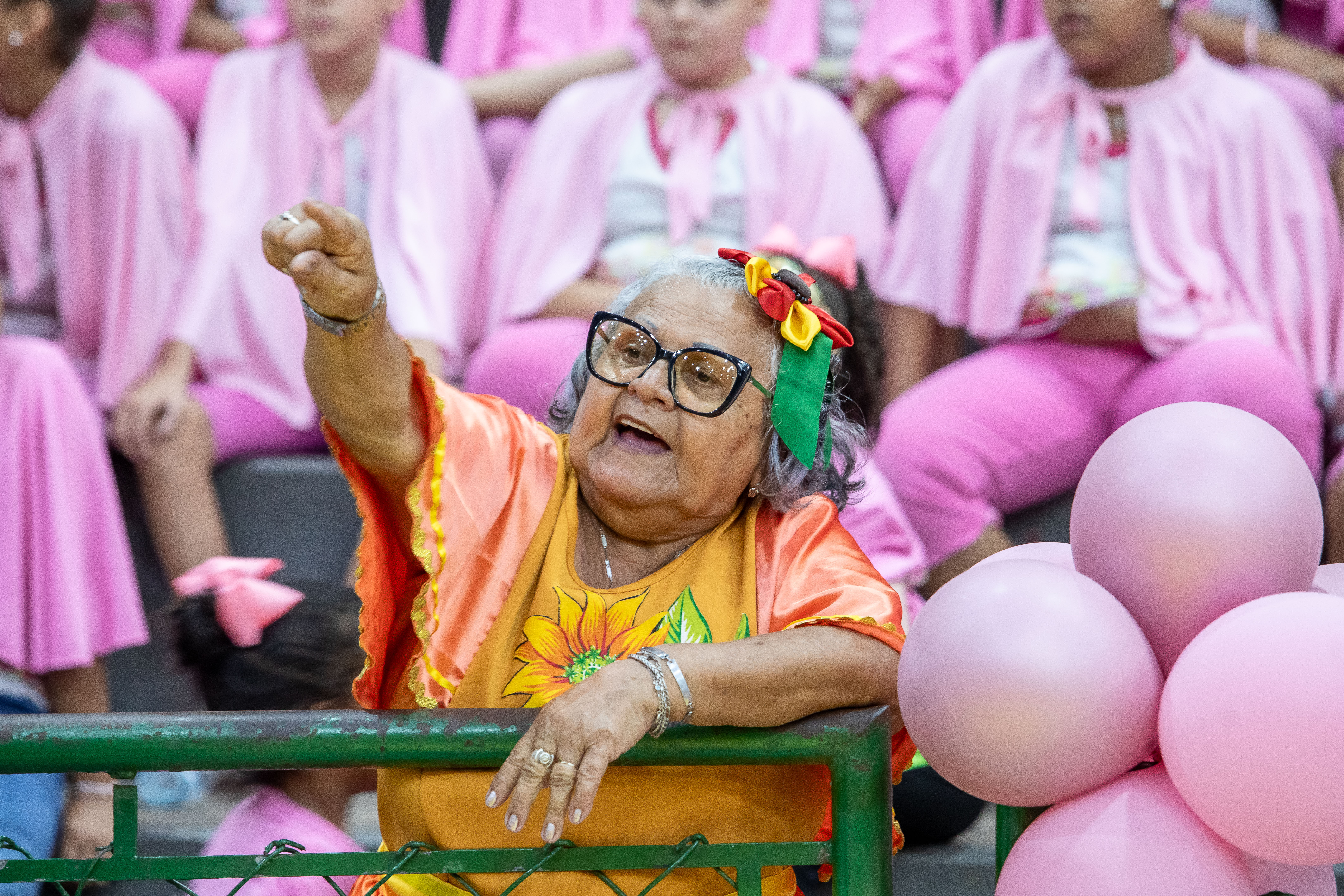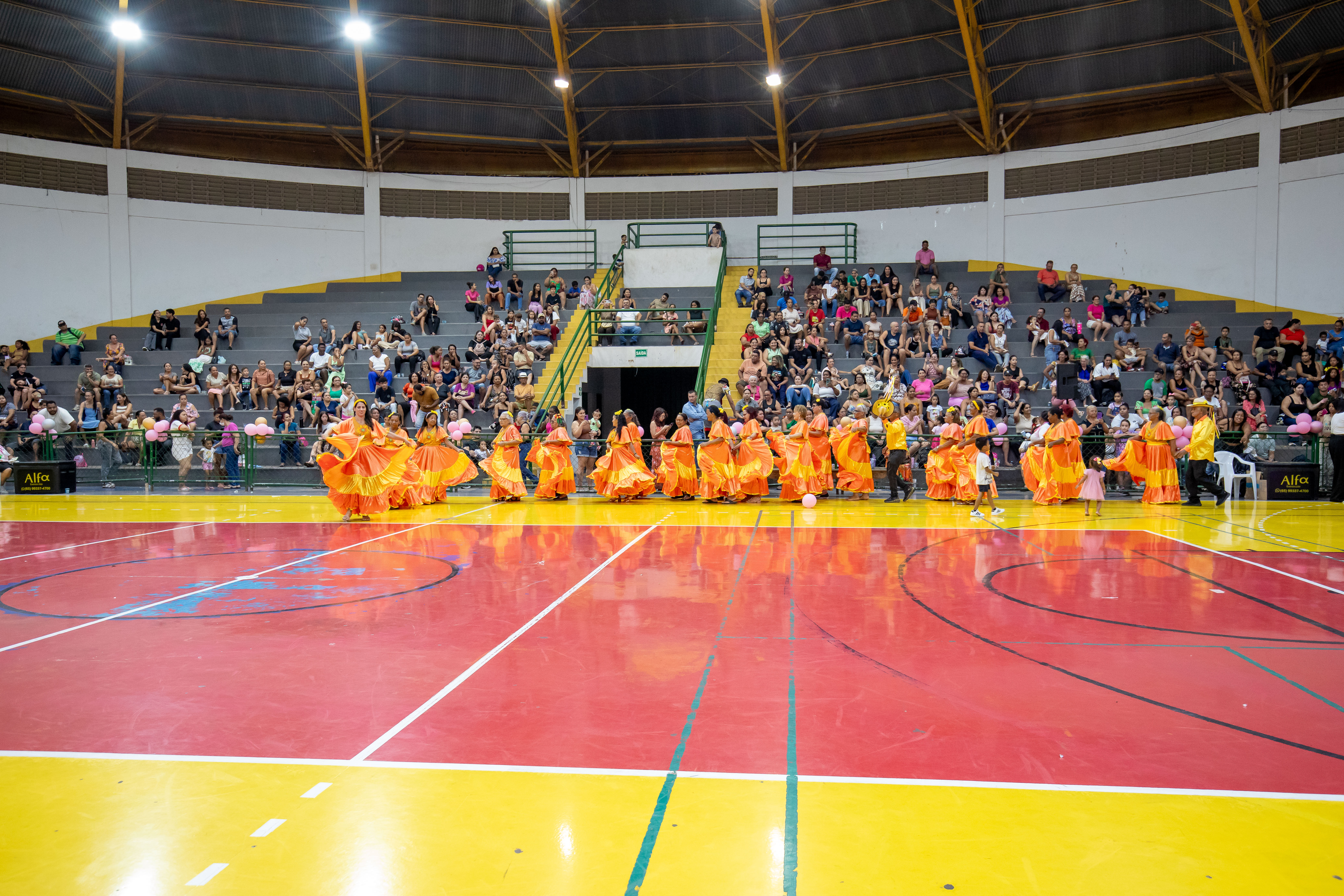 A segunda parte da noite ganhou contornos especiais. O Ginásio Verdinho se transformou em palco de encontros entre gerações, quando o grupo do CCI Padre Firmo entrou em cena com trajes típicos cuiabanos, coloridos e cheios de alegria. O siriri dos idosos arrancou aplausos demorados e sorrisos cúmplices, como quem reconhece na dança a memória viva da cidade.