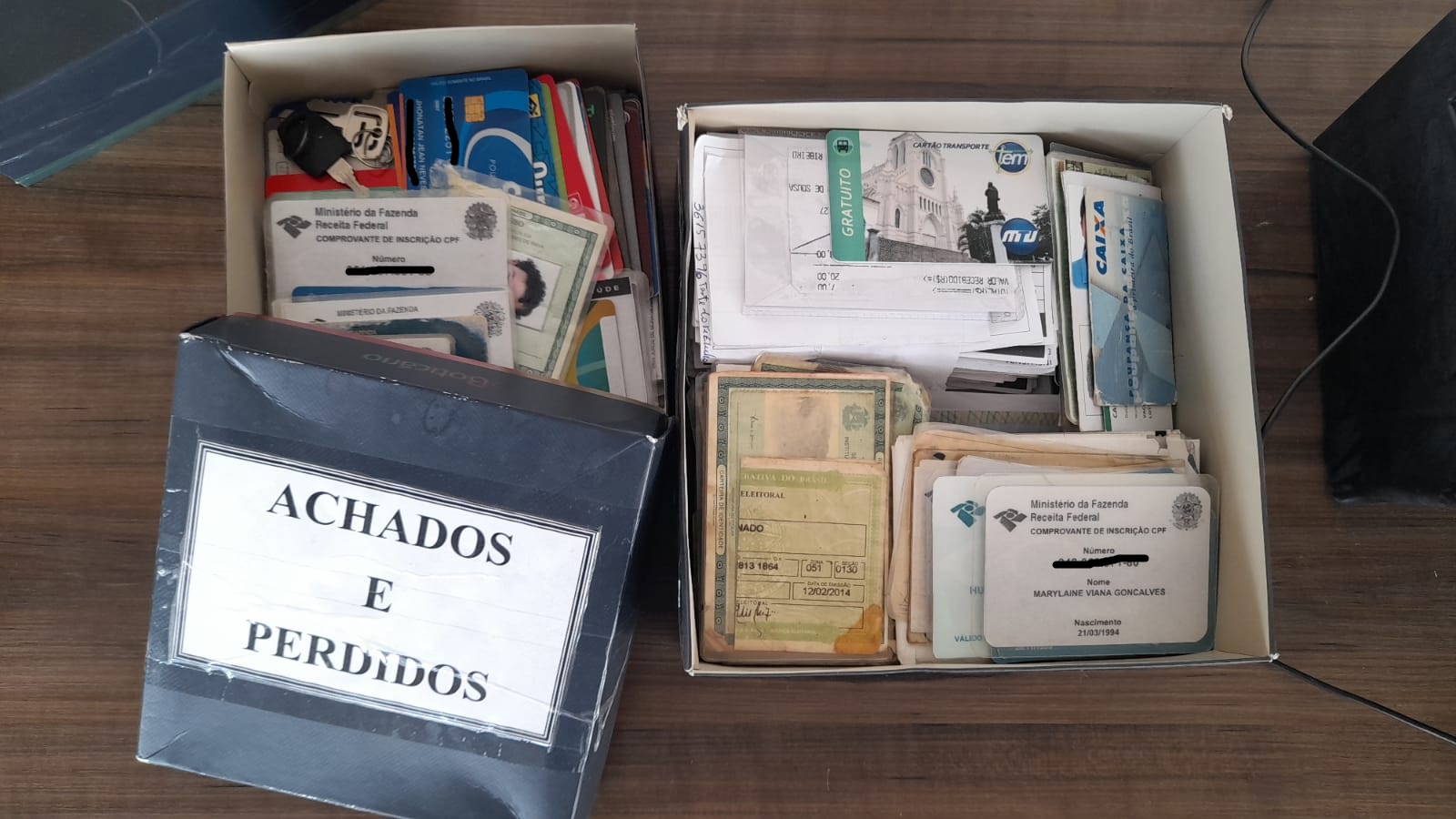 Quase 300 documentos e objetos pessoais esquecidos nos polos de vacinação encontram-se disponíveis para que seus donos os busquem no polo de vacinação da UNIC Beira Rio. São mais de 120 cadernetas de vacinação, quase 100 cartões do SUS, quase 40 CPFs e RGs (sendo um de menor, mastigado pela metade), mais de 20 cartões de banco, além de ticket alimentação, Carteiras Nacionais de Habilitação (CNHs), carteira de trabalho, documento de carro, títulos de eleitor, comprovantes de votação, cartão de marcação de consulta do Hospital Universitário Júlio Muller, uma carteirinha de estudante de Medicina da UNIC, cópia de certidão de nascimento, cartões de planos de saúde e de farmácia, conta de energia elétrica e de água, um cartão de registro no Conselho Regional de Fisioterapia, cartão de vacina da Unimed, cartão de transporte, um CIC, cartão do MultiPark, crachá funcional, fotos 3x4 e até molhos de chaves.