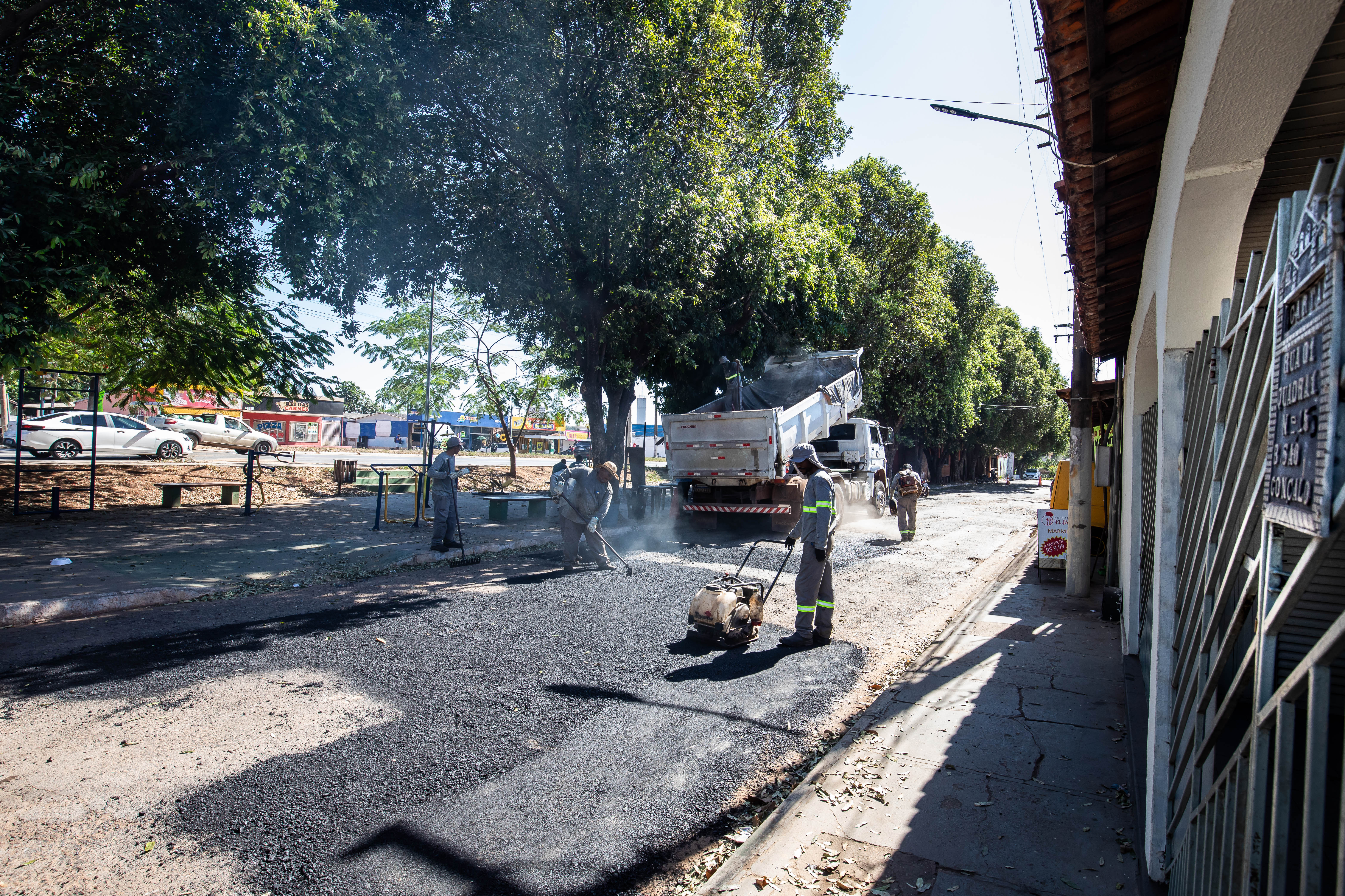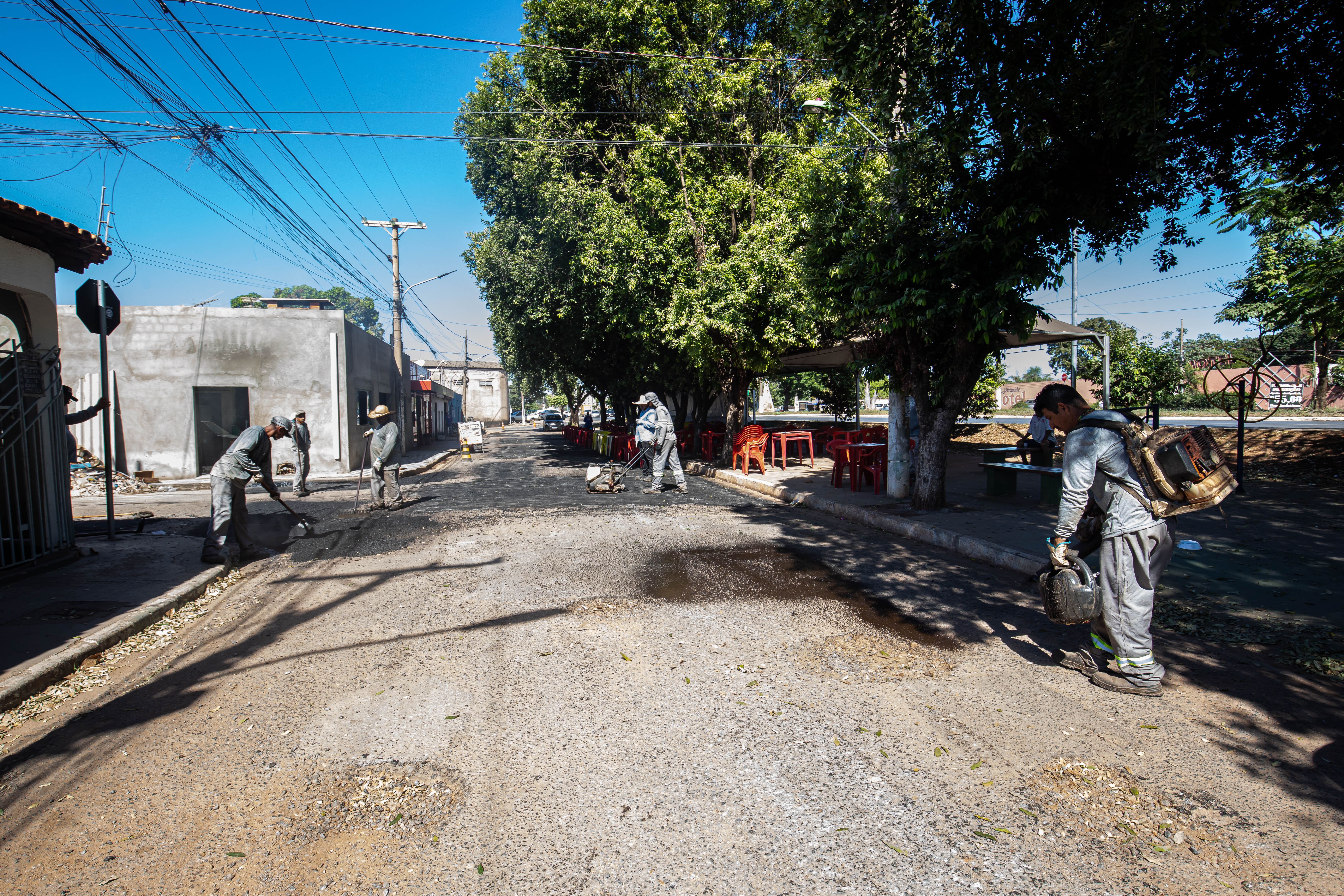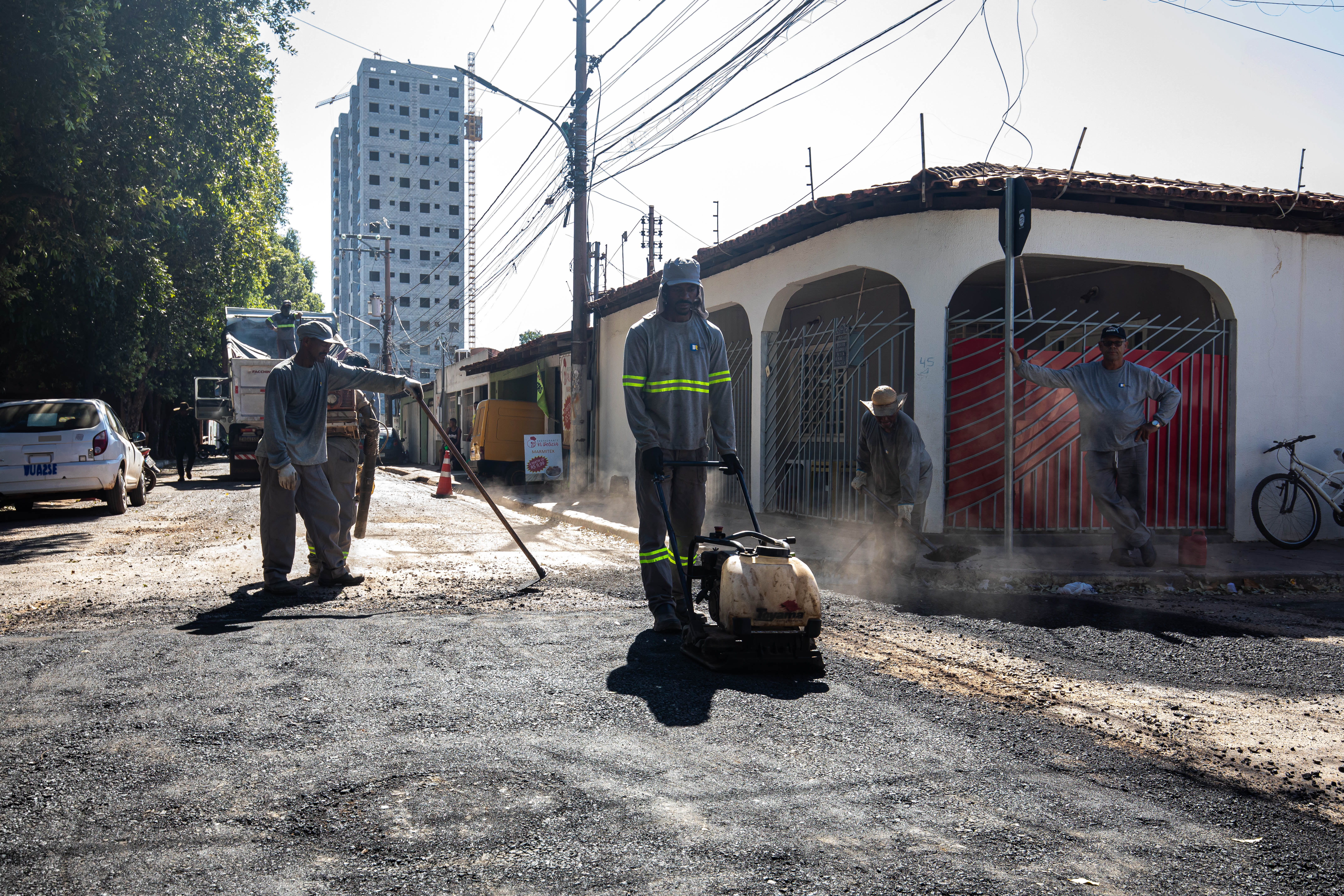 O serviço tem início com o preparo das vias, que inclui a limpeza da área com motobomba. Em alguns casos, é necessário remover a umidade do solo com o apoio de caminhão-pipa. Na sequência, é aplicado o concreto betuminoso usinado a quente (CBUq), material utilizado por sua alta resistência e durabilidade. O procedimento é finalizado com o rastelamento e a compactação da massa asfáltica, utilizando rolo compactador para nivelamento e acabamento.