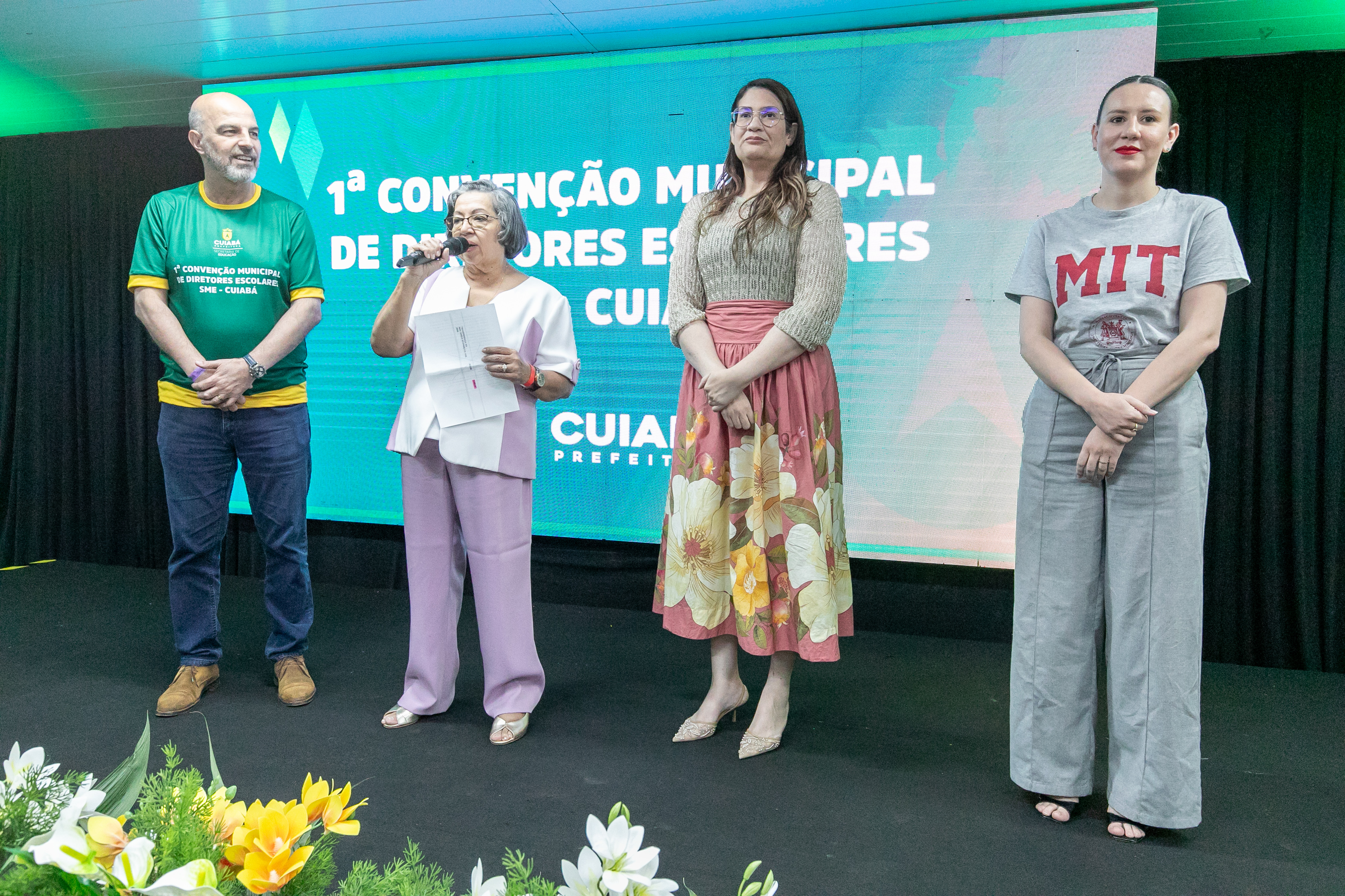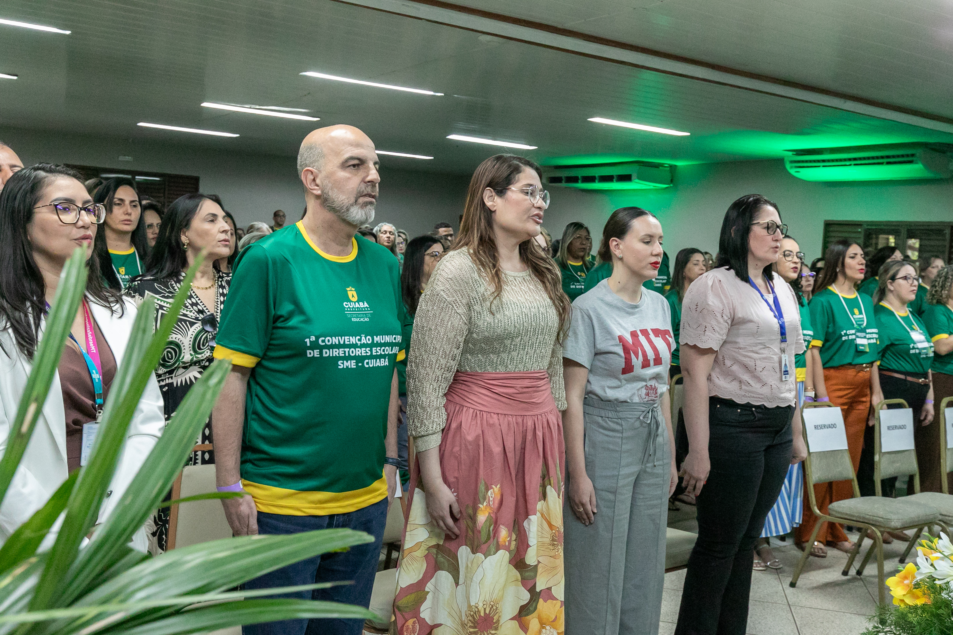A foto ilustra o secretário Amauri Monge, vestido com camisa verde e detalhe amarelo que exibe a logotipo da Prefeitura de Cuiabá e letras que compõem a palavra "1ª Convenção Municipal de Diretores Escolares - SME Cuiabá". Ao lado, estão três mulheres. Todos estão em posição de marcha para ouvir o hino nacional.