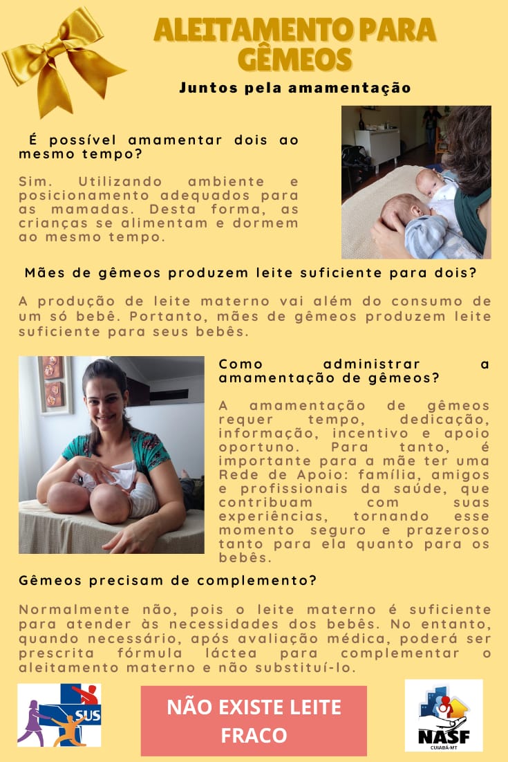 Isso tem ocorrido em várias unidades básicas de saúde com a realização de palestras, oficinas e rodas de conversa entre pacientes e profissionais da saúde e também com a divulgação de material educativo no formato cartão digital, preparado pela equipe do NASF Cuiabá e divulgado através de aplicativo de mensagem às pacientes. Ao final desta matéria, baixe os materiais sobre benefícios da amamentação para o bebê e a mãe, amamentação de gêmeos, ingurgitamento da mama, alimentação saudável para gestantes, uso de fitoterápicos na lactação.