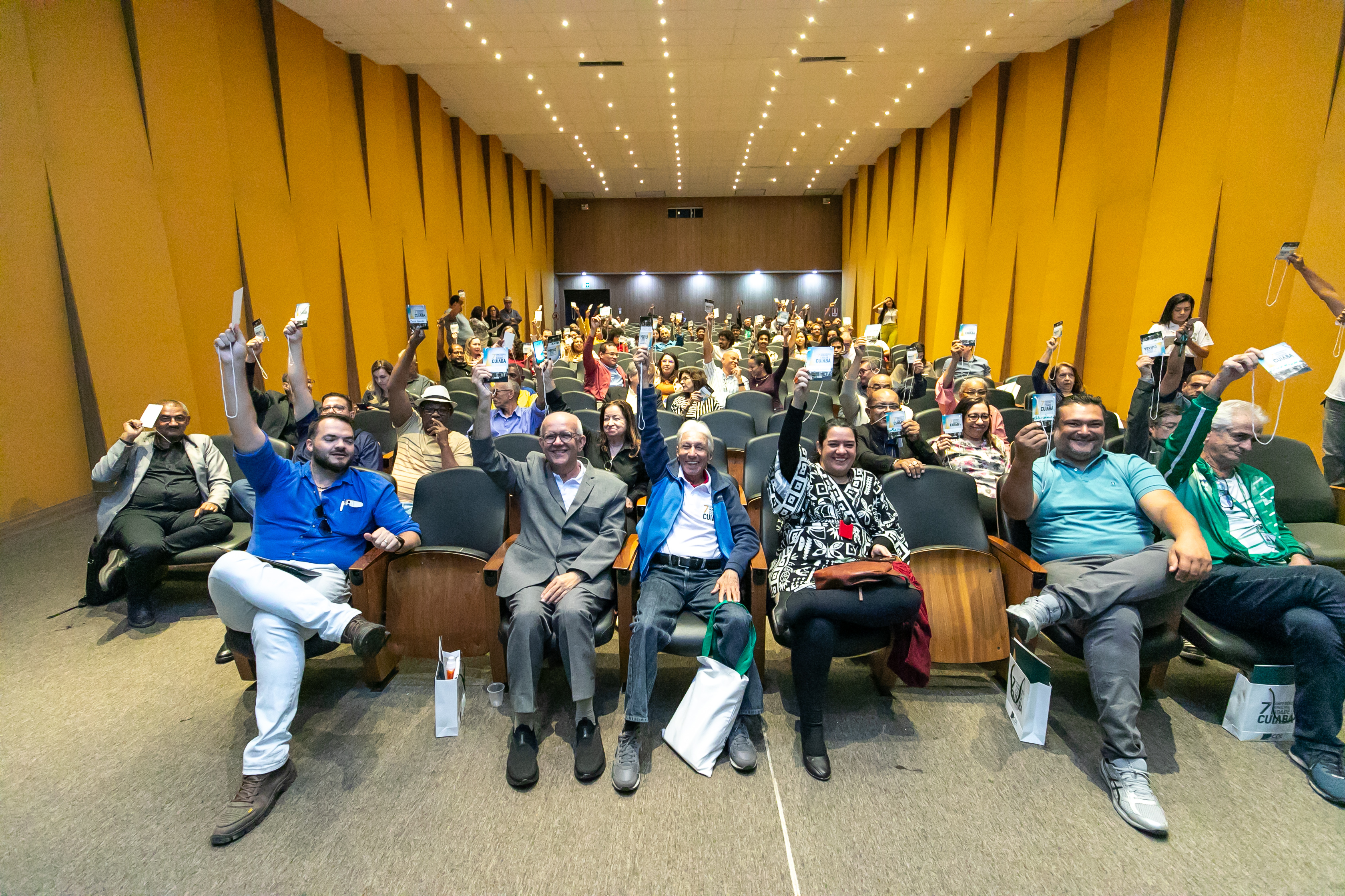 A foto ilustra um auditório com populares, empresários e autoridades sentados em cadeiras almofadadas, prestando atenção a uma palestra.