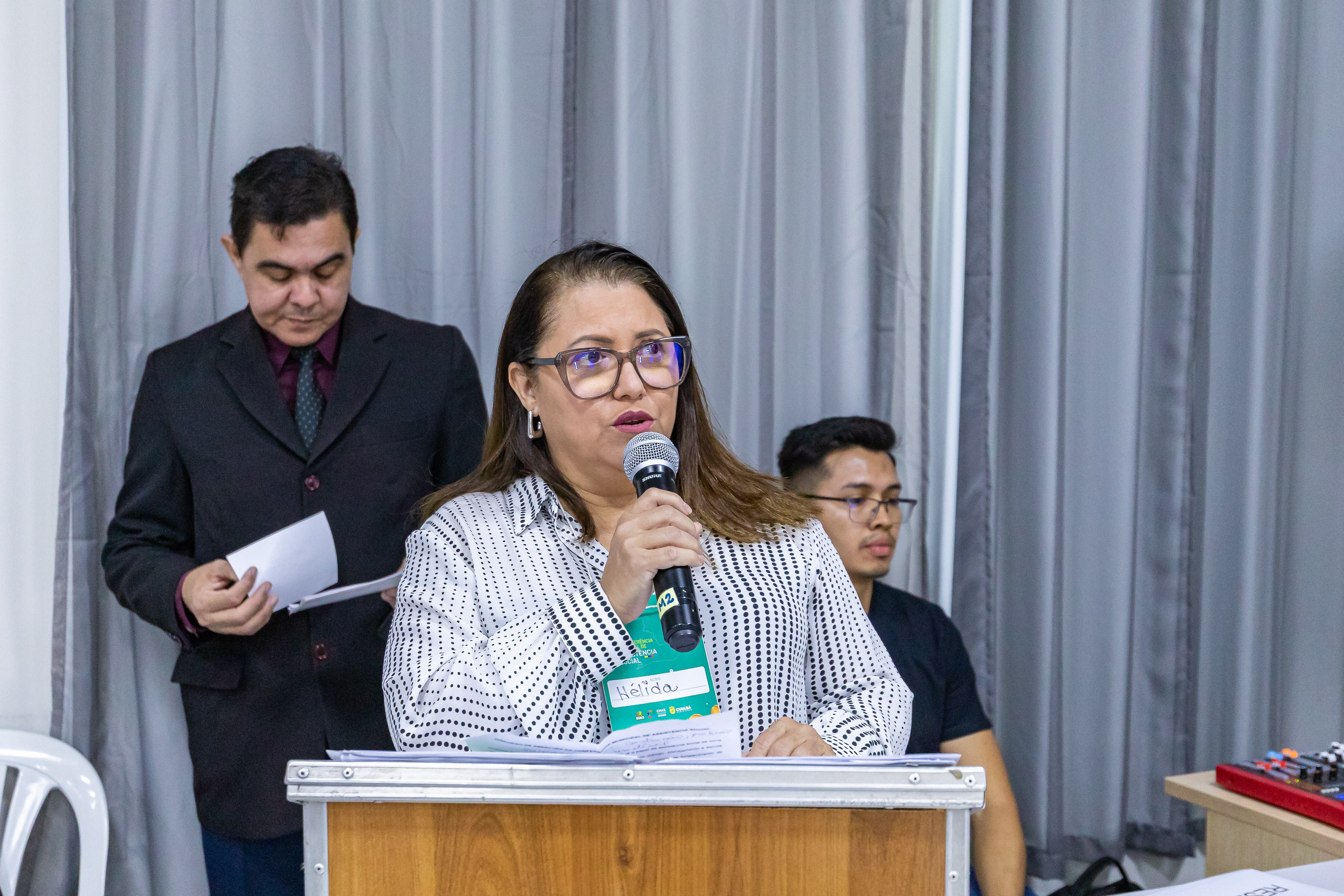 Na imagem principal está a secretária Hélida no primeiro plano com um microfone discursando e abrindo oficialmente os trabalhos da 15ª Conferência do SUAS. Ao fundo estão dezenas de servidores ouvindo atentamente as palavras da representante do poder executivo municipal.