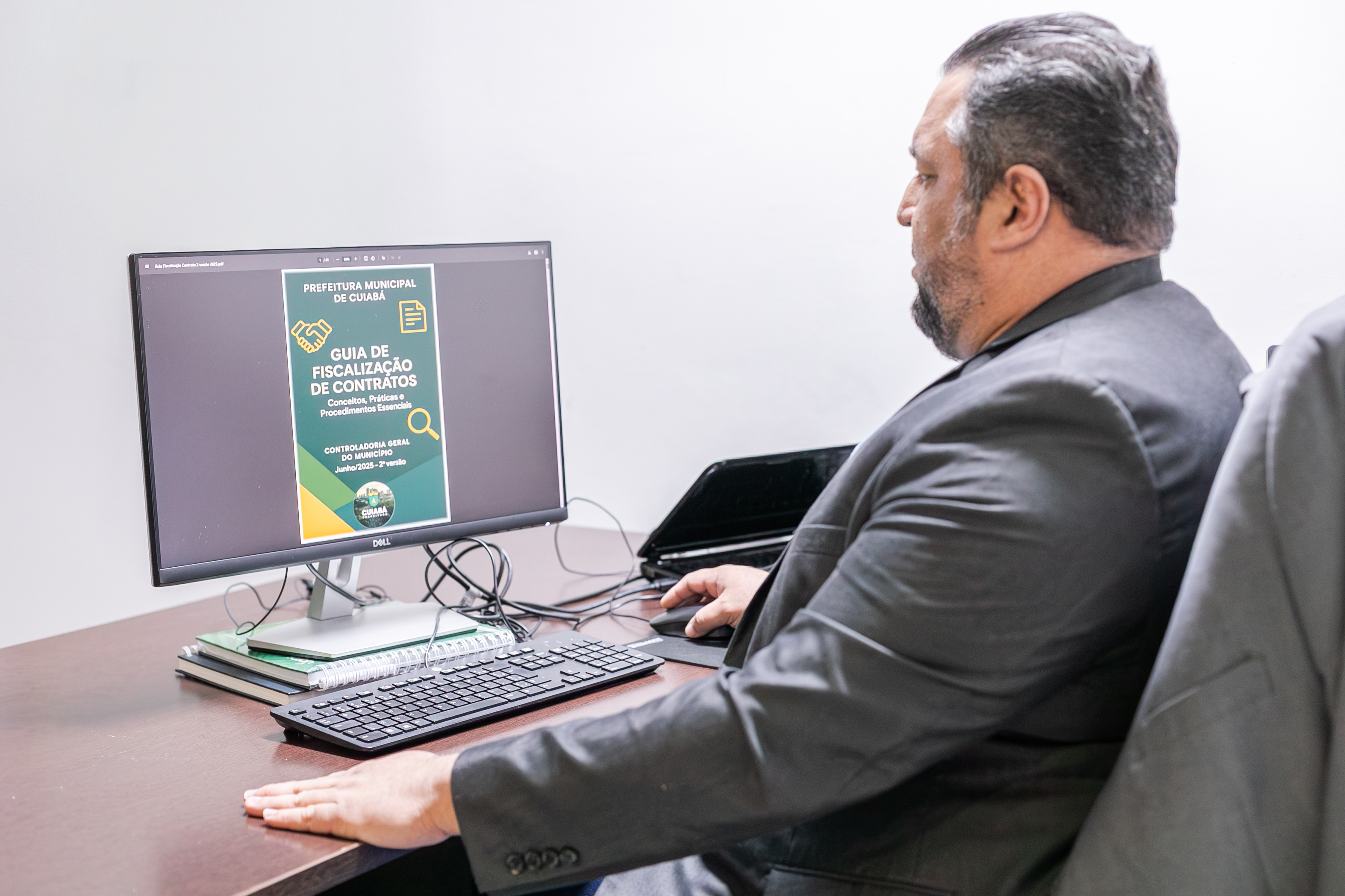 A foto mostra o controlador geral do município a frente do computador com o Guia Prático de Fiscalização de Contratos na tela.