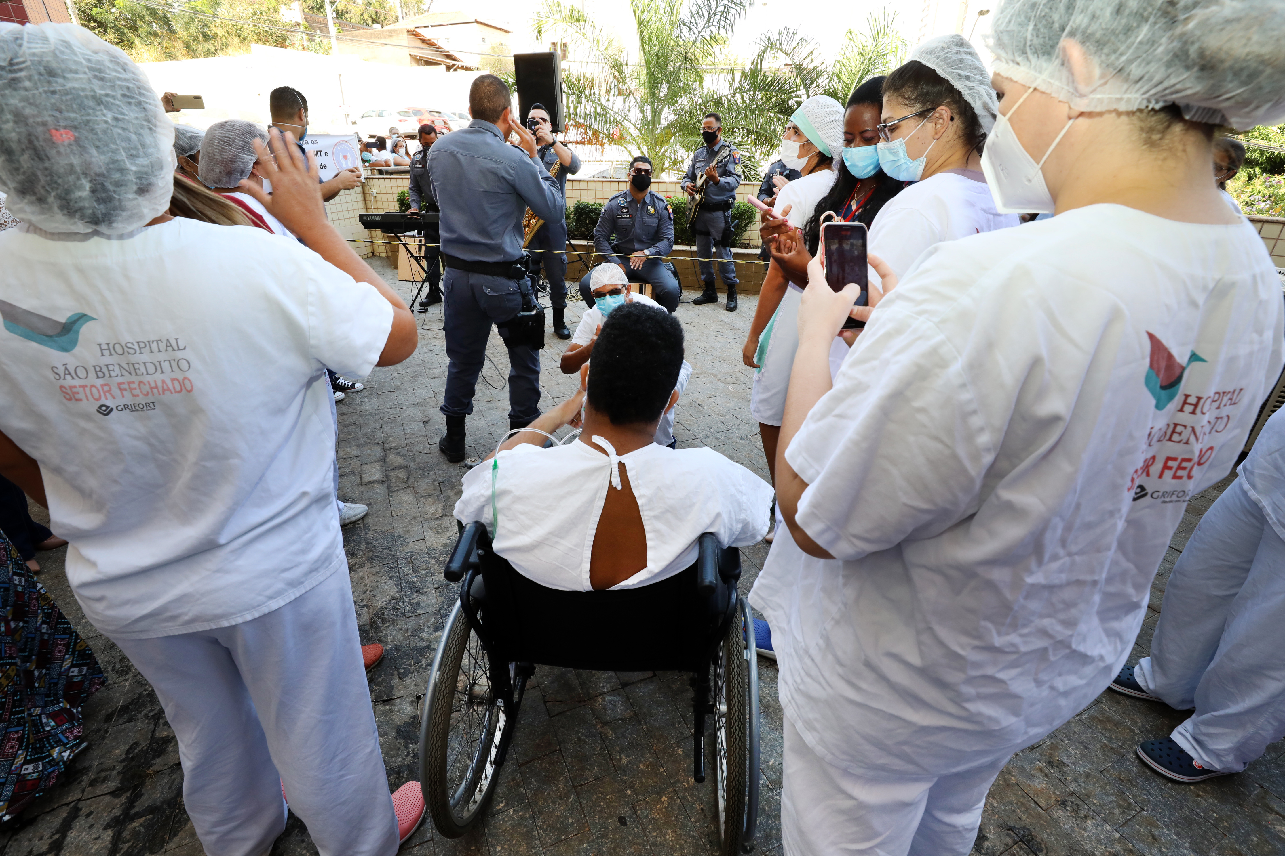 O enfermeiro Benedito de Arruda, que trabalha no Hospital São Benedito desde 2015, conta que a apresentação do Corpo Musical da PM foi uma ótima iniciativa. “Foi muito interessante fugir um pouco da realidade dessa pandemia, que não é fácil. É um momento de alegria pra equipe de enfermagem”, disse. Ele conta que é pai de coração de dois sobrinhos que ajuda a criar e que, por conta do trabalho, acaba não tendo muito tempo para relaxar com a família. “Nós ficamos mais tempo fora de casa do que com a família. E isso é um alívio mental pra gente”, conta.