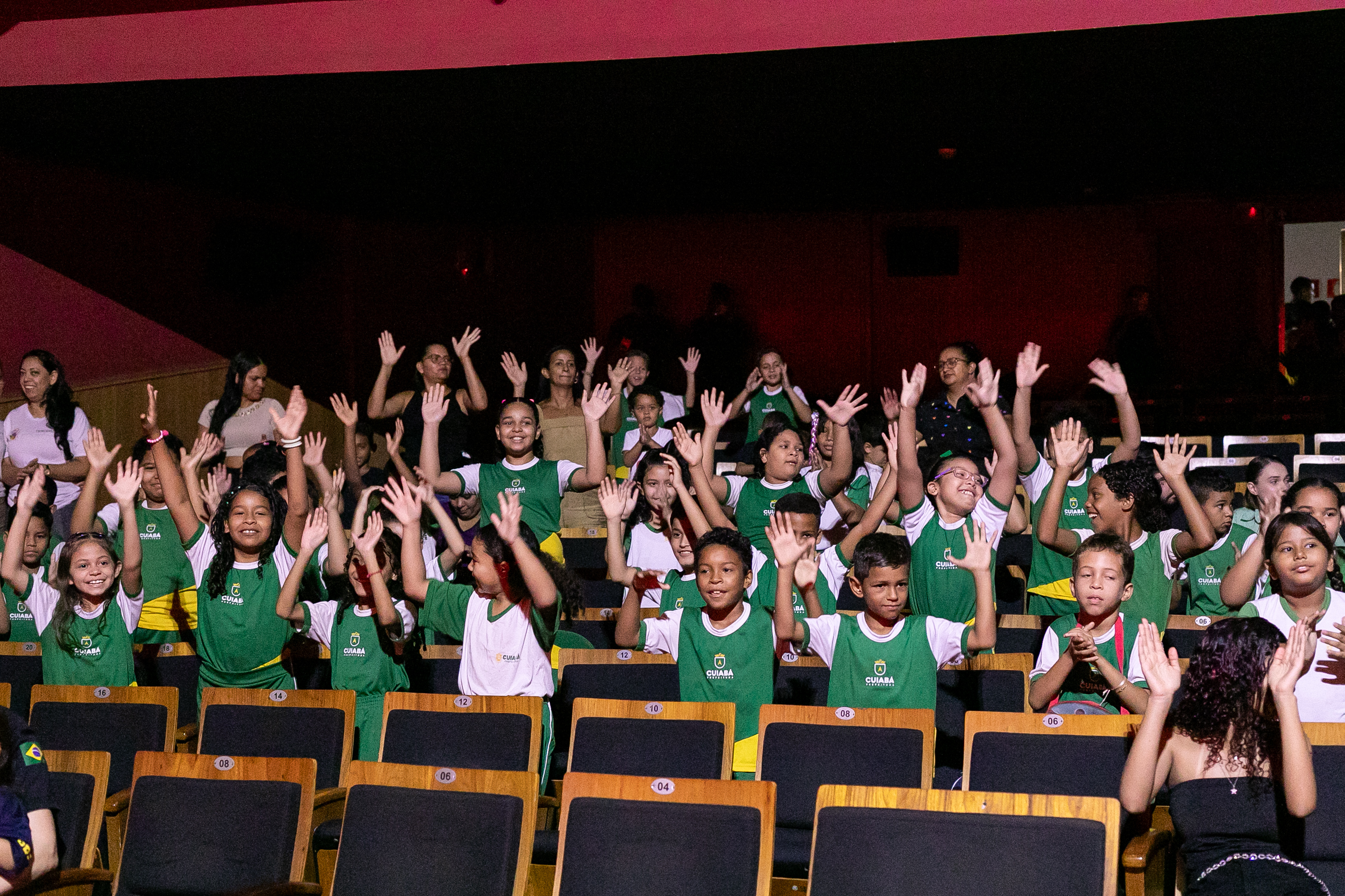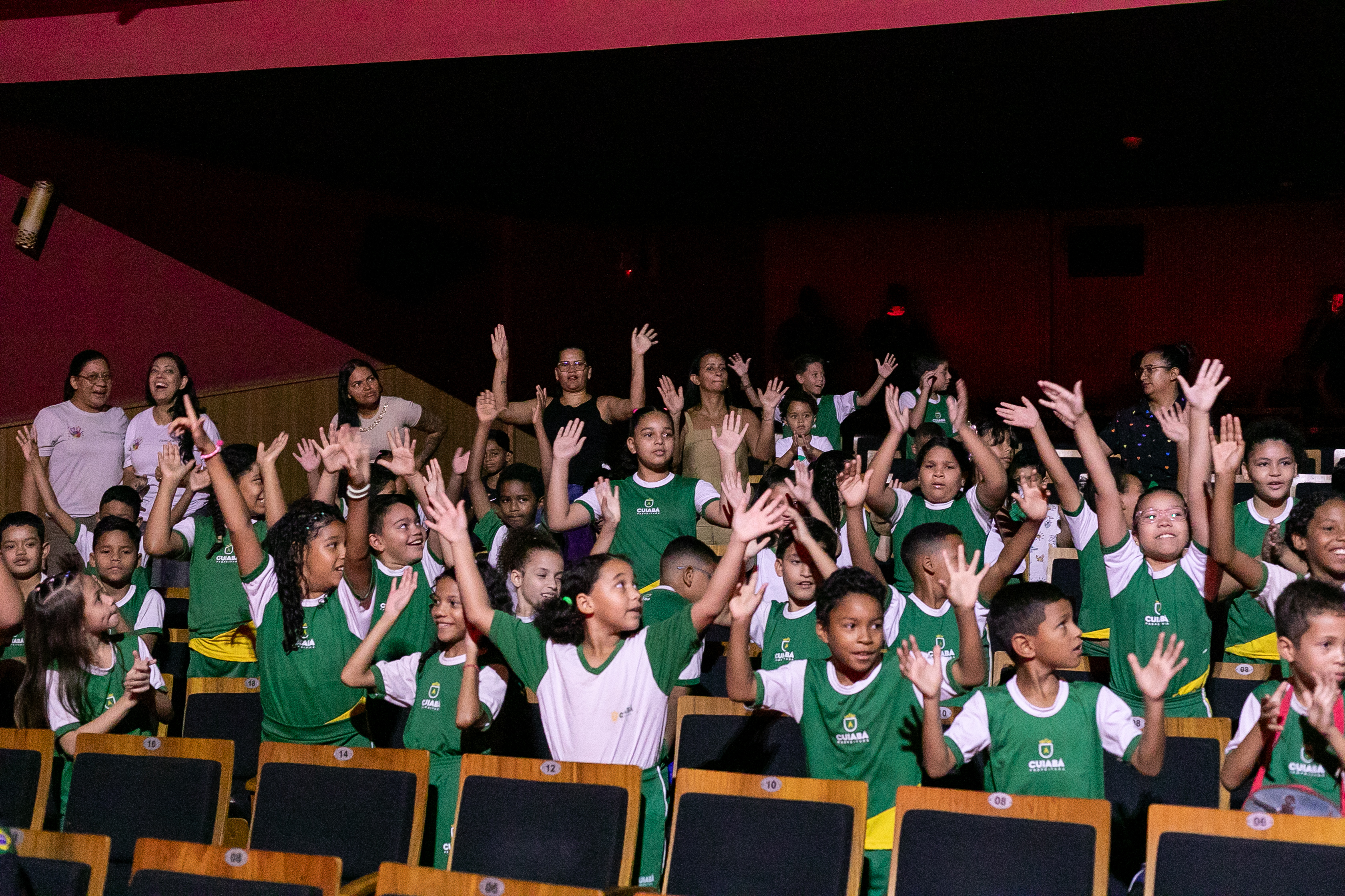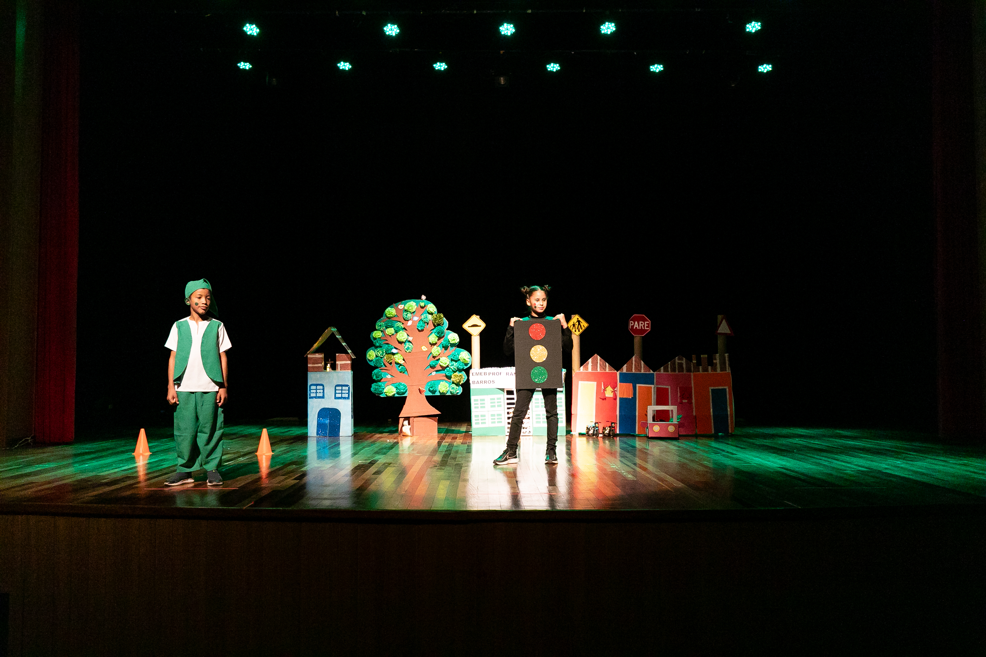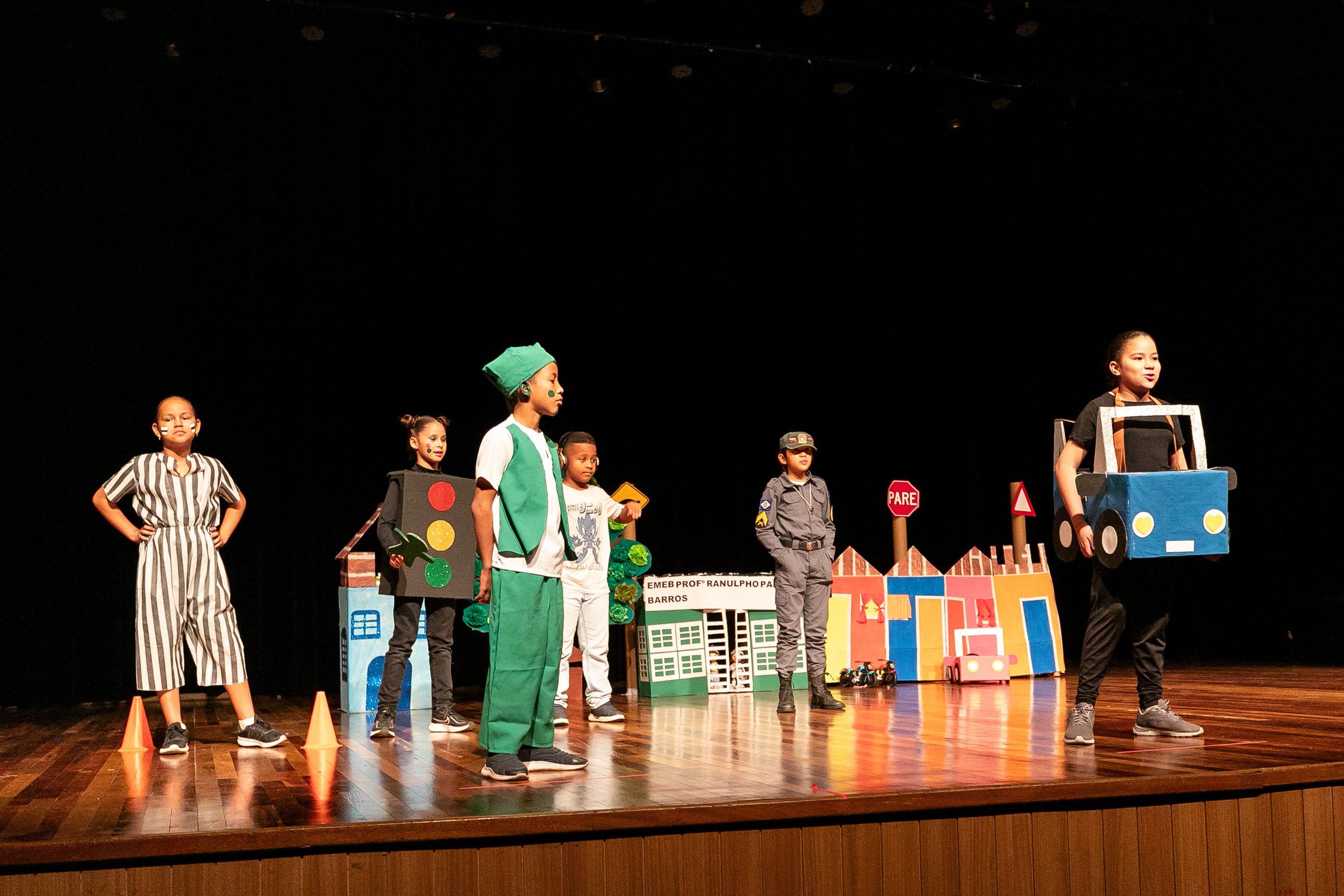 Estudantes matriculados na escola pública de Cuiabá, Ranulpho Paes de Barros, com idades entre 7 e 8 anos, foram protagonistas, na manhã desta terça-feira (30), da peça de teatro “Trânsito Mágico da Cidade Encantada”, apresentada no Cine Teatro. Trata-se da segunda etapa estadual da 20ª edição do Festival Temático de Teatro para o Trânsito (Fetran).