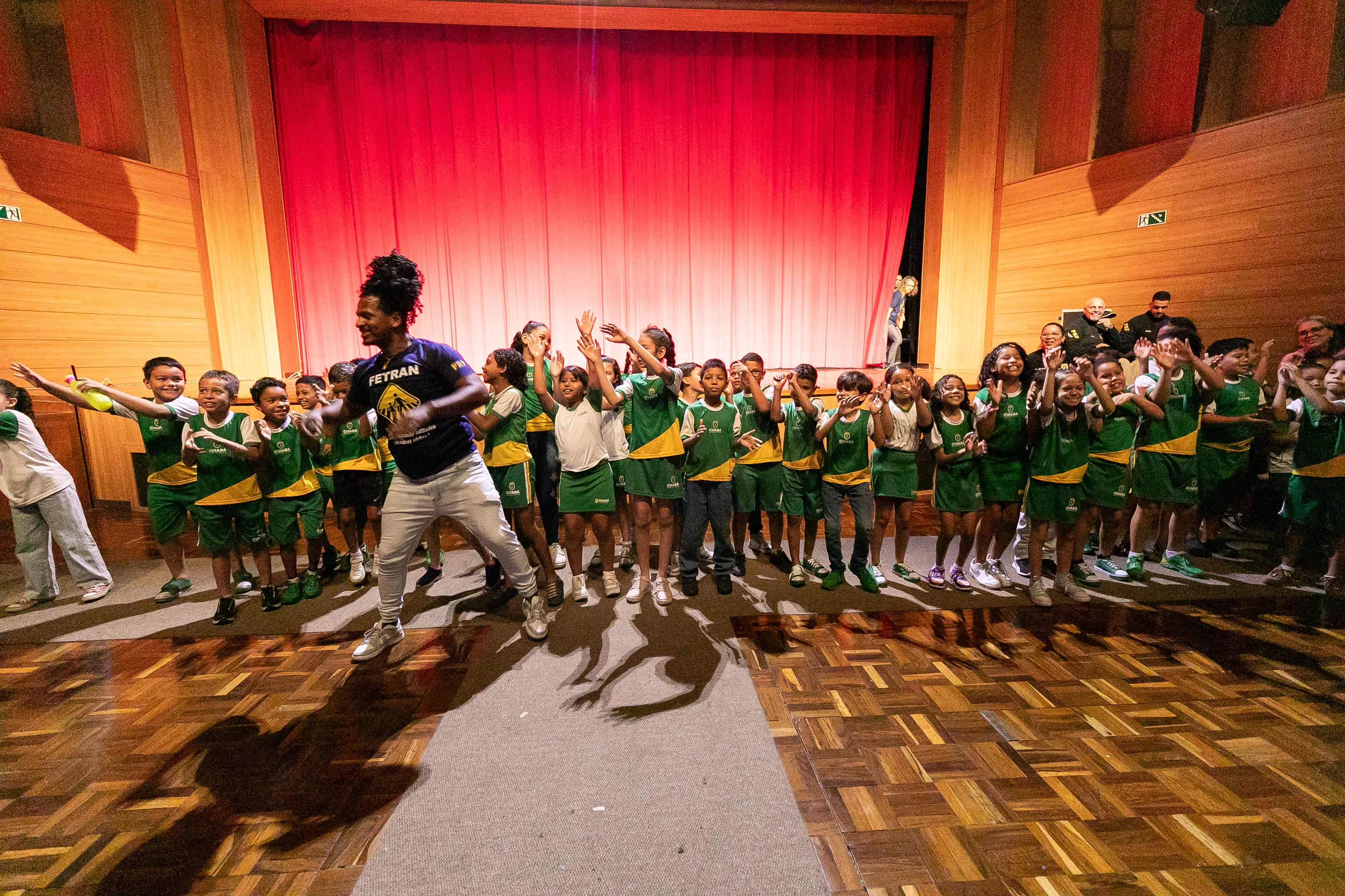 A foto ilustra crianças e adultos em um palco de teatro. Todos estão abraçados e sorridentes. Trata-se de agentes da Polícia Rodoviária Federal (PRF), professores e estudantes da escola municipal Ranulpho Paes de Barros.
