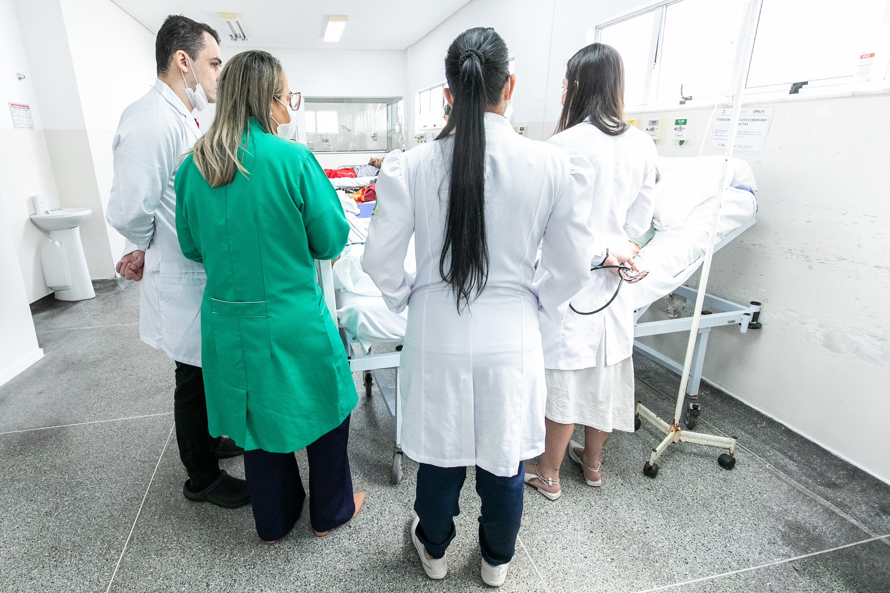 A imagem mostra um grupo de servidores da saúde realizando atendimento a um paciente que está em um leito hospitalar. Várias cores aparecem na imagem, predominando o branco, principalmente nos uniformes dos profissionais.