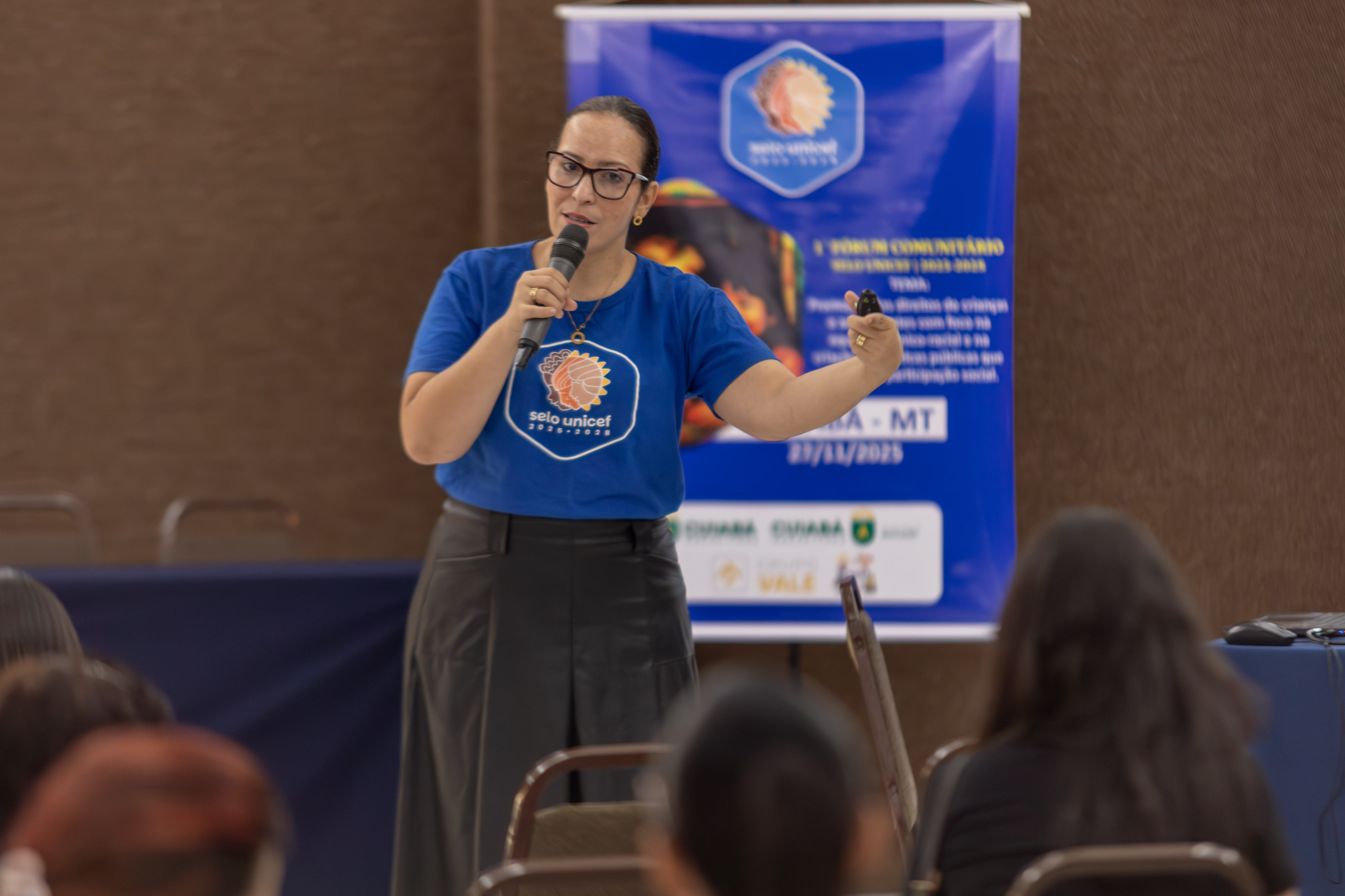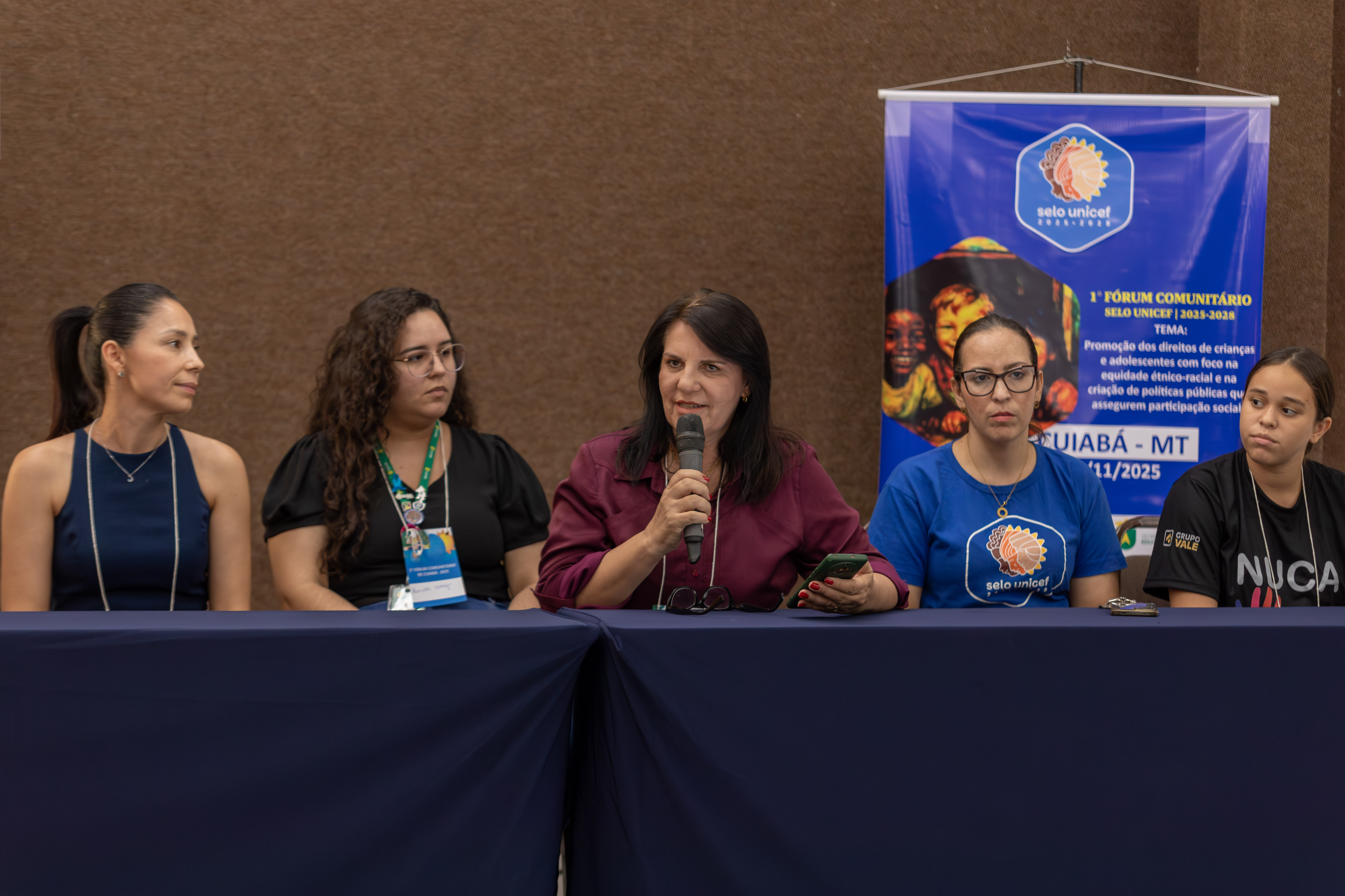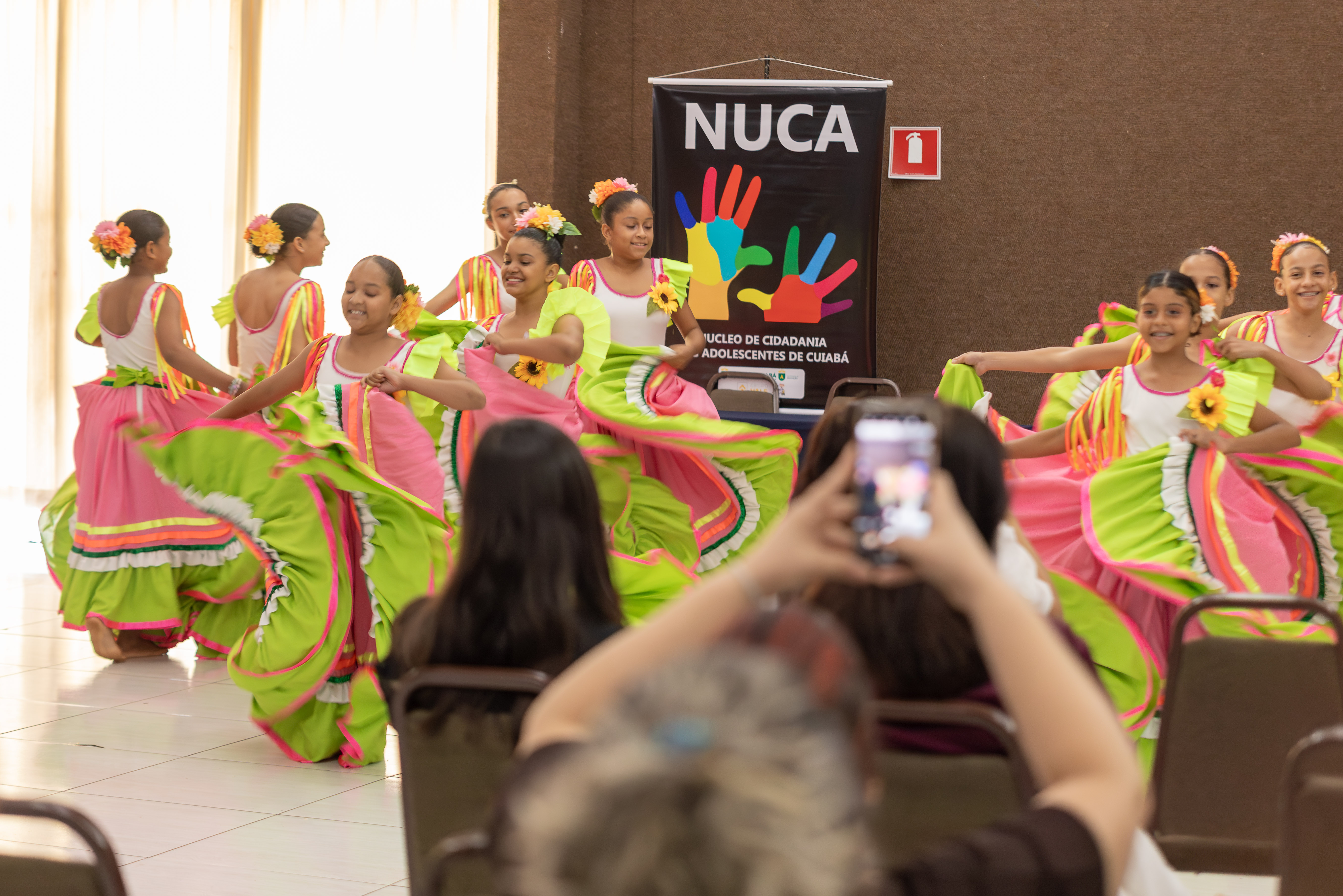 Um dos momentos mais marcantes da tarde foi a participação das adolescentes do Projeto Siminina, que inauguraram o fórum com uma apresentação vibrante de siriri. A dança tradicional mato-grossense simbolizou o protagonismo juvenil buscado pelo Selo UNICEF e deu o tom de acolhimento e identidade cultural ao encontro. As apresentações foram seguidas de falas de mobilizadores, professores, conselheiros tutelares e representantes das secretarias, que ressaltaram a importância da atuação conjunta.