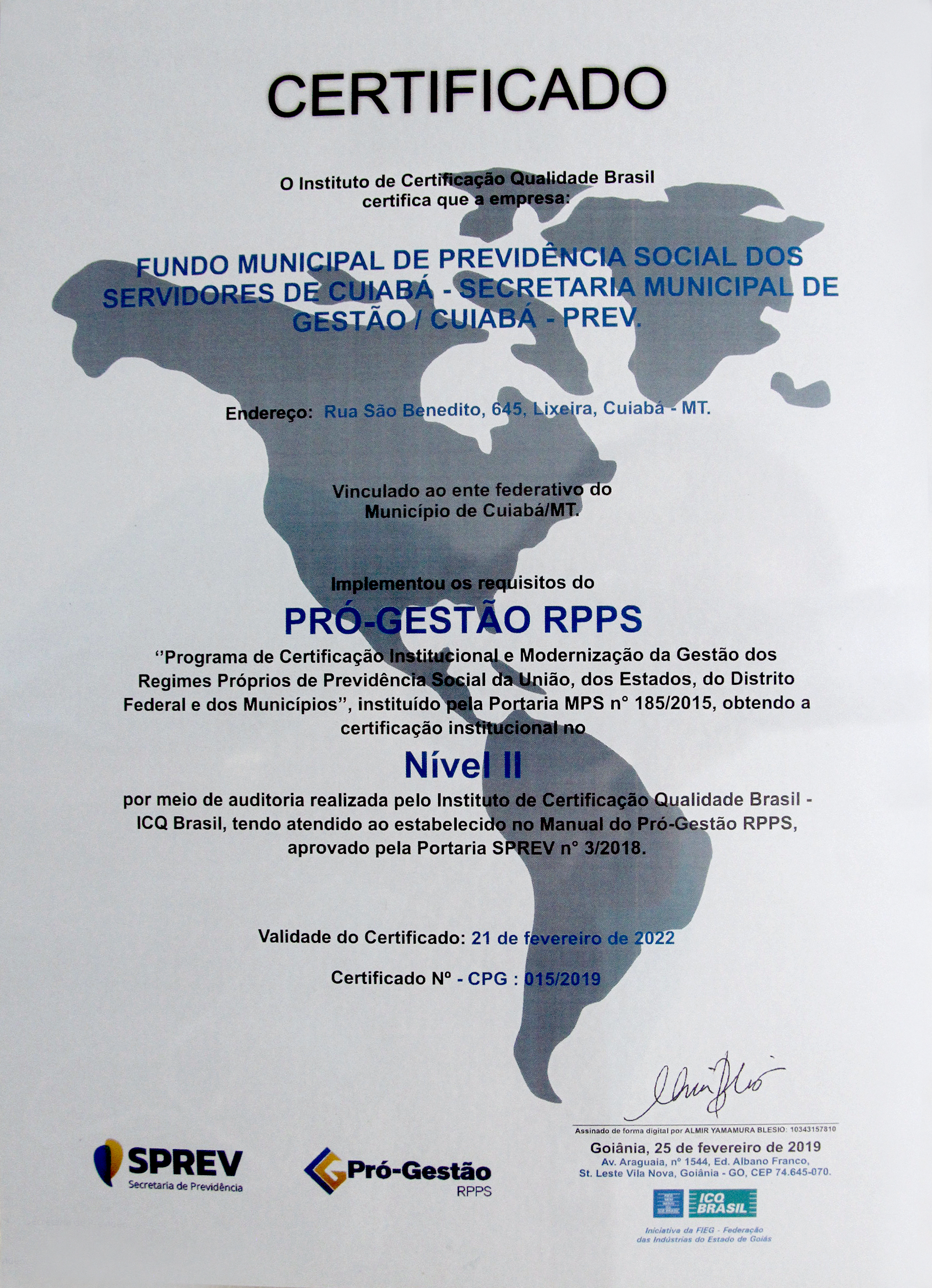 A Secretaria de Previdência Nacional do Ministério da Economia concedeu ao Cuiabá-Prev, o certificado Pró-gestão, destinado à entidades que se destacam por suas práticas de gerenciamento. O documento foi entregue na manhã desta quarta-feira (27), e coloca o órgão em posição de destaque nacional. Isso porque, dentre 2130 Regimes Próprios de Previdência Social (RPPS), ele é o único reconhecido simultaneamente pela Pasta federal e pelos critérios internacionais do ISO 9001.