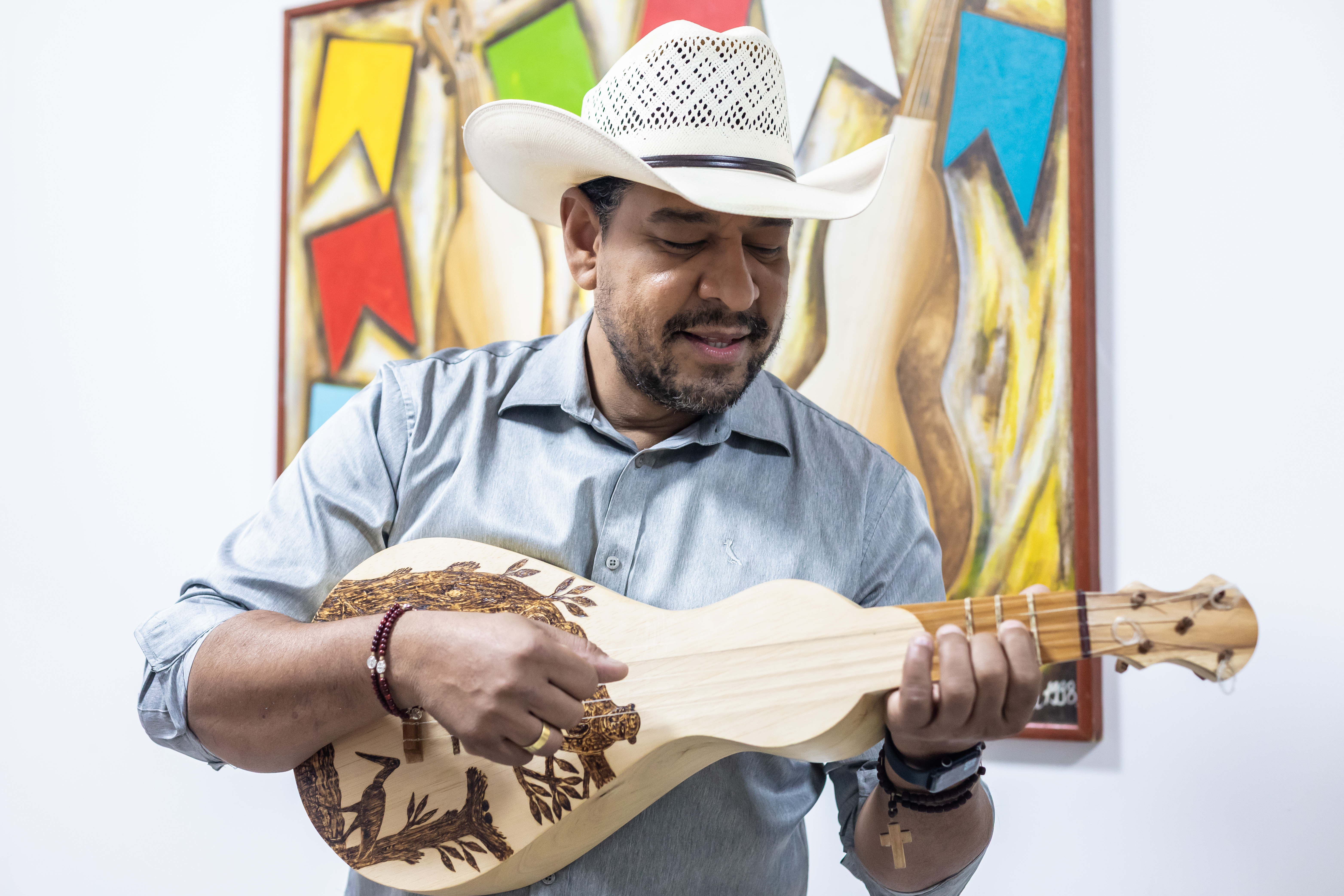 A foto mostra o secretário Johnny Everson em pé, sorridente, dedilhando as cordas de uma viola de cocho. O cenário exibe também a pintura de um quadro com violas de cocho e bandeirinhas coloridas.