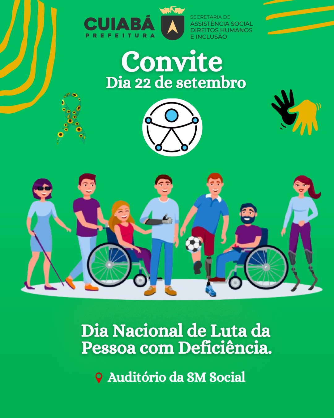 A Prefeitura de Cuiabá, por meio da Secretaria de Assistência Social, Direitos Humanos e Inclusão, realiza no próximo dia 22 de setembro (segunda-feira) um evento especial em referência ao Dia Nacional de Luta da Pessoa com Deficiência. A programação será conduzida pela Secretaria Adjunta de Inclusão e acontecerá no auditório da Secretaria de Assistência Social, reunindo pessoas com deficiência, familiares, autoridades e representantes de entidades da sociedade civil.
