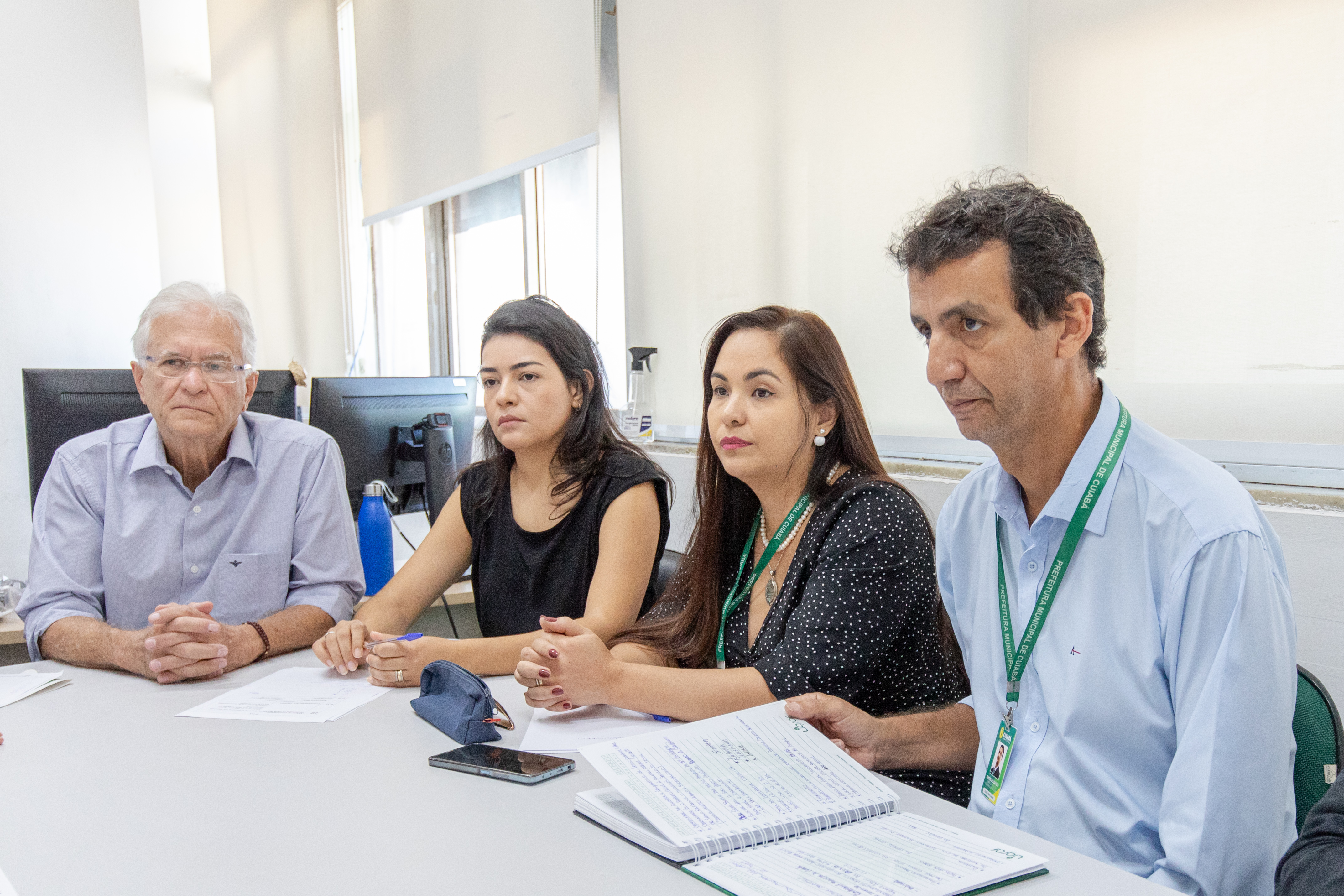 A foto mostra várias pessoas, integrantes da equipe organizadora, ao redor de uma mesa de reunião. Trata-se de uma sala ampla e com boa claridade.