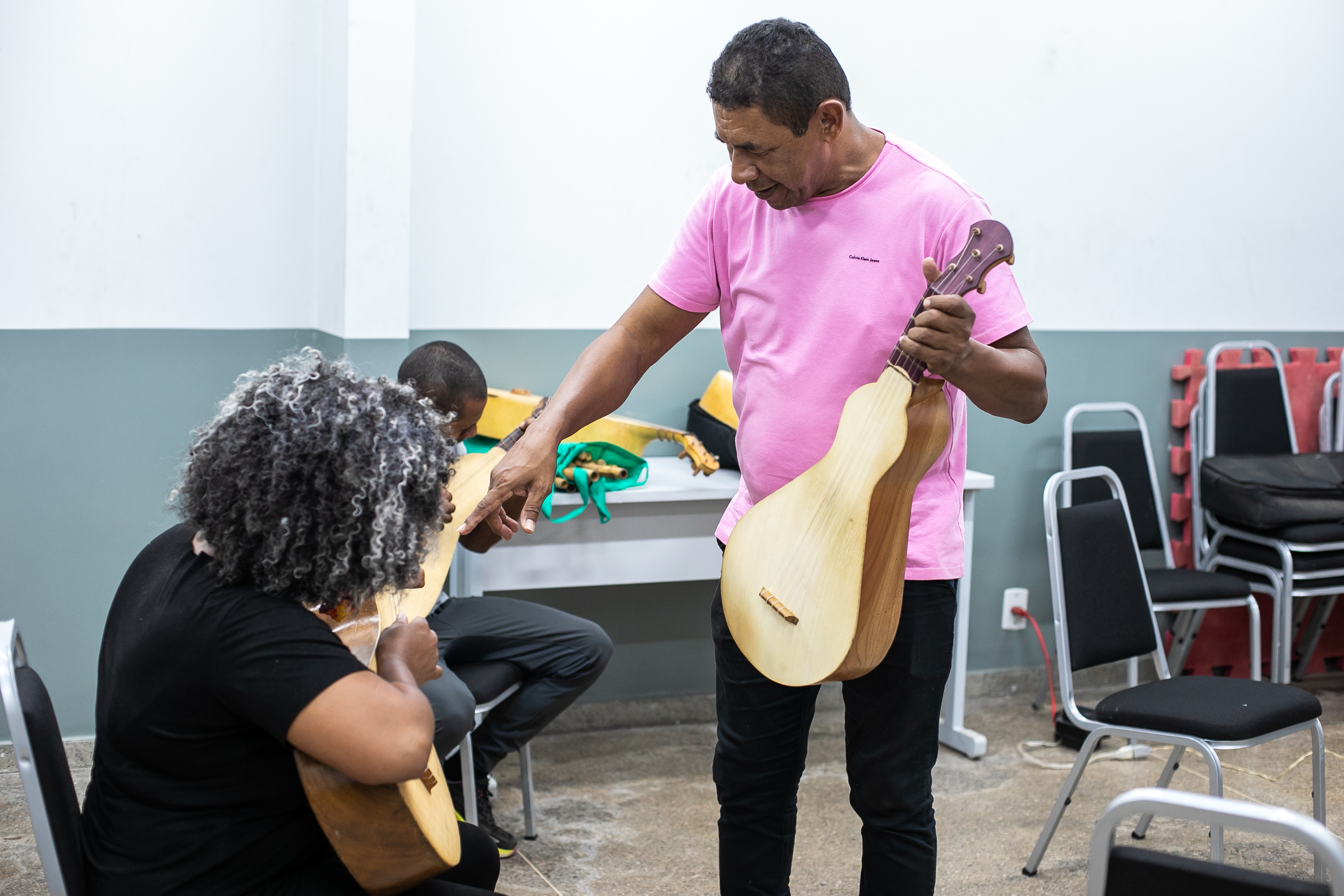 A imagem mostra o momento da aula de viola de cocho, ministrada pelo professor Tomás Flaviano, no Complexo Multiuso Passaredo.