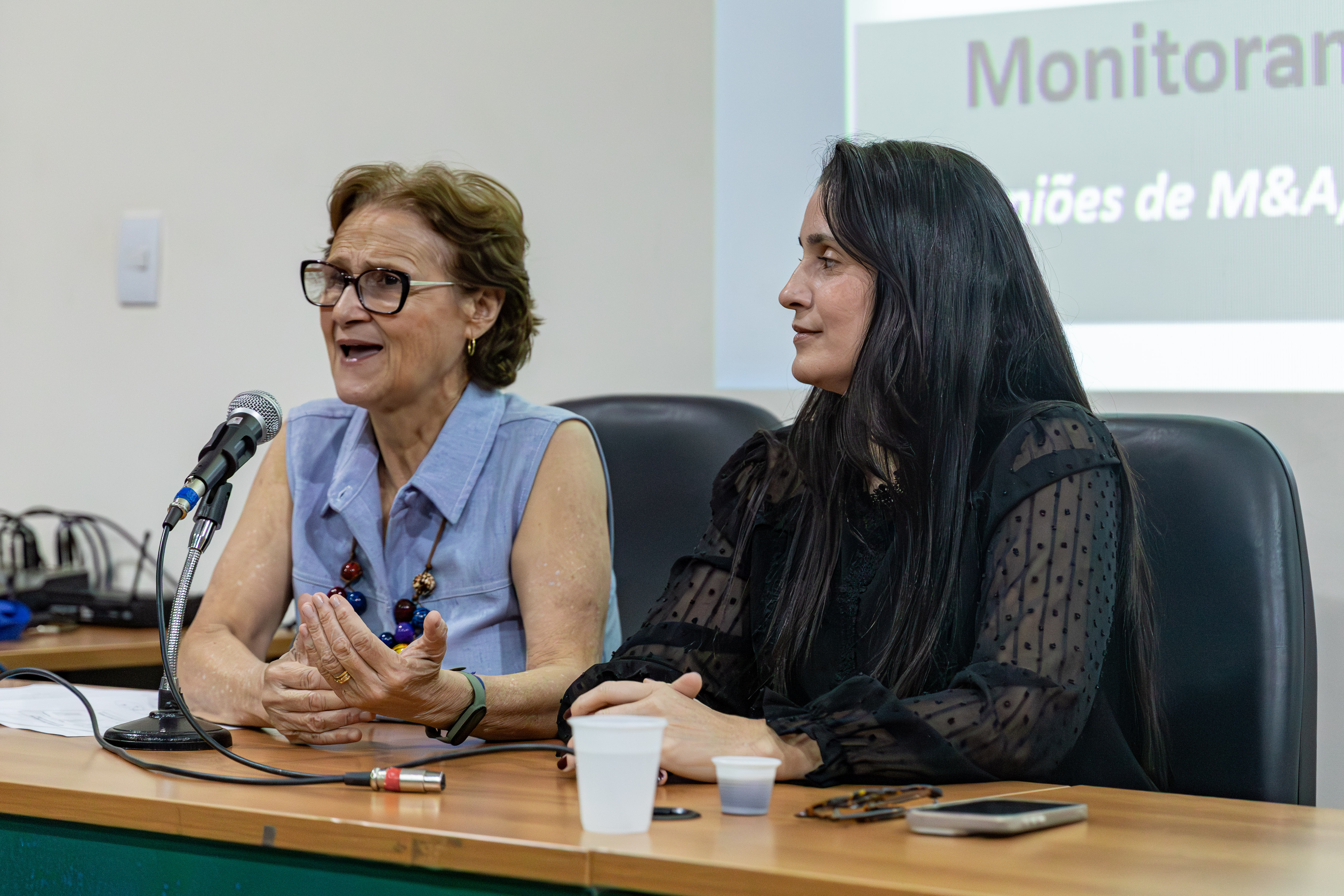 A foto ilustra três mulheres integrantes da Secretaria de Planejamento sentadas em cadeiras individuais apoiadas numa mesa de madeira. No fundo, há uma tela de cor azul com letras brancas em destaque ilustrando às palavras "Reunião Monitoramento & Avaliação.