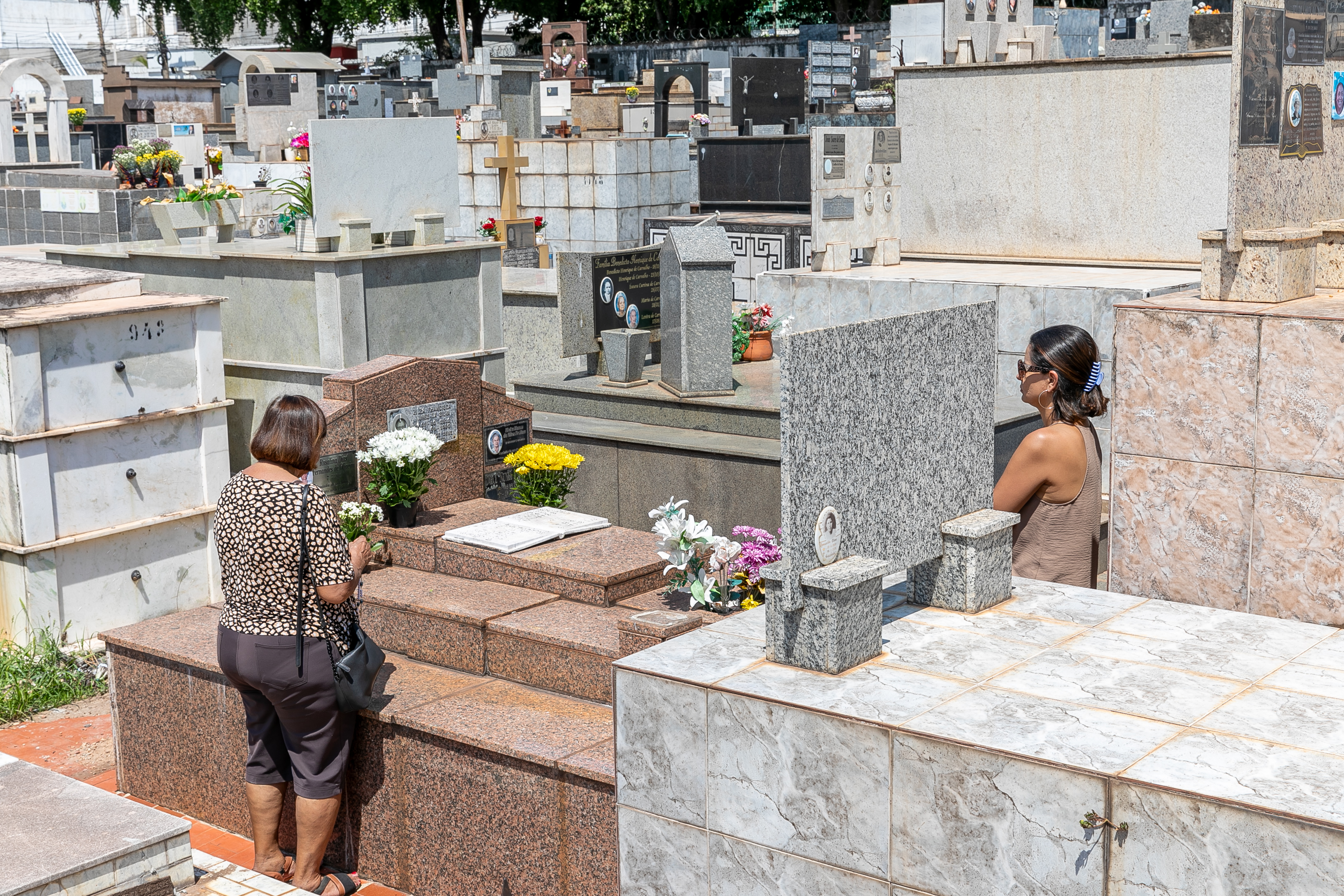 A foto que ilustra o texto mostra familiares em visita ao cemitério. Duas mulheres estão próximas a um túmulo demonstrando estarem em oração. A cena exibe várias lápides.