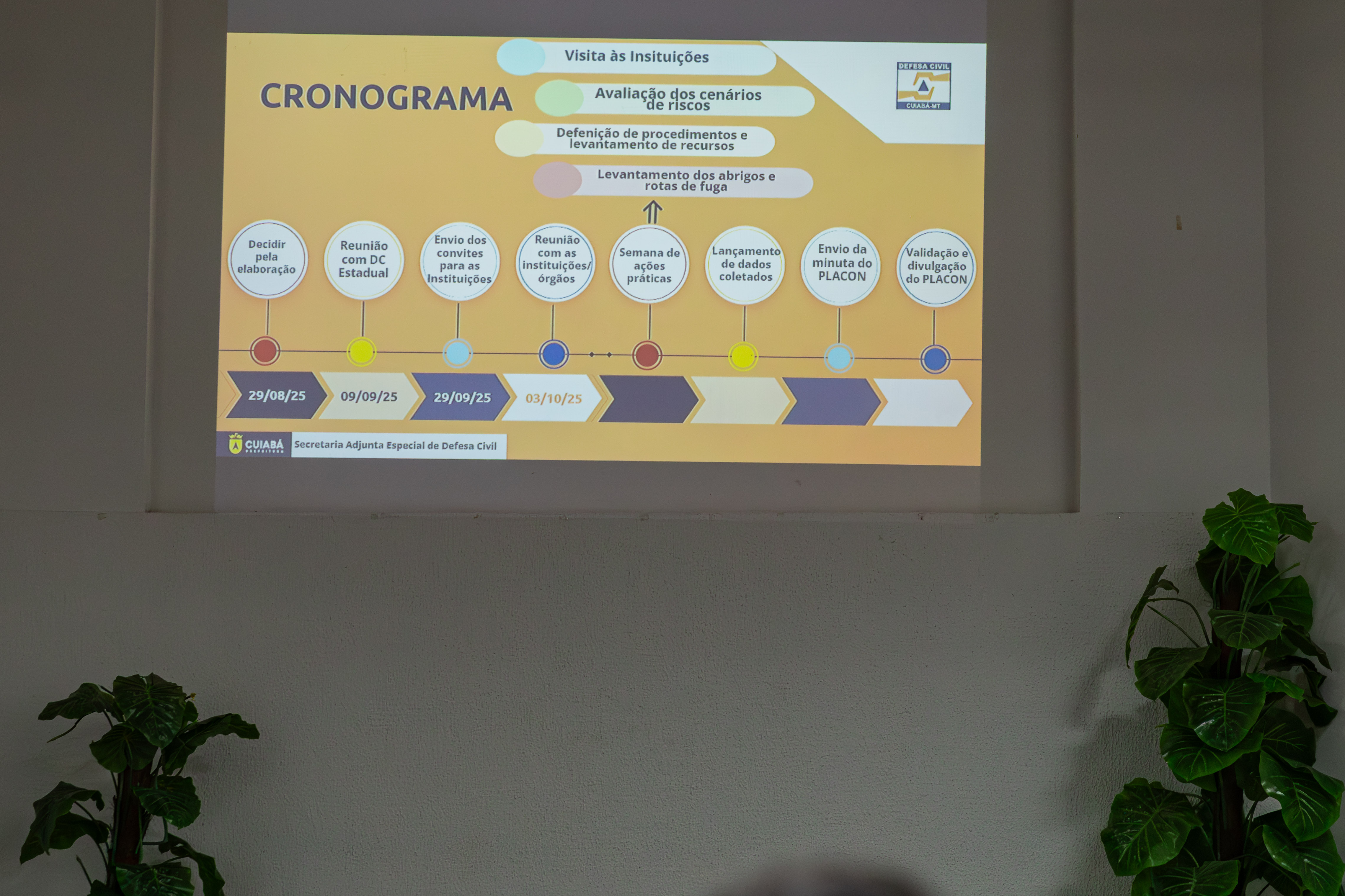 A Prefeitura de Cuiabá, por meio da Defesa Civil Municipal, fez a 1ª Reunião de Elaboração do Plano de Contingência Municipal (PLACON), no auditório da Secretaria Municipal de Educação. O encontro reuniu representantes de secretarias municipais, órgãos estaduais e federais, além de instituições de ensino e forças de segurança, com o objetivo de iniciar a construção coletiva de um documento estratégico para reduzir riscos e preparar a cidade diante de desastres naturais e eventos climáticos extremos.