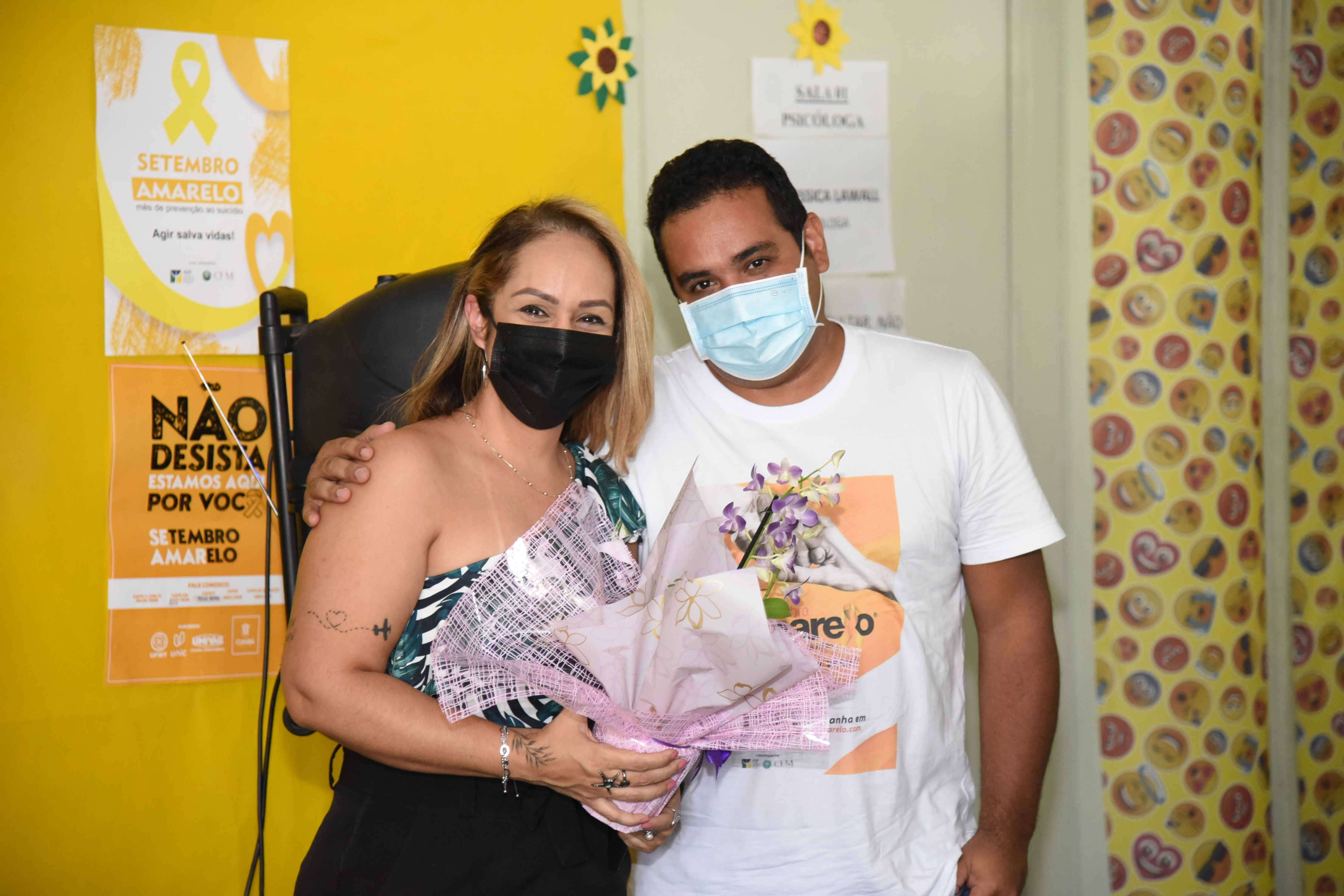Convidada para fazer o encerramento da campanha do Setembro Amarelo na unidade, a cantora Simone Duarte, que também é servidora da Saúde estadual, agraciou os participantes e os convidou a aproveitar o momento das canções para relaxar e se conectar. “A música é curativa. Ela nos conecta uns com os outros, com o nosso Criador. E nessa pandemia a gente viu que a Saúde também está doente e que nós, que estamos na linha de frente ou não, somos afetados por essa correria, por esse volume de demandas que só crescem. Chega a ser injusto a gente ter que estar bem para poder ajudar porque nessa correria a gente ajuda, ajuda, ajuda e, quando a gente volta pra casa e a gente lida com a nossa realidade, poucos nos ajudam”, comentou.